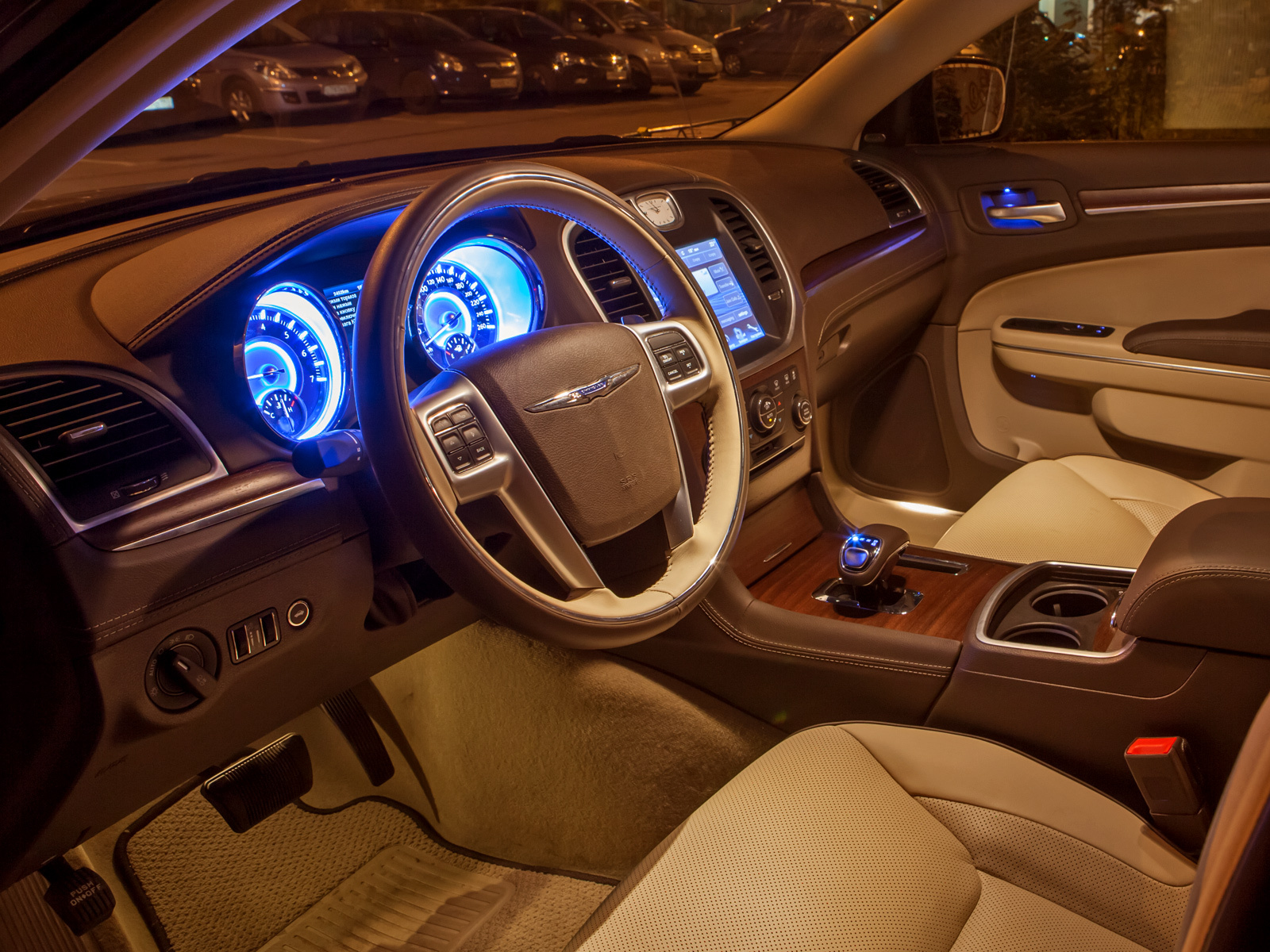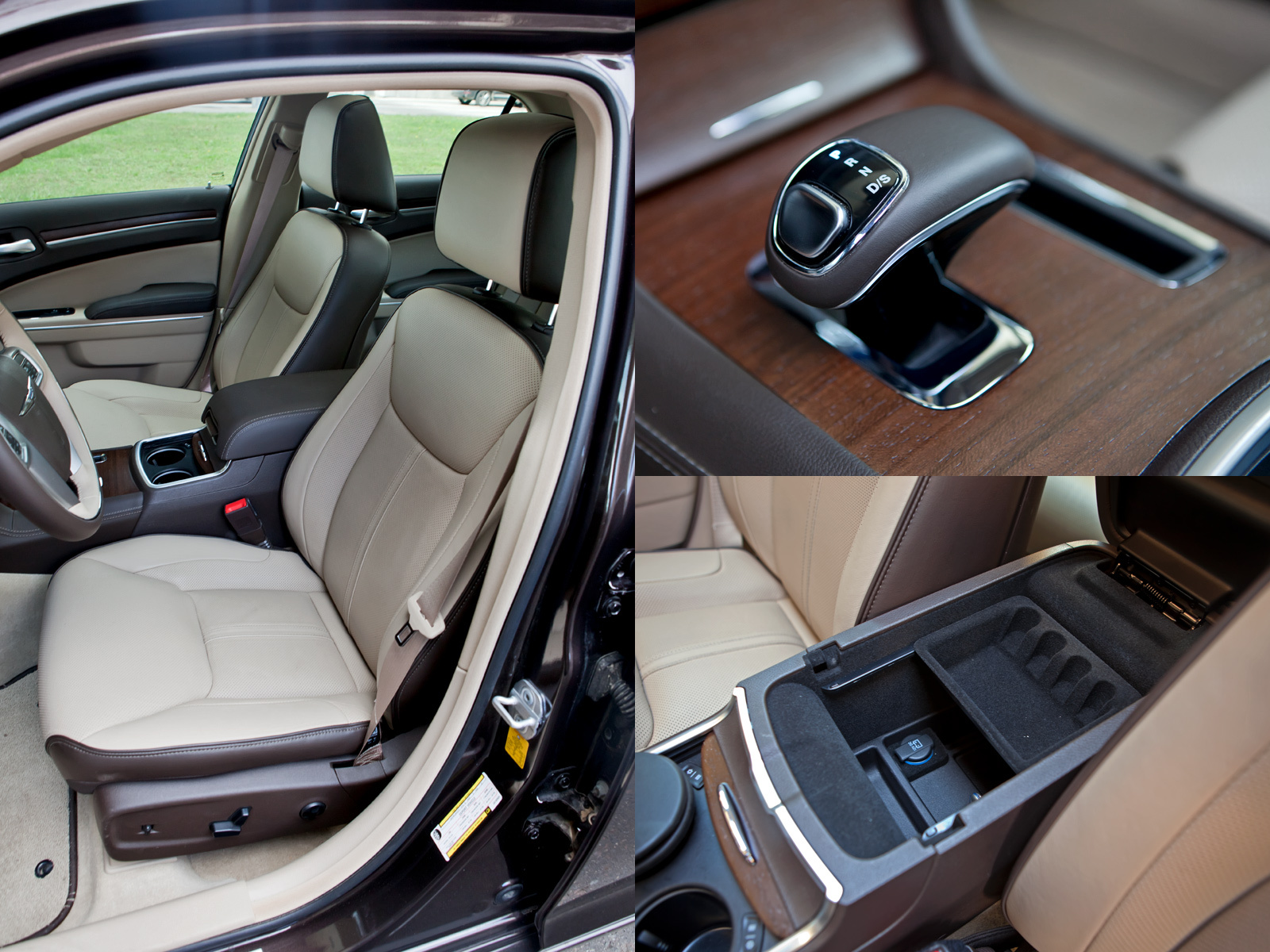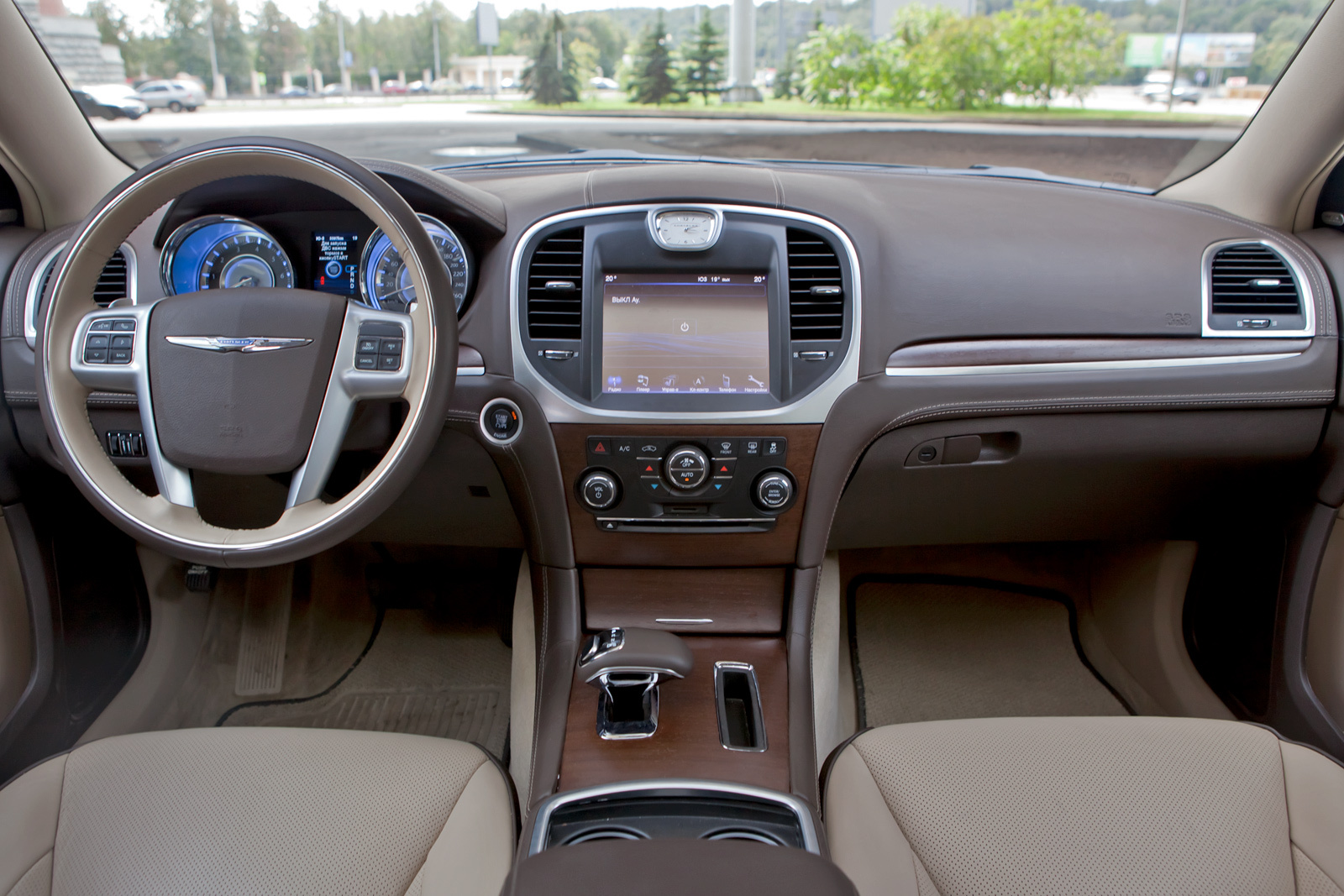 В салоне расклад такой же. Интерьер Крайслера — прорыв для фирмы! Большая часть центральной консоли, верхушки дверных панелей и сиденья затянуты в мягкую кожу, добротные металлизированные вставки, внутренние ручки открывания дверей из металла, отделка бархатом в бардачке и центральном боксе-подлокотнике... А как вам селектор выбора режимов коробки передач, как у Audi A8? Богато, с претензией на премиум-сегмент. Но как обманчиво впечатление! Эйфория спадает, и понимаешь, что это такой приём для маскировки огрехов. А их достаточно — и качество сборки хромает, и дешёвый пластик присутствует.