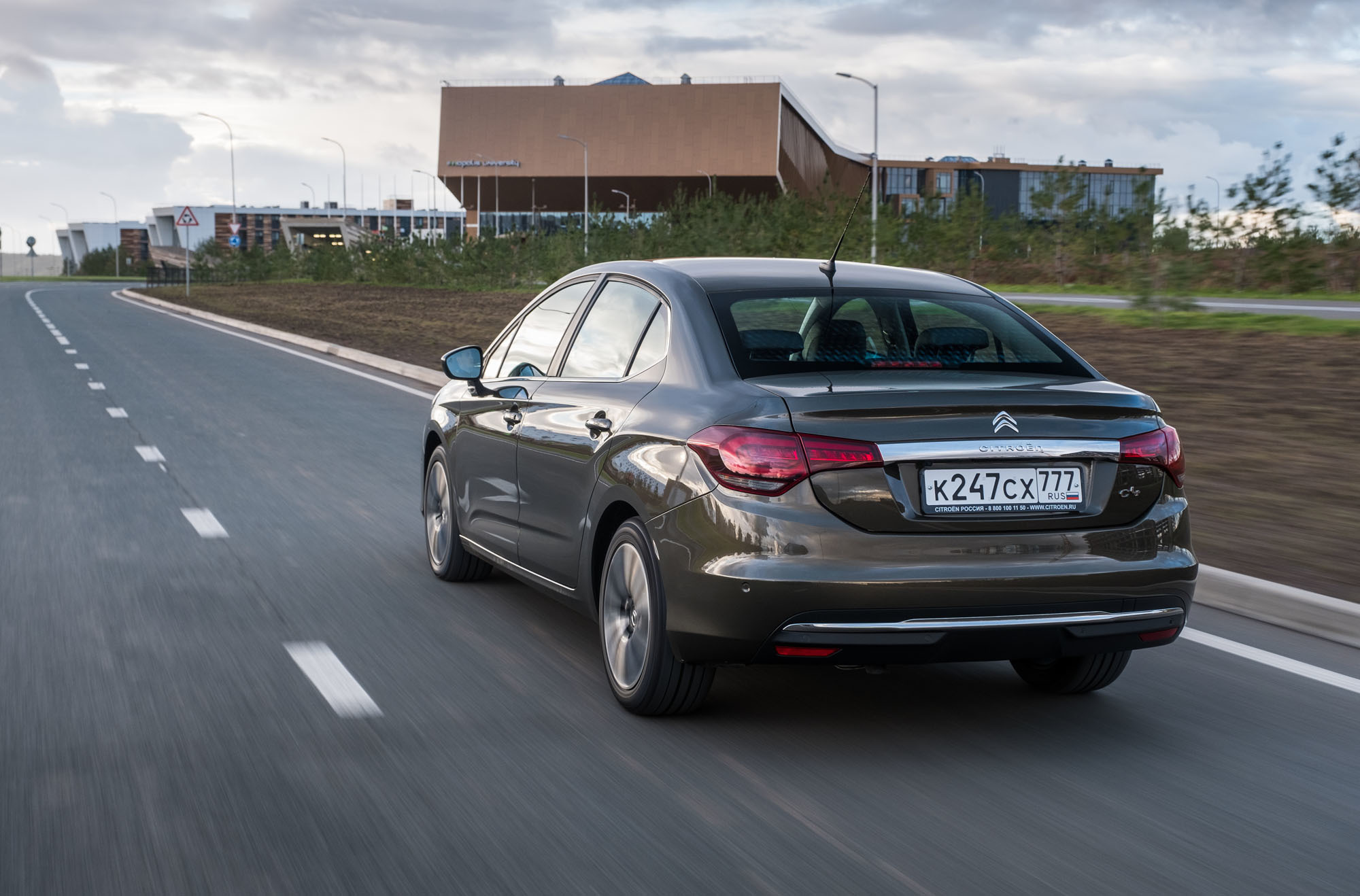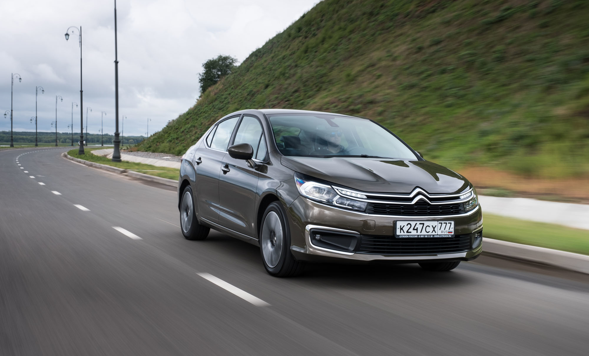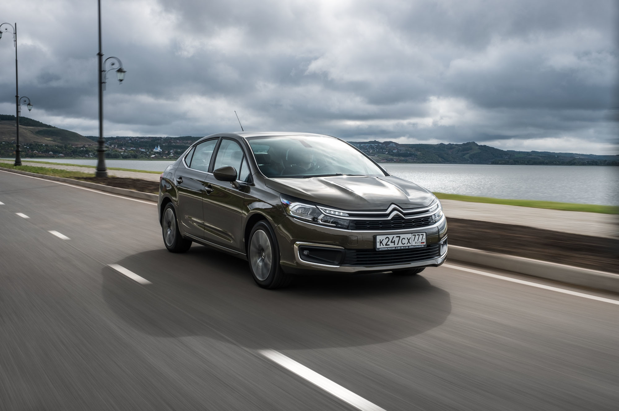 Седан провоцирует, ты волей-неволей едешь быстро. По ощущениям — 80 км/ч, на цифровом спидометре — свыше ста. На хороших дорогах Татарстана, где мы начинаем испытывать машину, превышениям лимитов объявлена война: камеры вычисляют и среднюю скорость, на дежурстве много машин ДПС. Видим, что местные не гоняют, катимся аккуратно, как они. В соседней Чувашии, наоборот, отношение к ограничениям наплевательское. На пустой загородной трассе преодолеваем отметку 170 км/ч, чтобы убедиться — лихачить на Ситроене комфортно. На бездорожье лезть безрассудно, но организаторы настаивают — проложили участочек жидкой земли. Клиренс в 176 мм позволяет сохранить передний бампер.