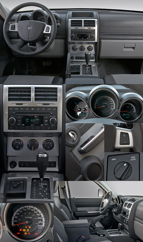 Впрочем, удобно устроиться за рулём дешёвые материалы отделки совсем не мешают. Жаль только, что в Nitro нет регулировки рулевой колонки по вылету — при моих 190 сантиметрах она не помешала бы. Вся сигнально-информационная гирлянда огней находится на дне трёх колодцев, которые образуют приборный щиток. Выуживать из них данные о текущем состоянии автомобиля можно, в противовес известной поговорке, без труда — информативность блестящая и читается всё одним махом. Да и обзорность с высоты — на высоте.