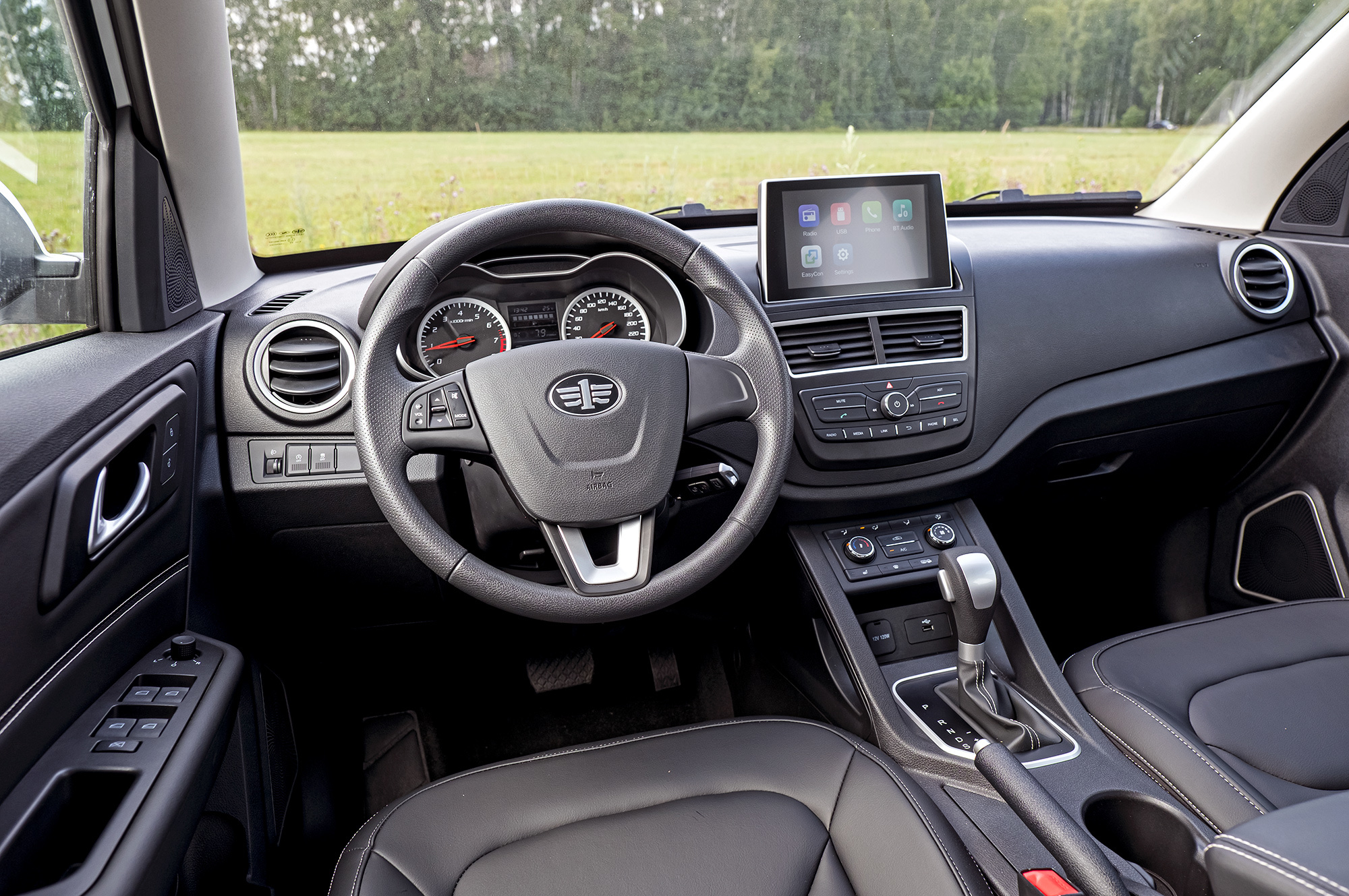 Geely и Haval отделаны богаче, а FAW в лучшем случае располагается где-то между Каптюром и Кретой. Отстаёт от лучших соотечественников и эргономически. В кресле с короткой подушкой восседаешь очень высоко, отлогий руль с неудобным ободом хочется радикально выдвинуть на себя, хотя куцая регулировка есть только по вертикали. Подножка под левую ногу расположена слишком близко и запрокинута вперёд… А как можно было сделать стойки лобового стекла вытянутыми в сечении не в сторону водителя, а поперёк линии взгляда, чтобы сделать обзорность плохонькой, даже несмотря на большие зеркала?
