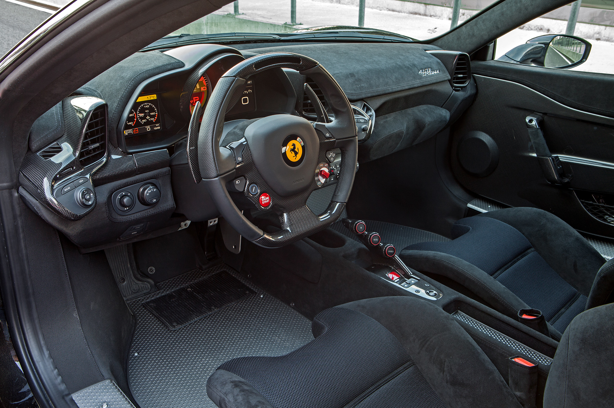 Реакции на подачу топлива чрезвычайно чисты. Характерно для «атмосферника» приёмистость в пределах одной передачи зависит от оборотов: чем они выше, тем живее отклик. Распредвалы злее, чем у Италии, и в идеале коленвал надо раскручивать до предельных девяти тысяч — там пик мощности и вообще самая жара. Но в Speciale меньше 1400 кг, и V8 4.5 с углепластиковыми ресиверами тянет, как говорят музыканты, с любой строчки. Звук грубее, но ты прямо спиной ощущаешь, что выпуск свободнее и отдача легче.