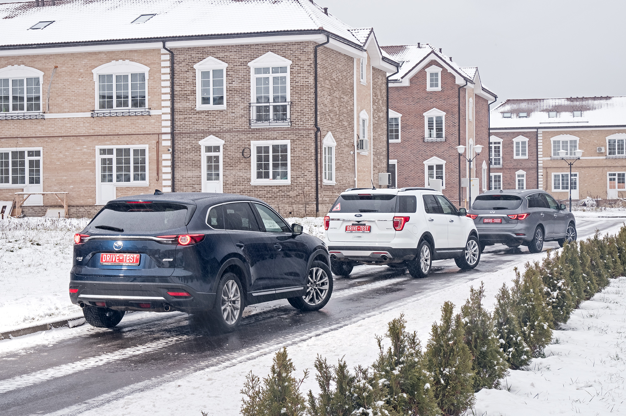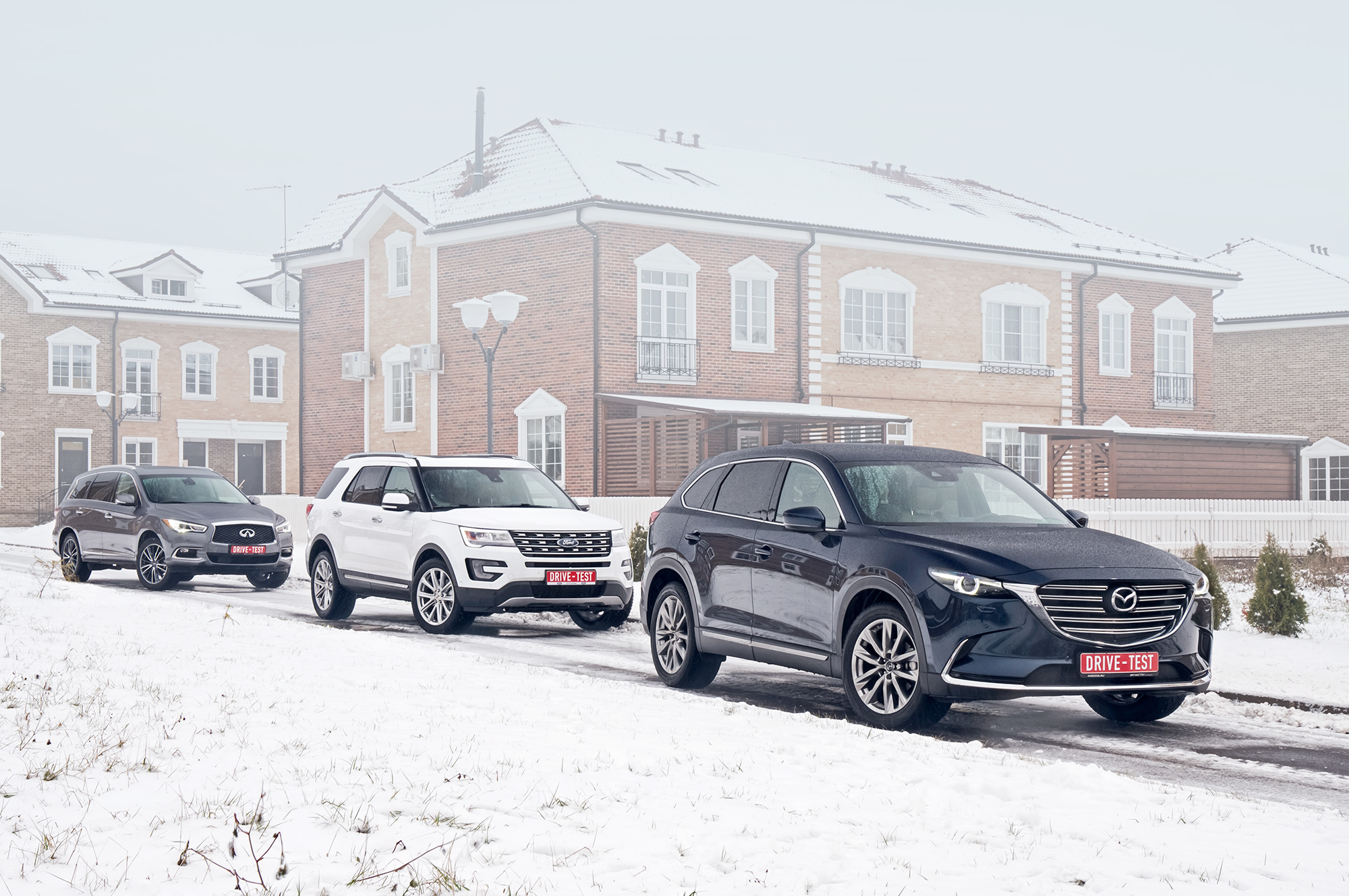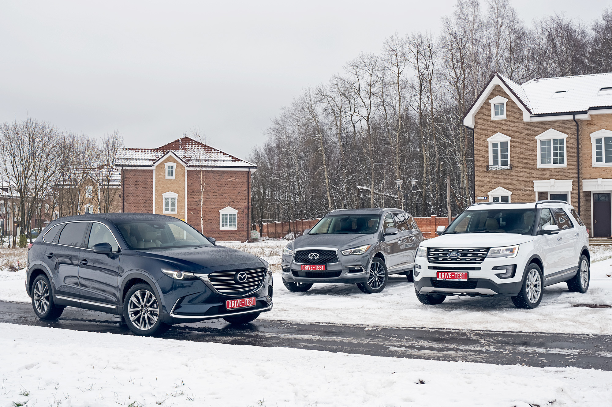 От такого тяжёлого Форда не ждёшь прыти в сугробах. Но достаточно найти трансмиссионной шайбой режимы «Снег» или «Грязь» и нажать на газ. Explorer не жадничает с оборотами и бодро выползает из ловушки, эффективно подтормаживая буксующие колёса. Infiniti вне дорог сдерживает вариатор. Коробка не даёт мотору раскрутиться и осложняет управление тягой. Скромнее всех, несмотря на приличный клиренс, выглядит Mazda. Имитация межколёсных блокировок будто не работает вовсе. На СХ-9 лучше держаться поближе к асфальту.