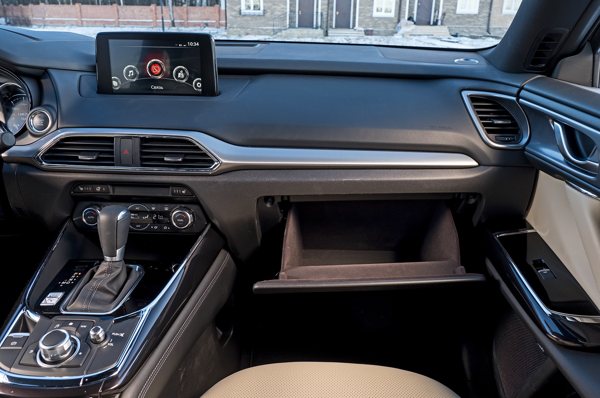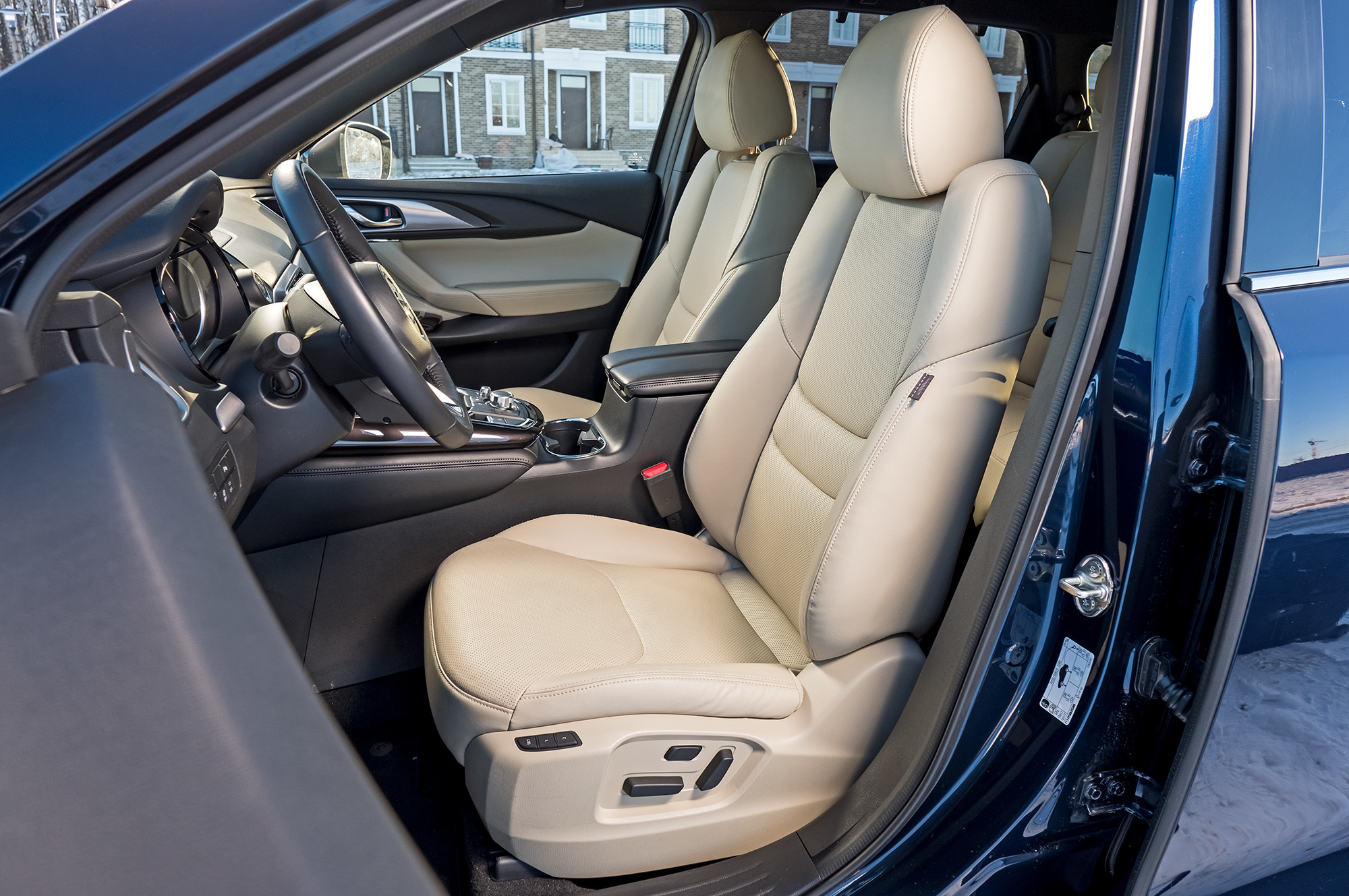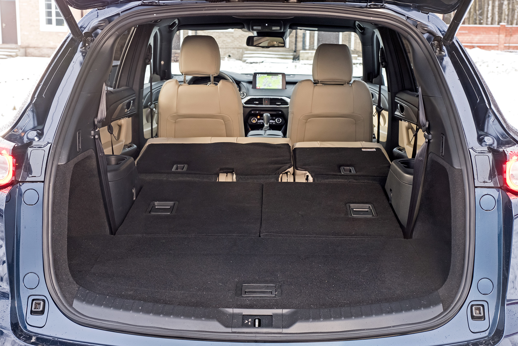 Всем трём машинам хорошо бы заменить кнопки бесключевого доступа на датчики и добавить их в задние двери. Всё-таки в крупный кроссовер не всегда садятся сначала вперёд. Забираясь в Мазду, нужно преодолеть высокий и широкий порог (неспроста американский краш-тест с малым перекрытием отработан на отлично с обеих сторон). Главное: CX-9 не создаёт ощущения большой машины — интерьер не по-американски облегает. В плотном кресле не развалишься, коленки в стороны не раскинешь — узковато. Зато передние стойки умеренной толщины почти не мешают обзору. Получилась слегка увеличенная копия СХ-5. Хотя в деталях флагман изящнее.