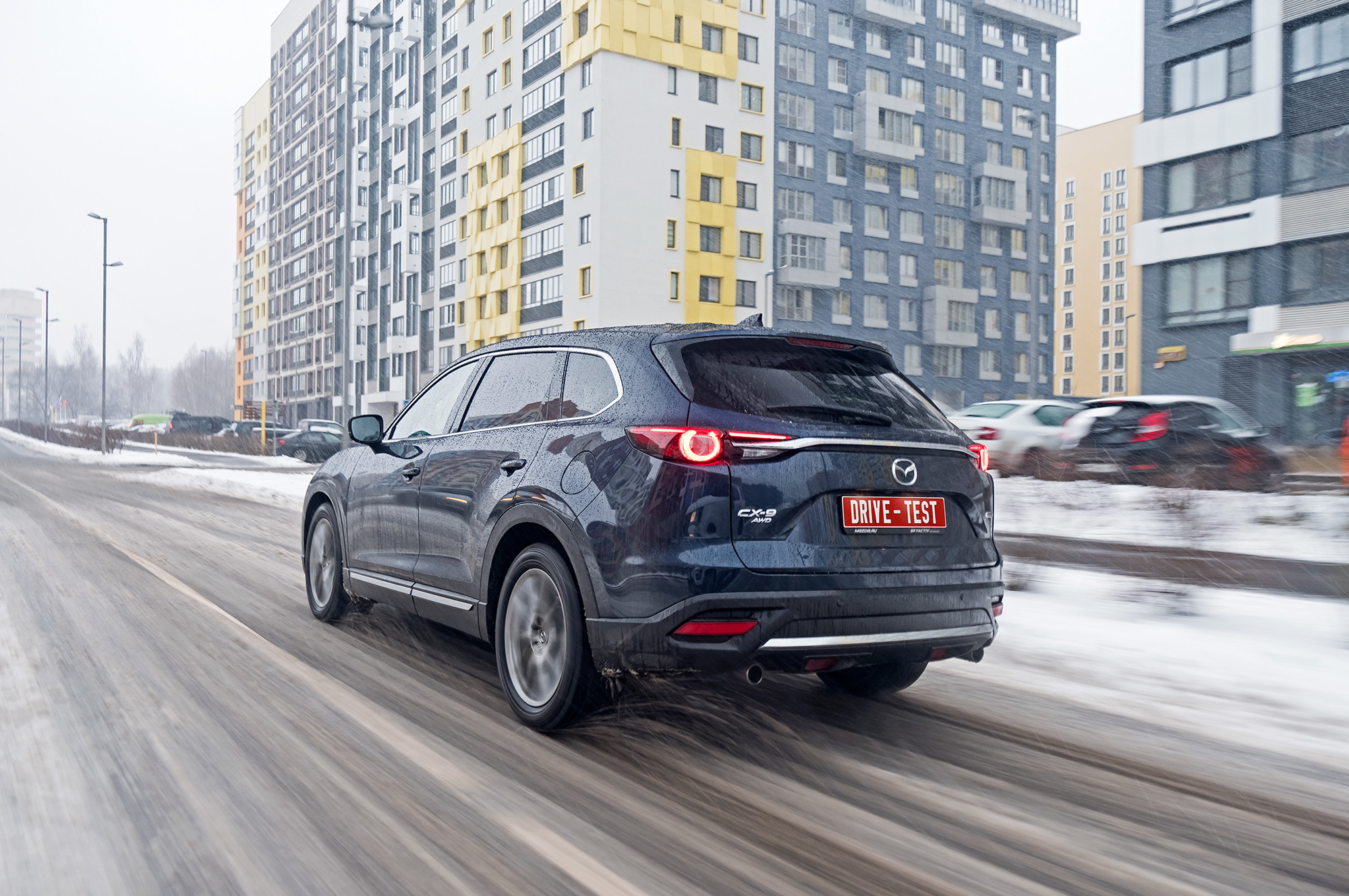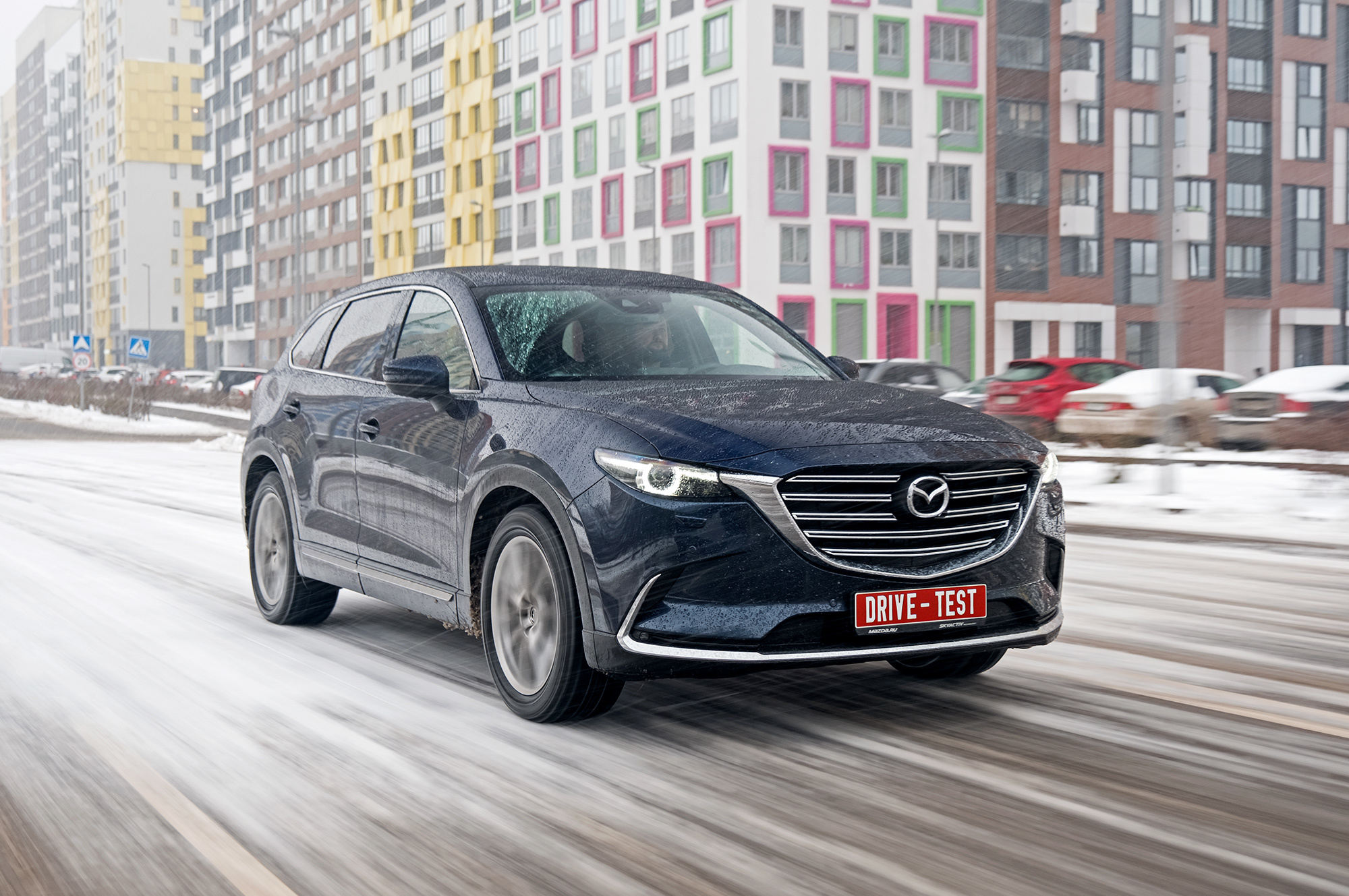 С первых метров Mazda на нешипованных шинах обманчиво комфортна. Она усыпляет внимание бархатным ходом по щербатому асфальту и тишиной в салоне. На моей памяти это вообще первая Mazda, в которой действительно не шумно. Обрадовавшись, спокойно едешь по стыкам и люкам, и вдруг — ба-бах! Лежачий полицейский. Присидевшись, понимаешь, что по ровной дороге CX-9 едет плотно и не умеет разглаживать короткую волну. На разбитых участках снова переходишь на шаг, иначе больно и машине, и пассажирам. Может, «девятка» зажигает в поворотах?