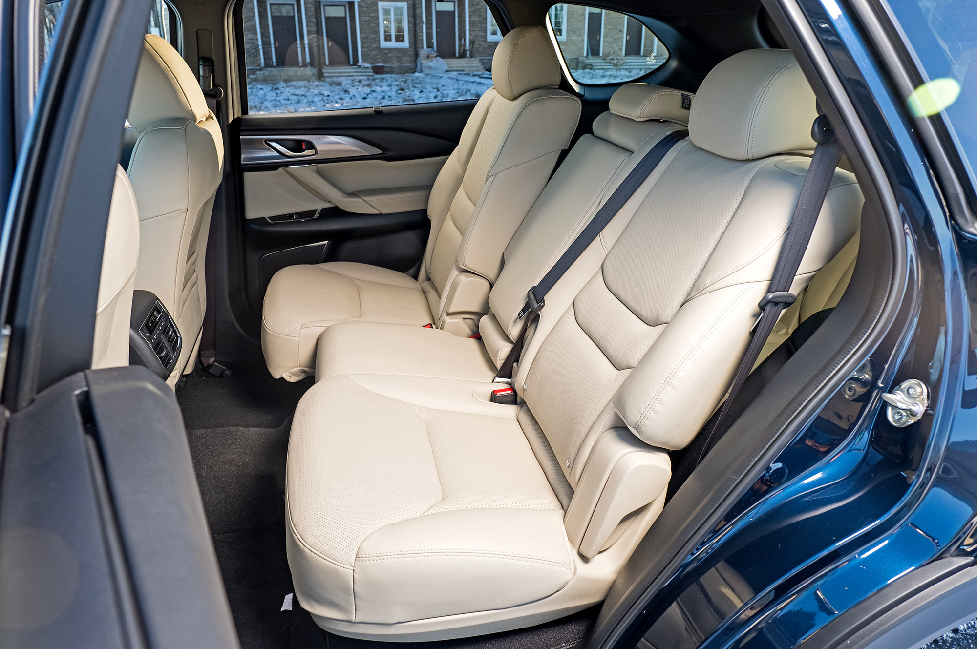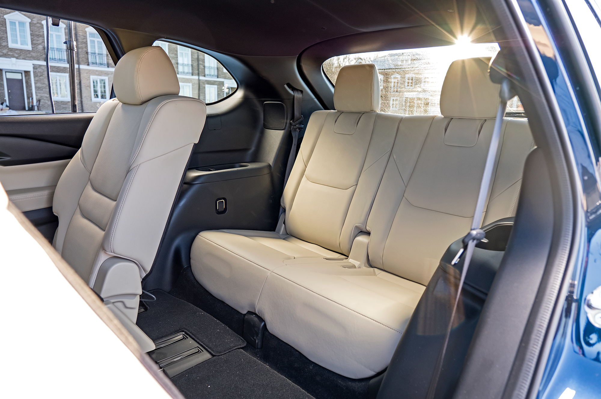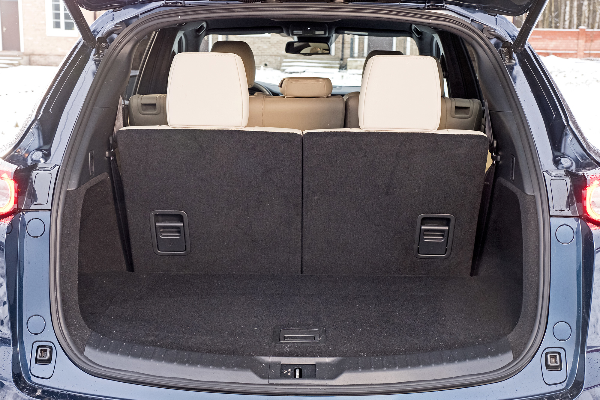 Mazda впечатляет малышню светодиодными плафонами. Запас пространства в длину при отодвинутом назад диване ― примерно как в Infiniti. Обзорность благодаря высокой подушке отличная. На третьем ряду нет Изофиксов, но штатными ремнями разрешено крепить кресла вплоть до третьей группы (22-36 кг). Сиденья второго ряда при этом придётся двигать вперёд сантиметров на 10–15, иначе детям тесно. Это недостаток всей троицы: для многодетной семьи, несмотря на размеры, семиместные кроссоверы тесноваты.