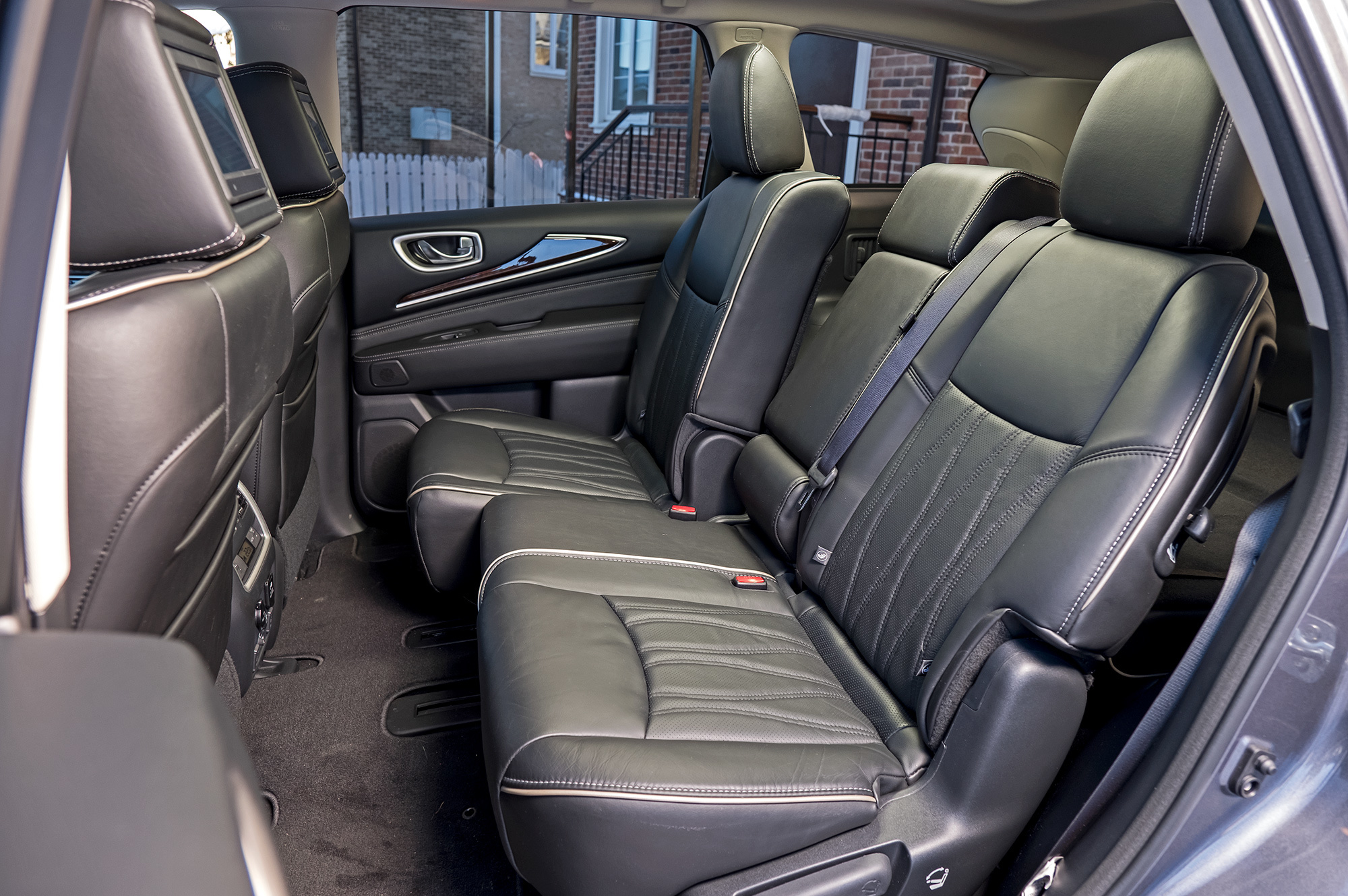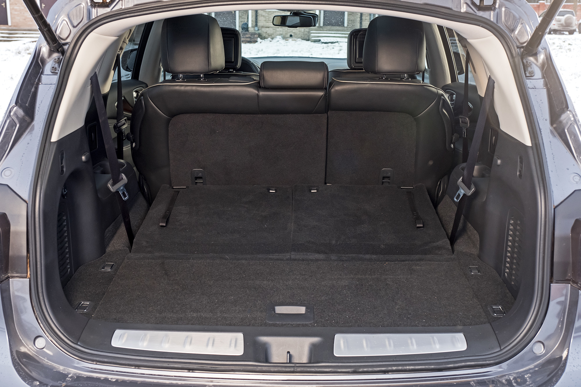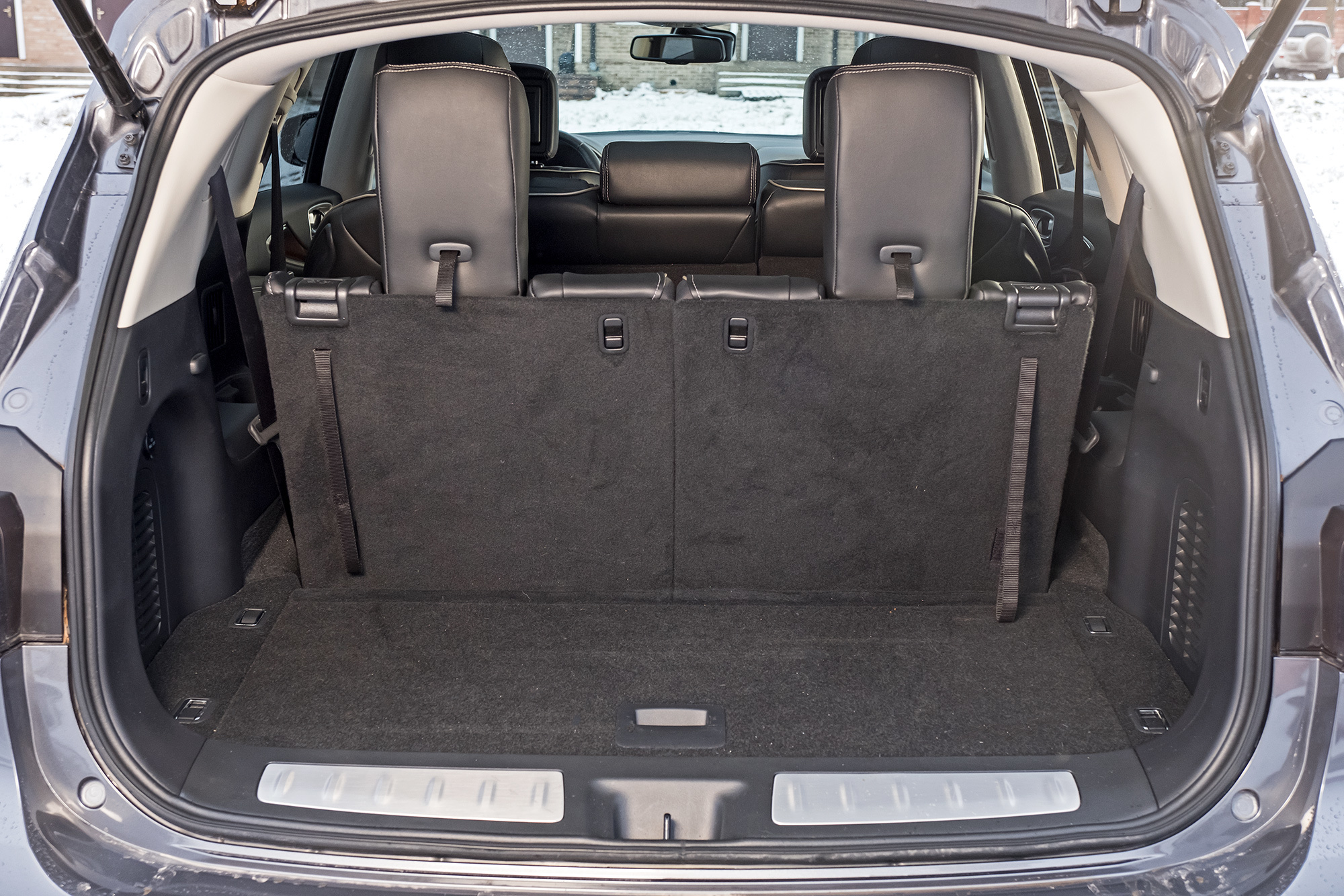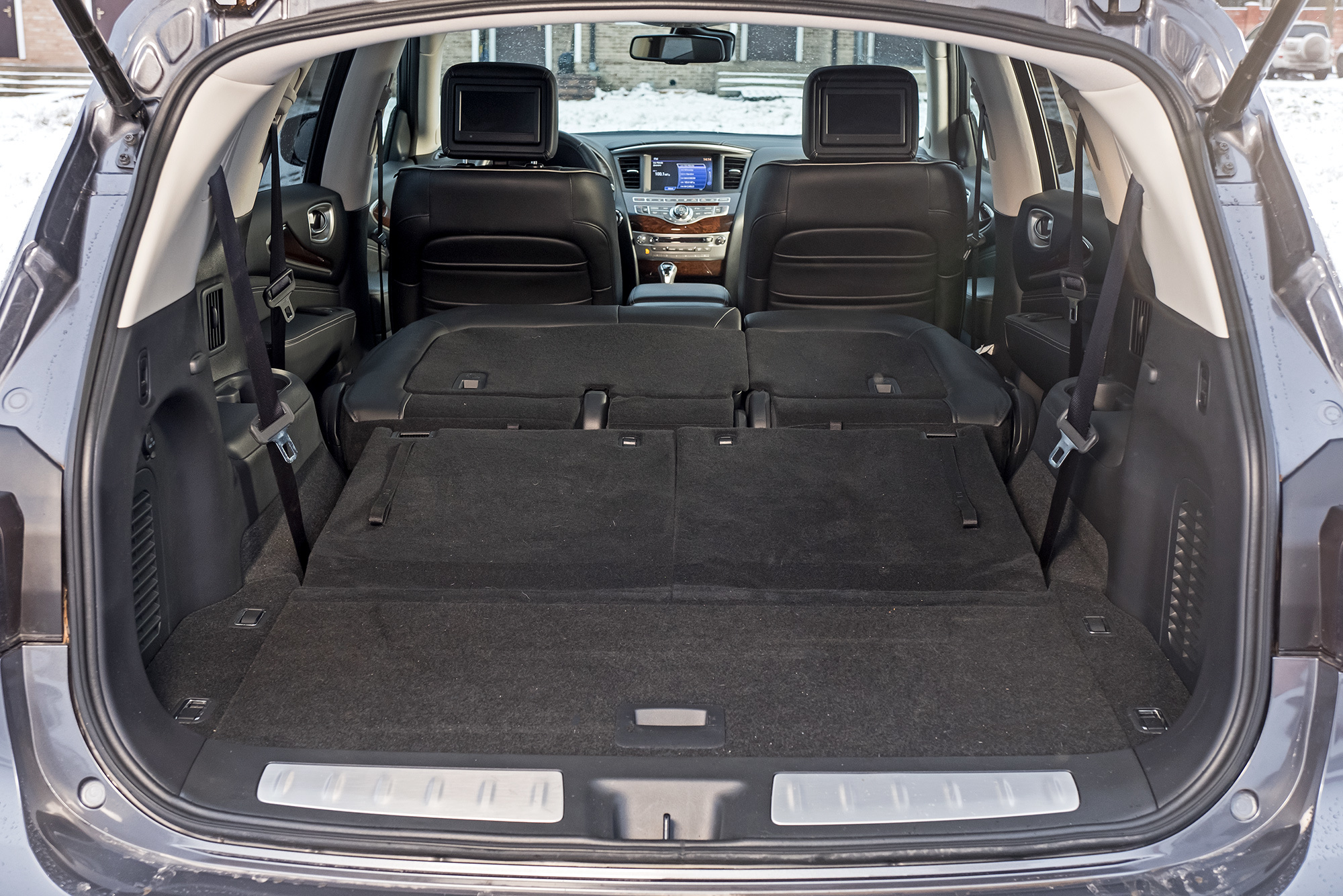 Запас места между рядами в QX60 не позволяет детям колотить ногами в спинки передних сидений. Но крепления Isofix (на двух крайних местах второго ряда, как в CX-9) раздвинуты нешироко. Запрет крепить любые детские кресла на сиденьях третьего ряда, содержащийся в инструкции, вероятно связан с безопасностью при наезде сзади. Детям нравится раскачивающийся QX60 ― засыпают почти мгновенно. До мультиков на встроенных мониторах дело не дошло, поскольку видеофайлы формата avi медиасистема не принимает ― скачал три или четыре, но не заработал ни один.