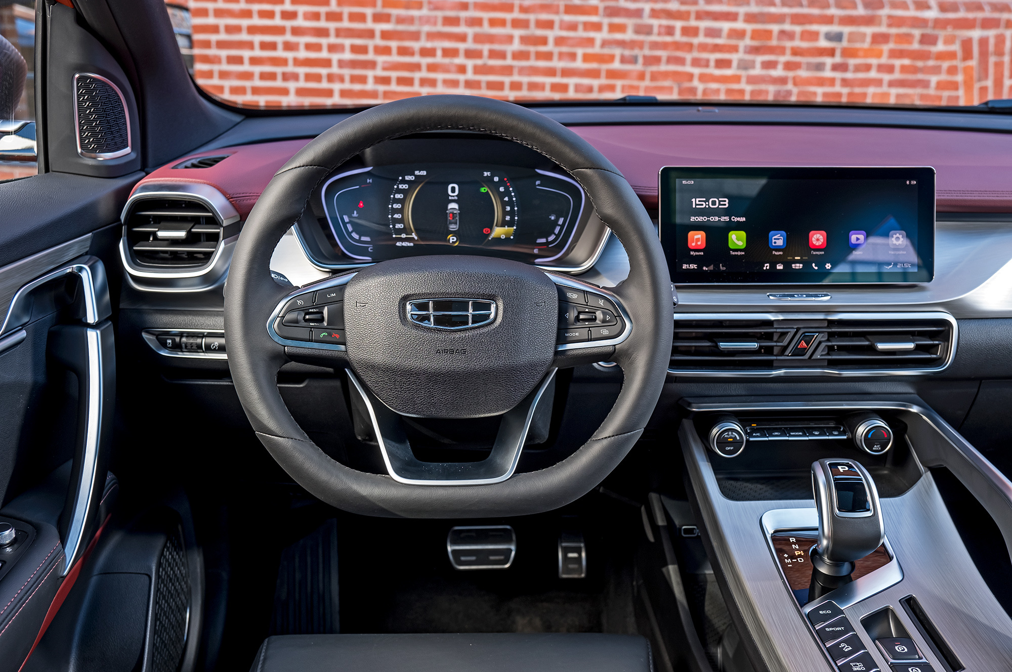 Ну что, сложилась картинка? И вот теперь смотрим на Coolray. Он оставлен на сладкое, если говорить о стильном кузове, не намекающем на китайские корни. Интерьер превосходит Kia (не говоря уж о Шкоде) и дизайном, и качеством материалов. Трогаю, разглядываю кнопочки и клавиши — они не разочаровывают. Подрулевые переключатели от Volvo срабатывают дорого. Электронный щиток а-ля Volvo же ― вообще уникальное предложение: у более дорогих конкурентов такая опция не предусмотрена. Широченный экран медиасистемы ярок, контрастен и отлично русифицирован. Шрифты бы покрупнее: высота многих надписей составляет несколько миллиметров.