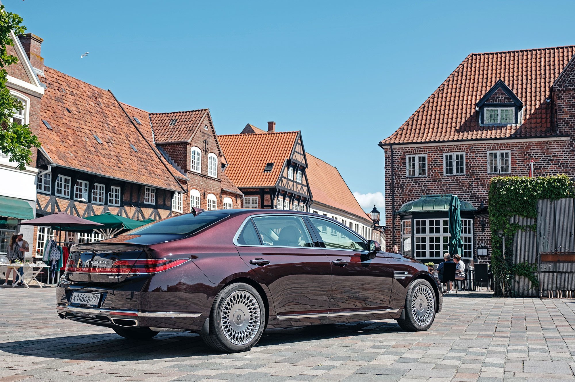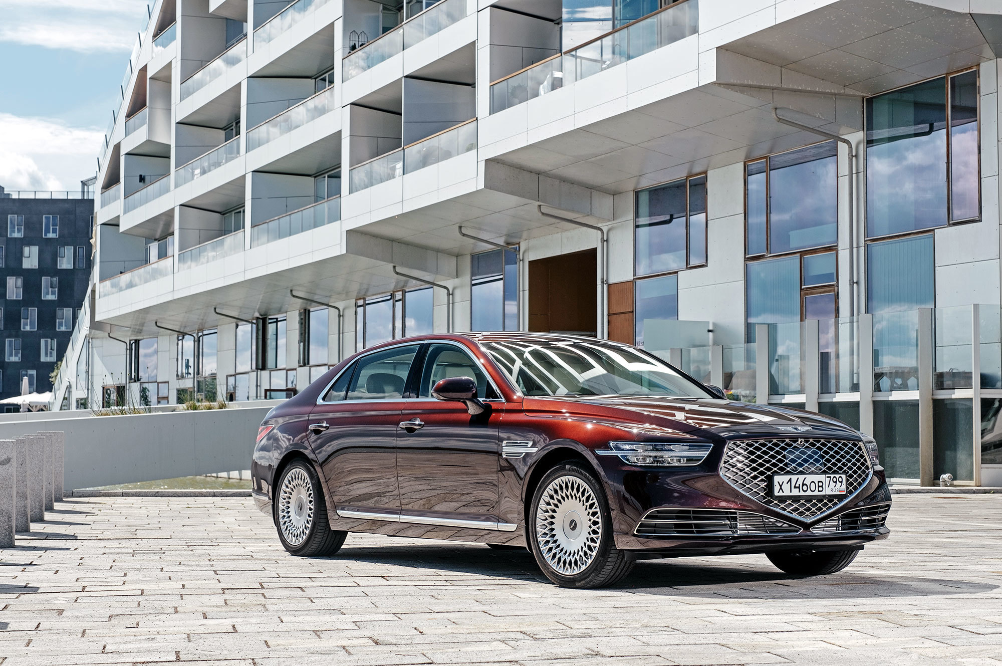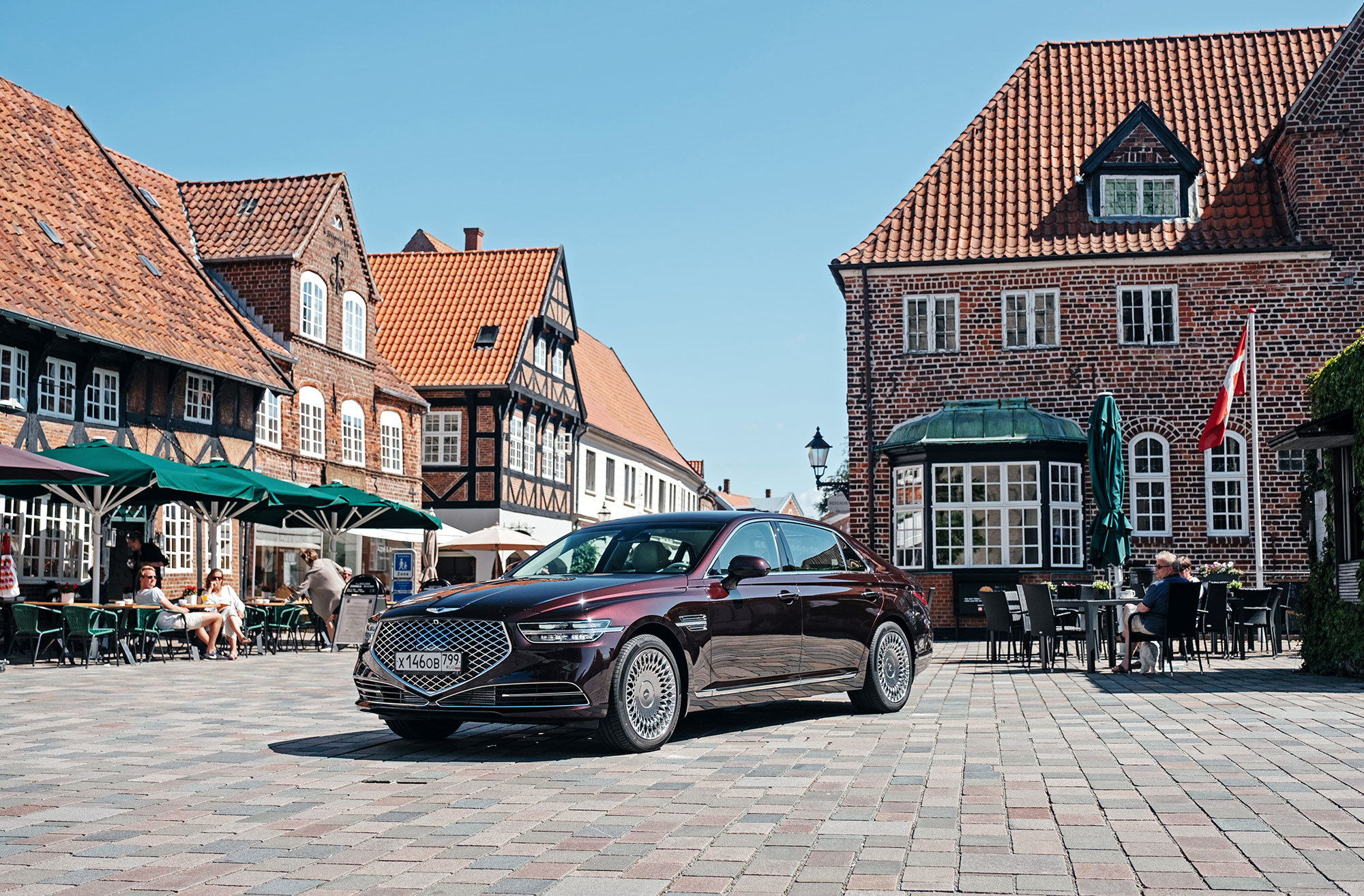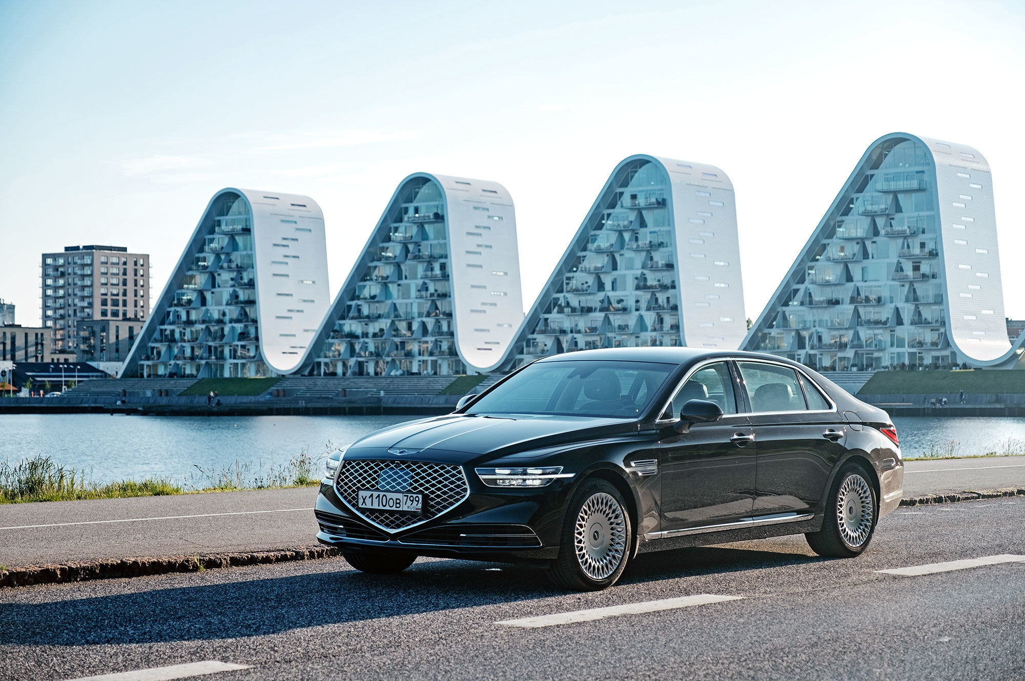 Тест-драйв проходит в Дании со стартом из Копенгагена, жители которого всем средствам передвижения предпочитают велосипед. Они взирают с любопытством на неуместный и неуклюжий в предлагаемых обстоятельствах седан, вымахавший далеко за пять метров. В Европе корейская премиум-марка не представлена и неизвестна. Тут всё одно: что Genesis с российскими номерами, что лимузин Путина.