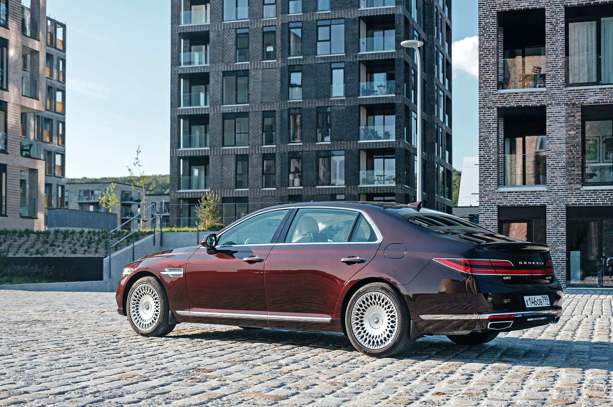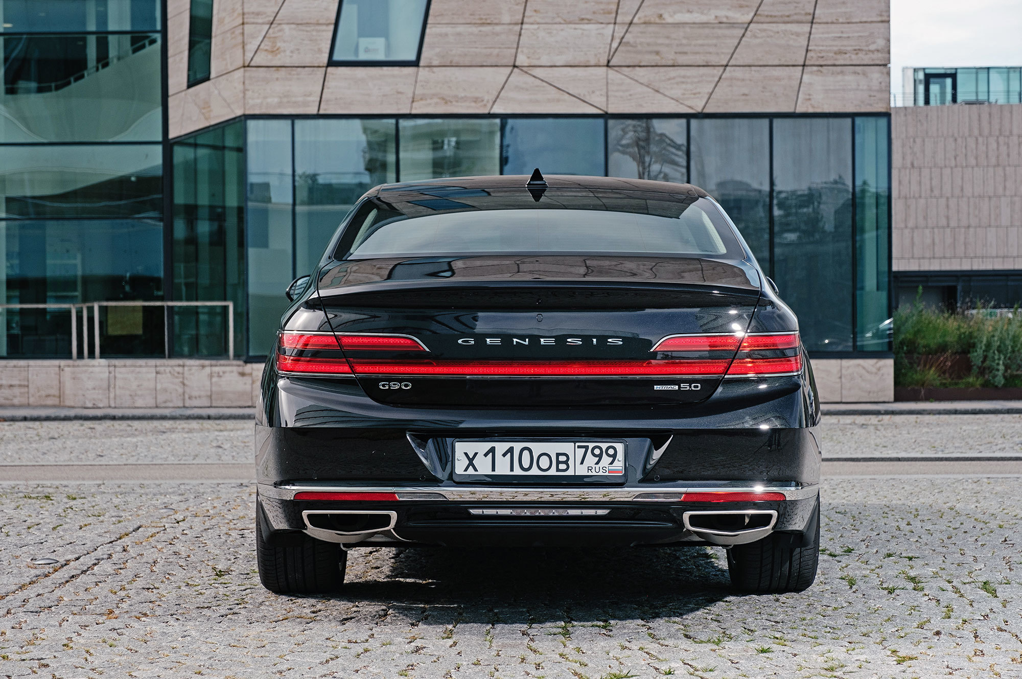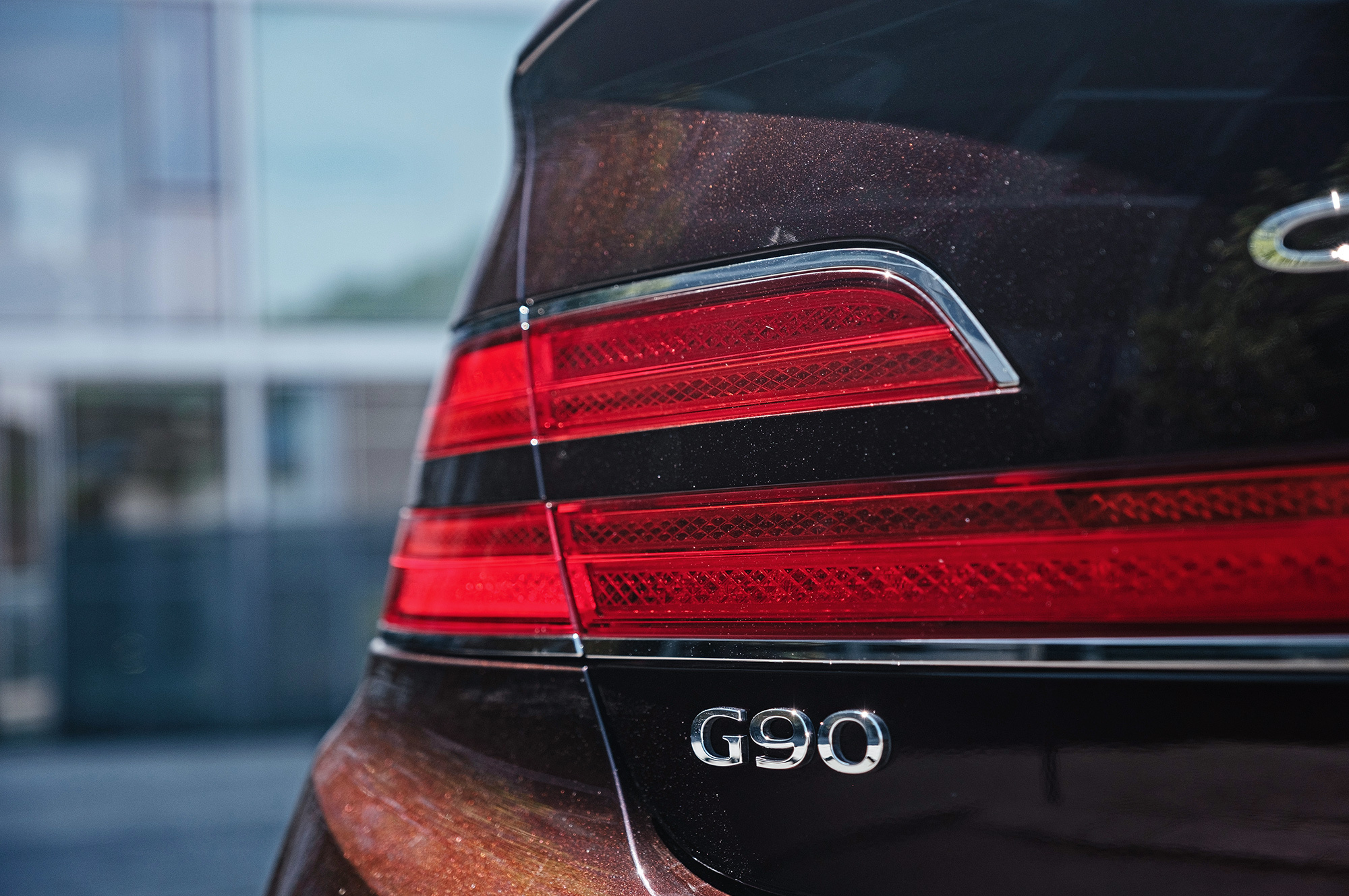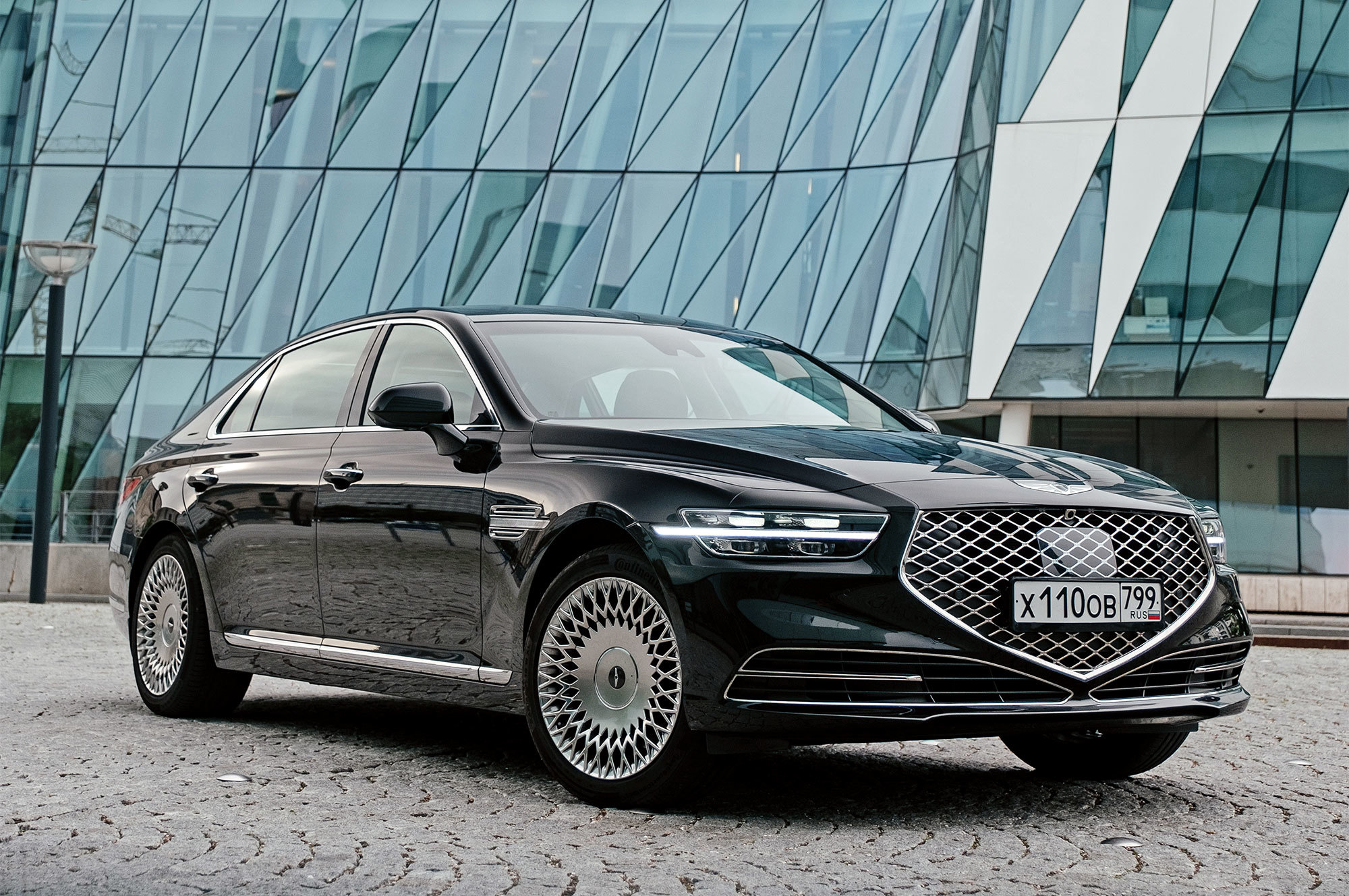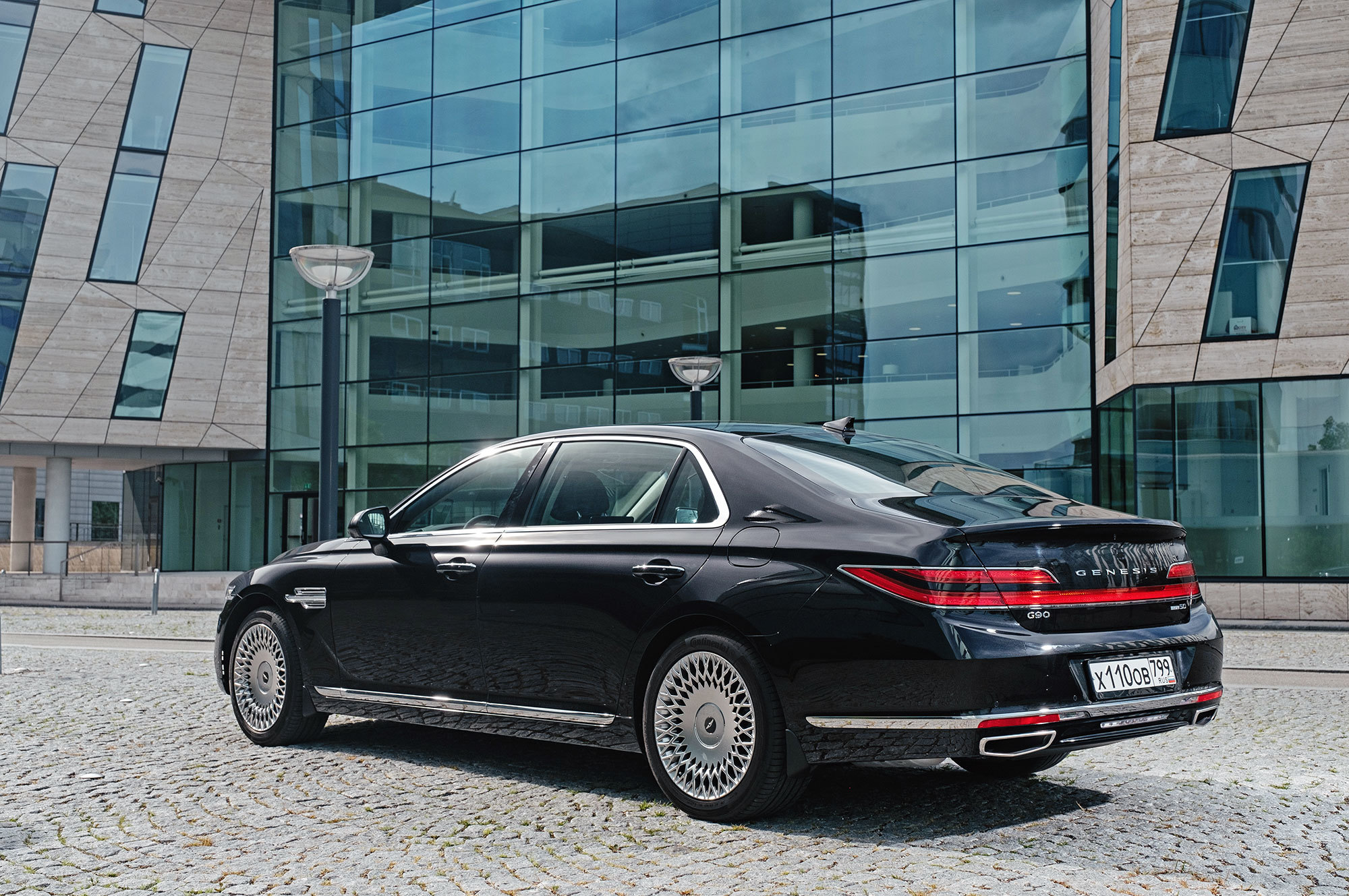 Есть ощущение, будто передок с кормой принадлежат другому автомобилю. Решётка радиатора сердечком, бамперы, передние крылья, капот, оптика «по кругу», багажник — всё новое. Даже, пожалуй, нос и филейная часть взяты от разных машин. Если фары за счёт горизонтальной полосы поворотников рождают ассоциации с Volvo S90, то сзади G90 напоминает какой-то Lincoln. Неудивительно, что стилистический вектор направлен в сторону Америки. Позиции новоиспечённой марки там пока недостаточно сильны.
