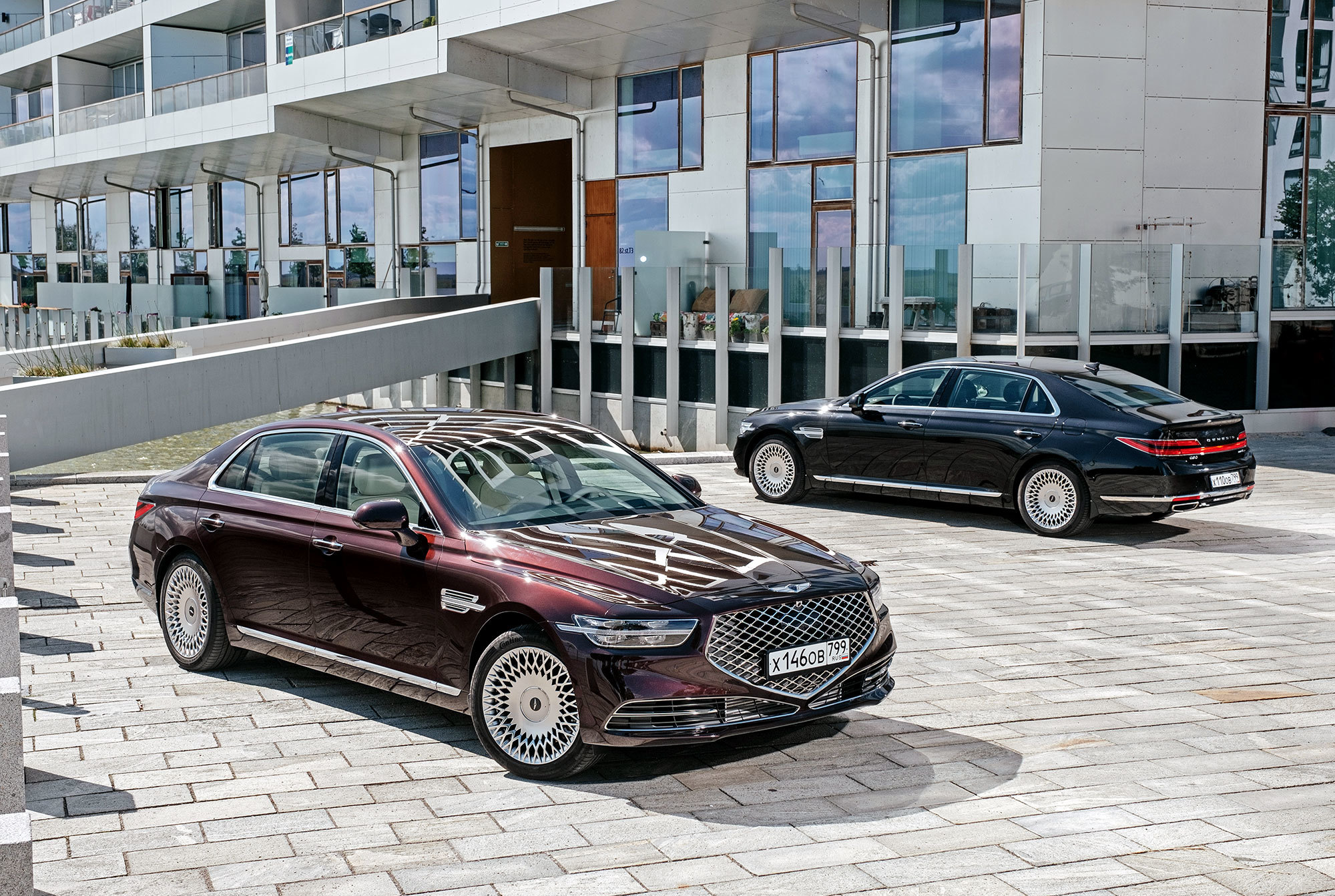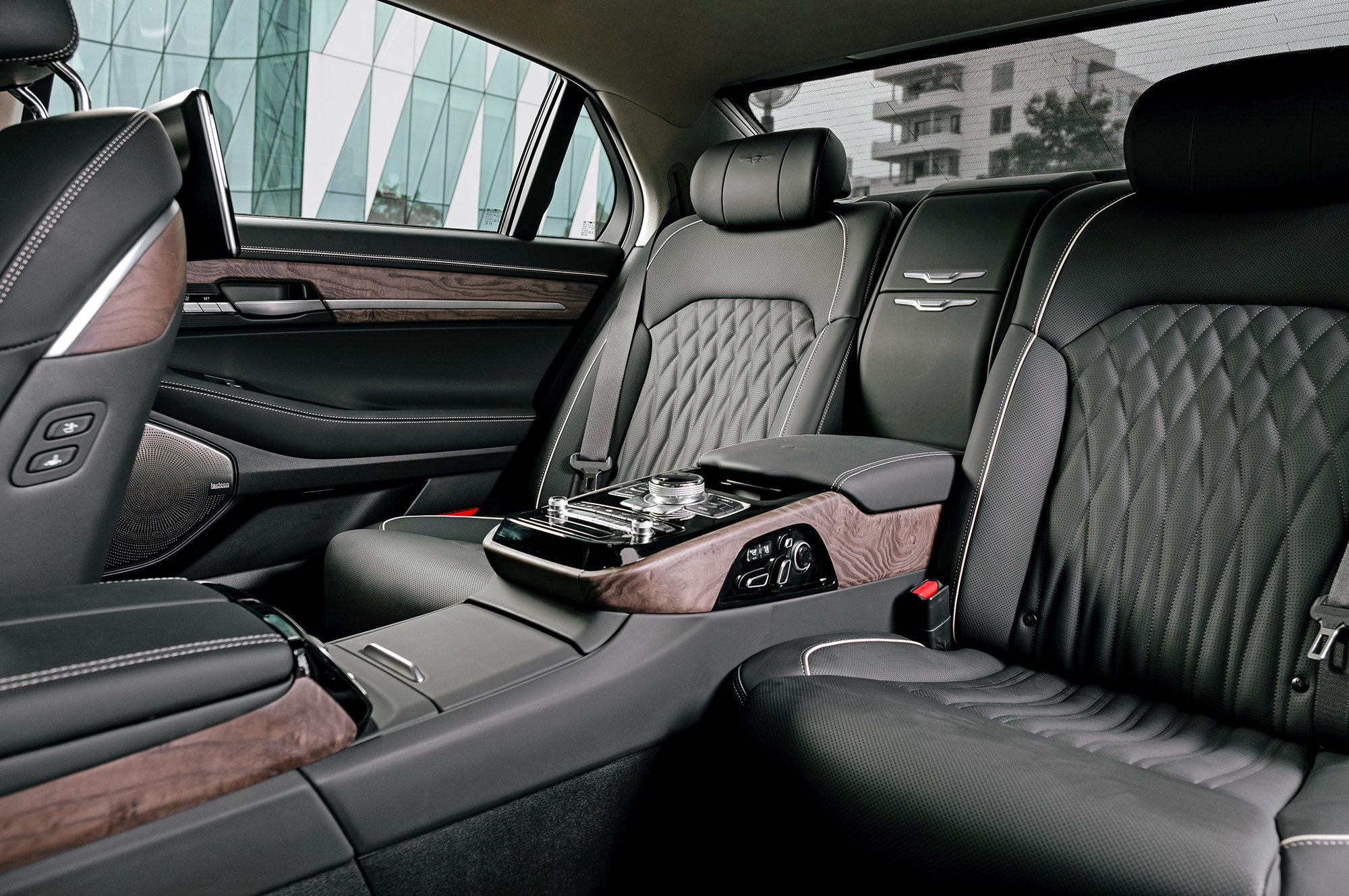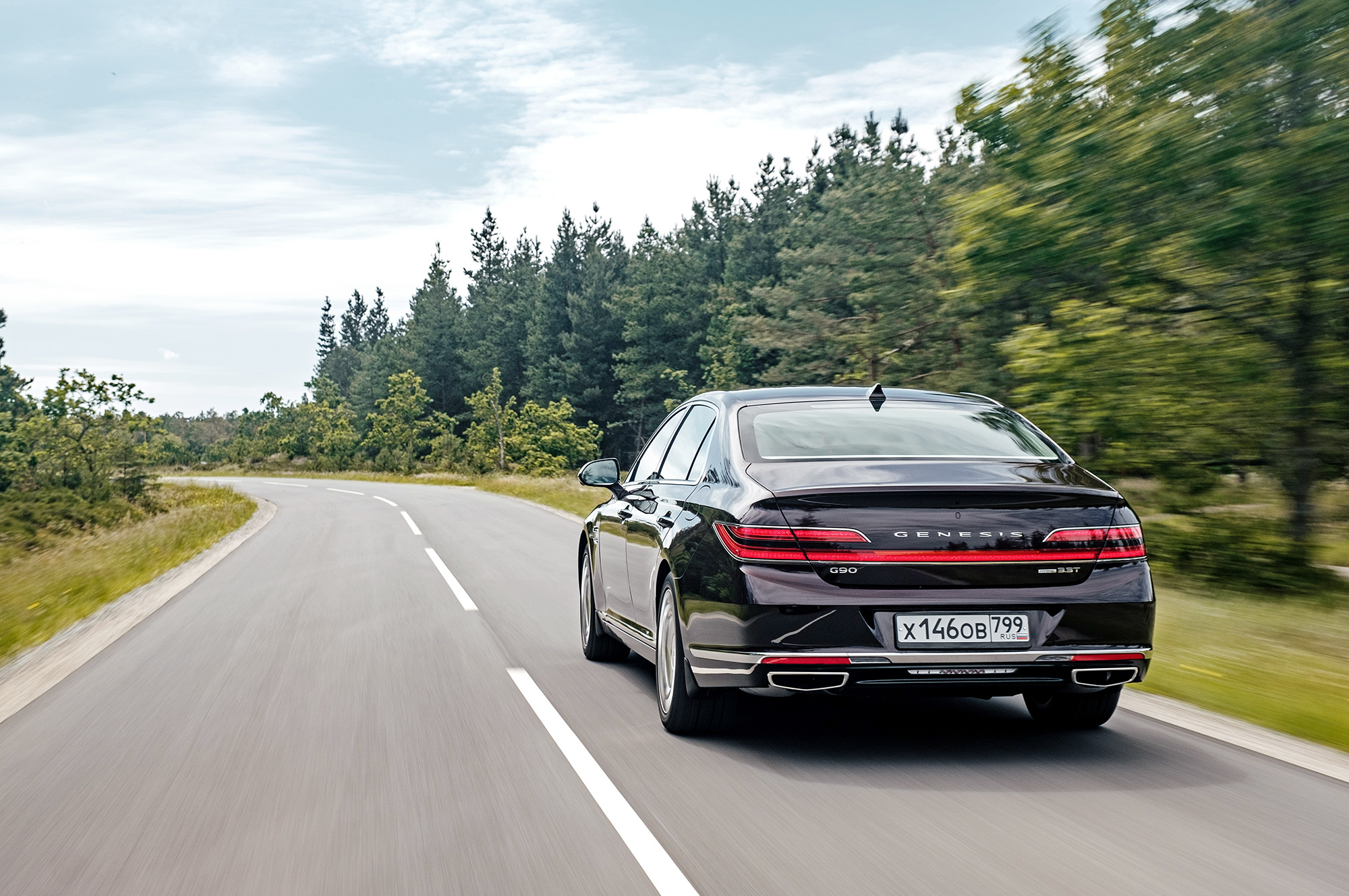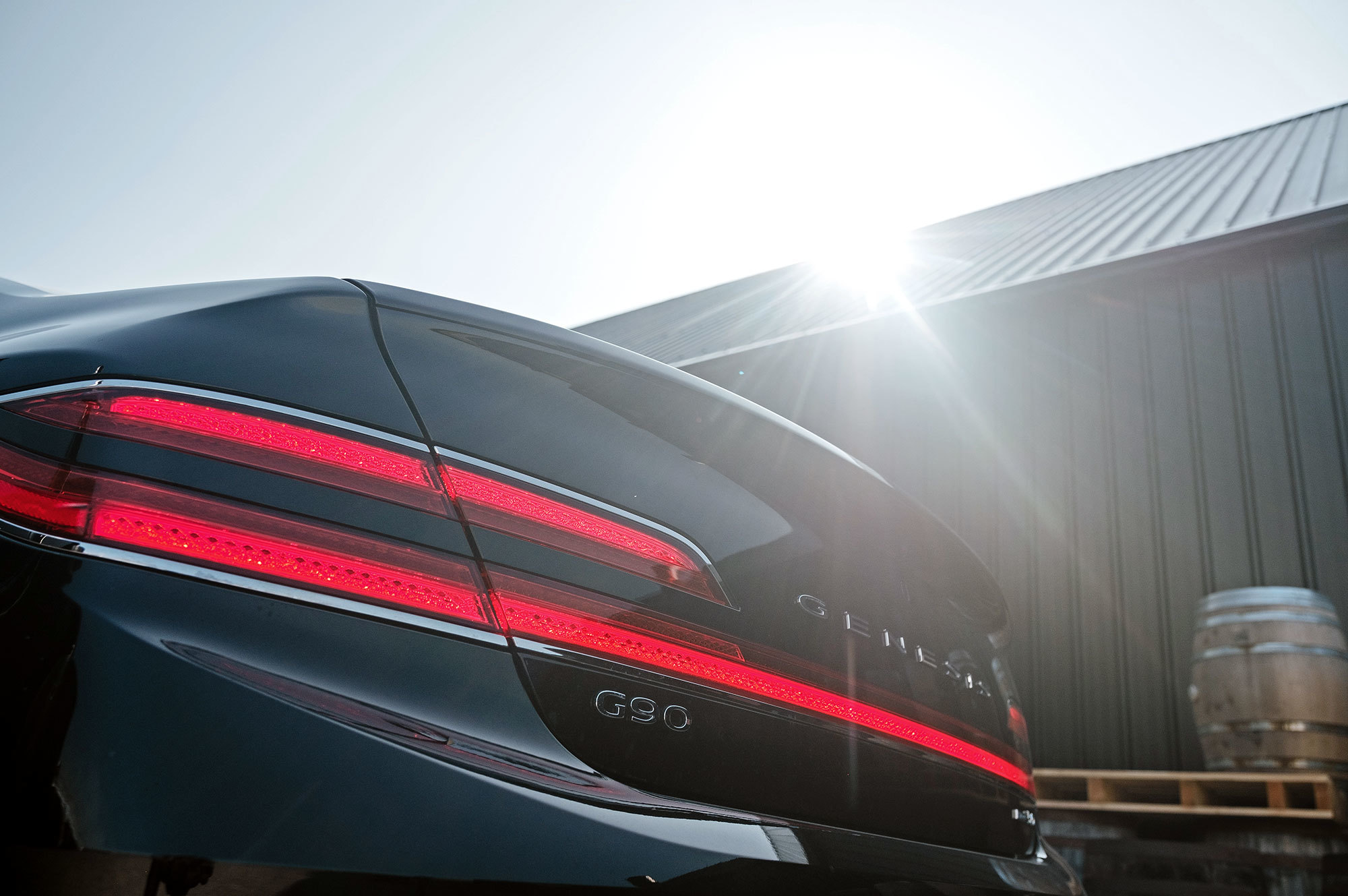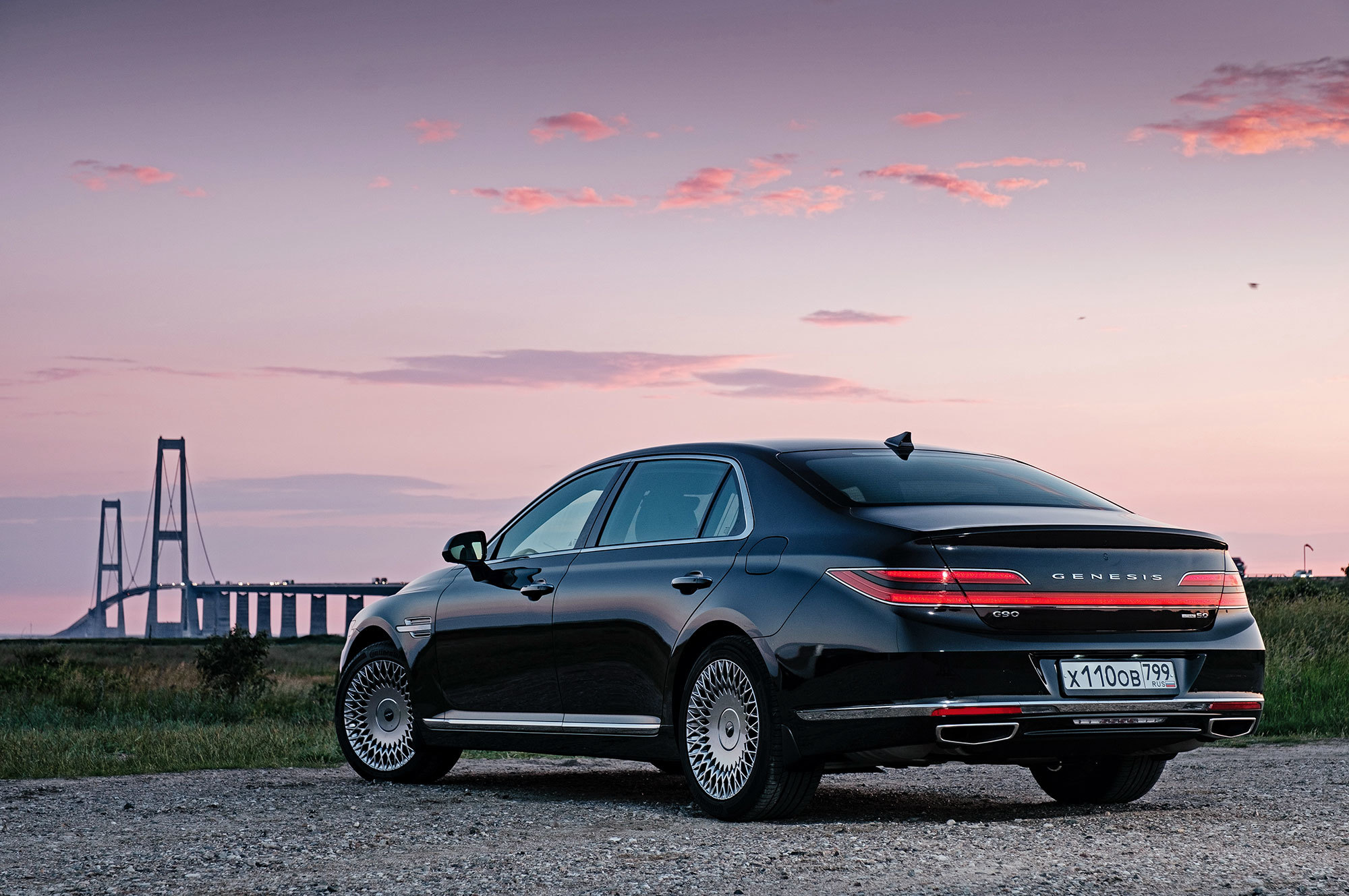 Есть ощущение, будто передок с кормой принадлежат другому автомобилю. Решётка радиатора сердечком, бамперы, передние крылья, капот, оптика «по кругу», багажник — всё новое. Даже, пожалуй, нос и филейная часть взяты от разных машин. Если фары за счёт горизонтальной полосы поворотников рождают ассоциации с Volvo S90, то сзади G90 напоминает какой-то Lincoln. Неудивительно, что стилистический вектор направлен в сторону Америки. Позиции новоиспечённой марки там пока недостаточно сильны.