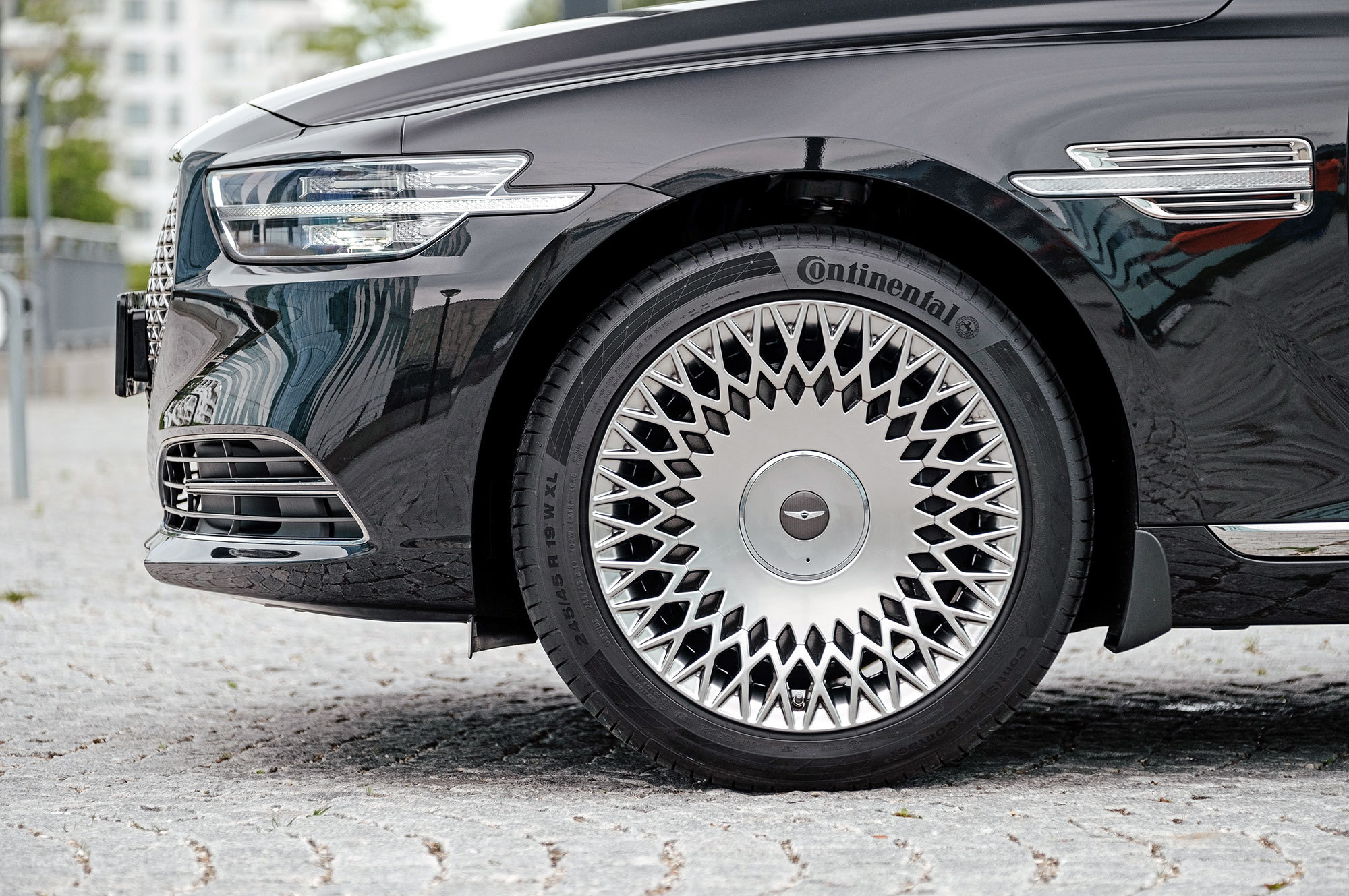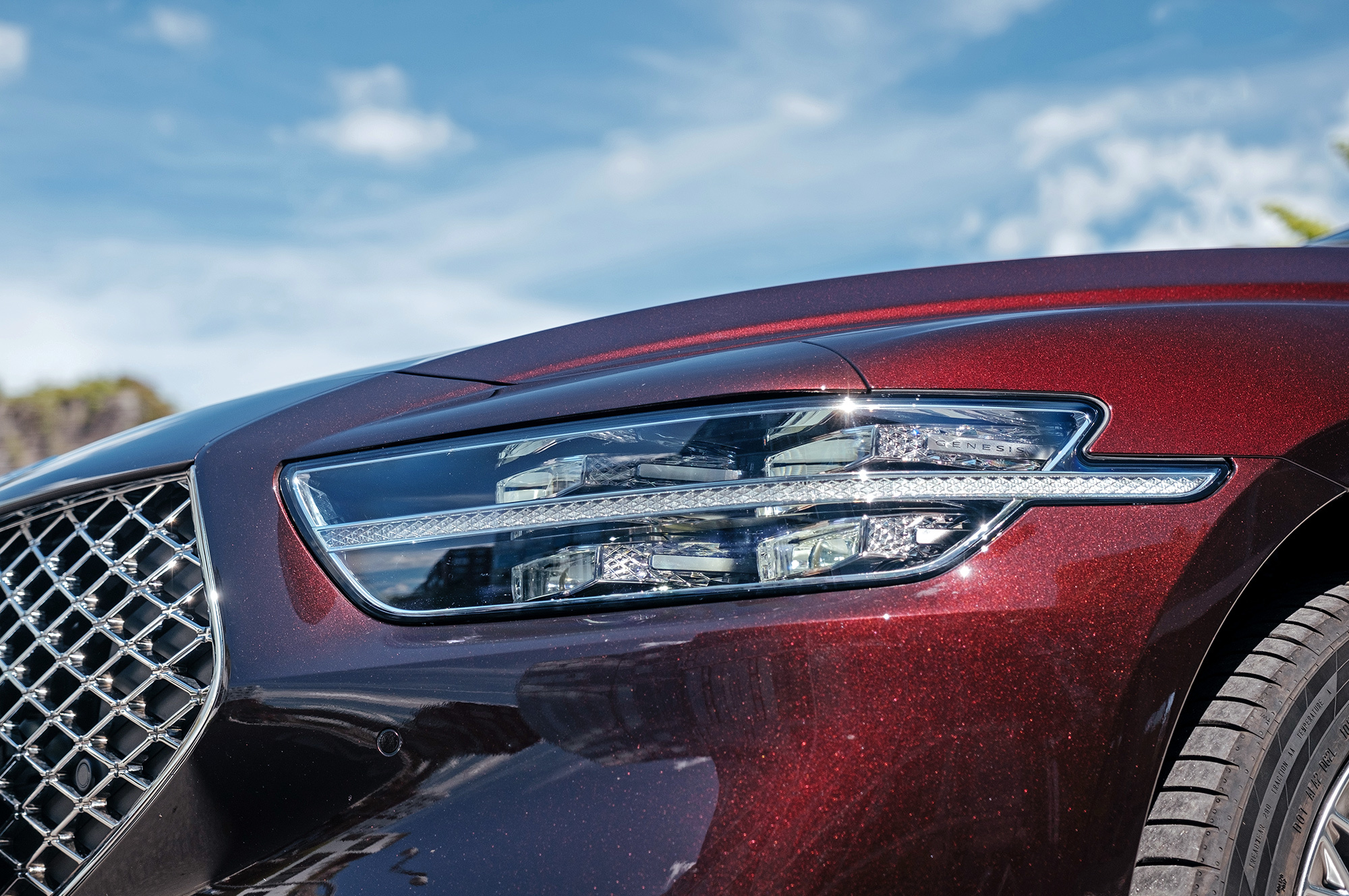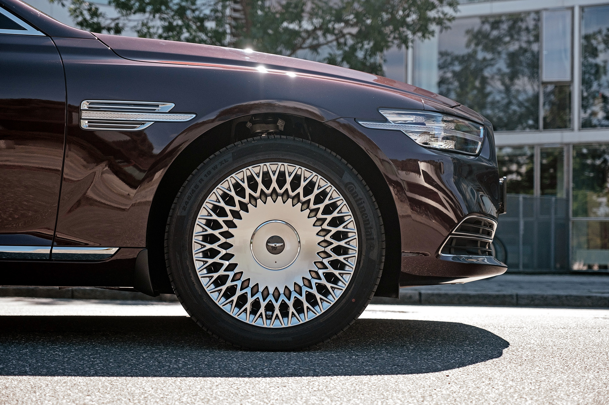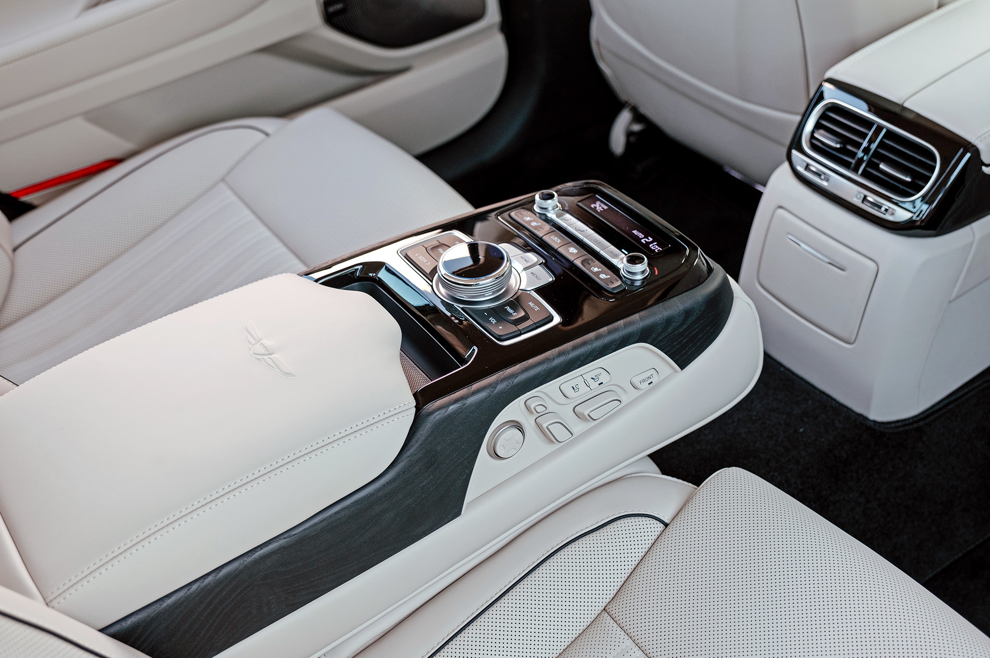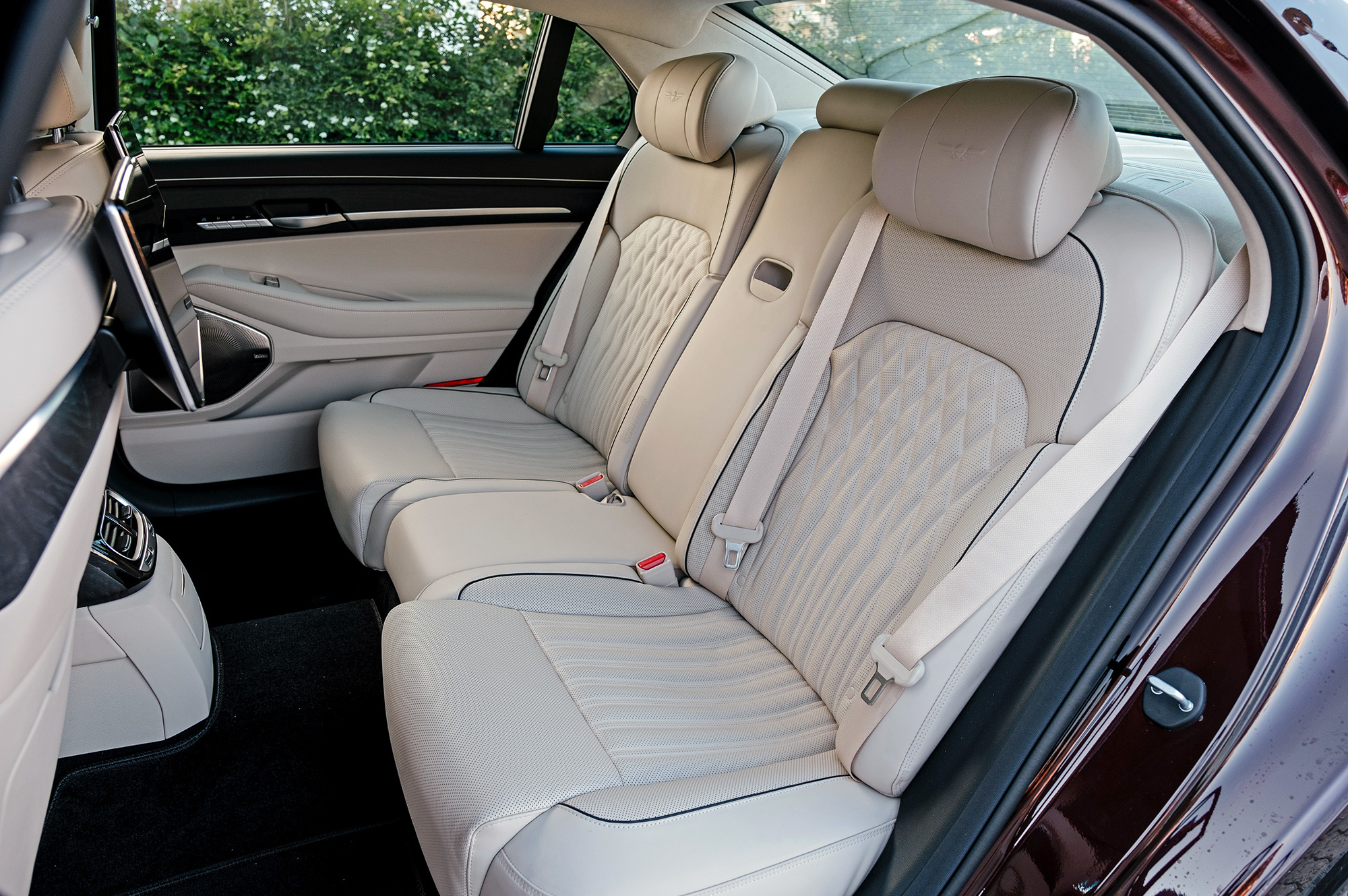 Есть ощущение, будто передок с кормой принадлежат другому автомобилю. Решётка радиатора сердечком, бамперы, передние крылья, капот, оптика «по кругу», багажник — всё новое. Даже, пожалуй, нос и филейная часть взяты от разных машин. Если фары за счёт горизонтальной полосы поворотников рождают ассоциации с Volvo S90, то сзади G90 напоминает какой-то Lincoln. Неудивительно, что стилистический вектор направлен в сторону Америки. Позиции новоиспечённой марки там пока недостаточно сильны.