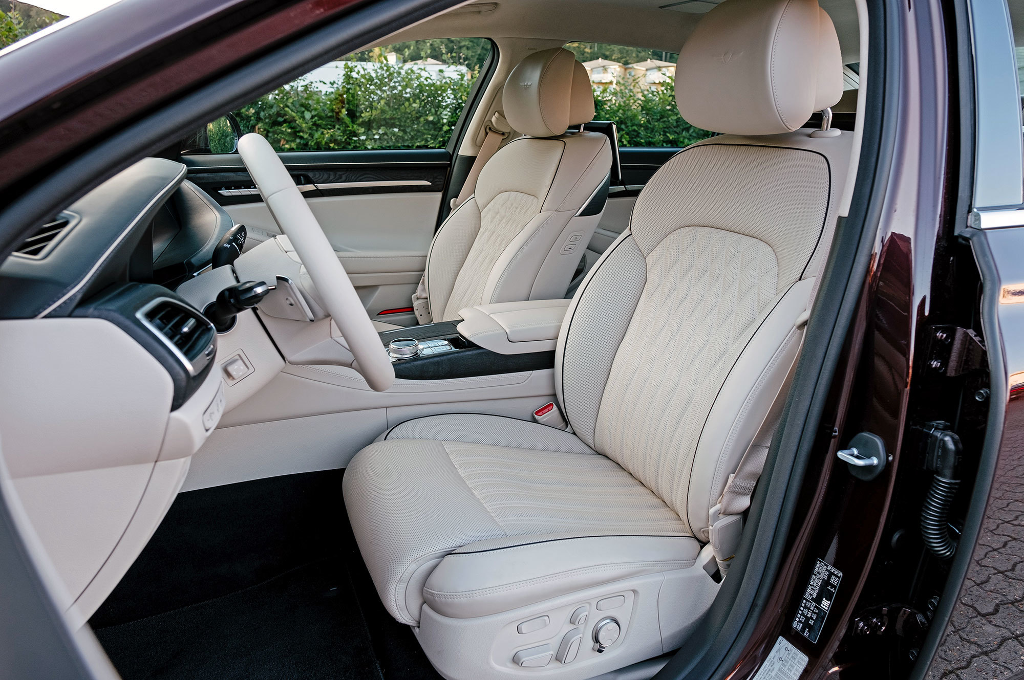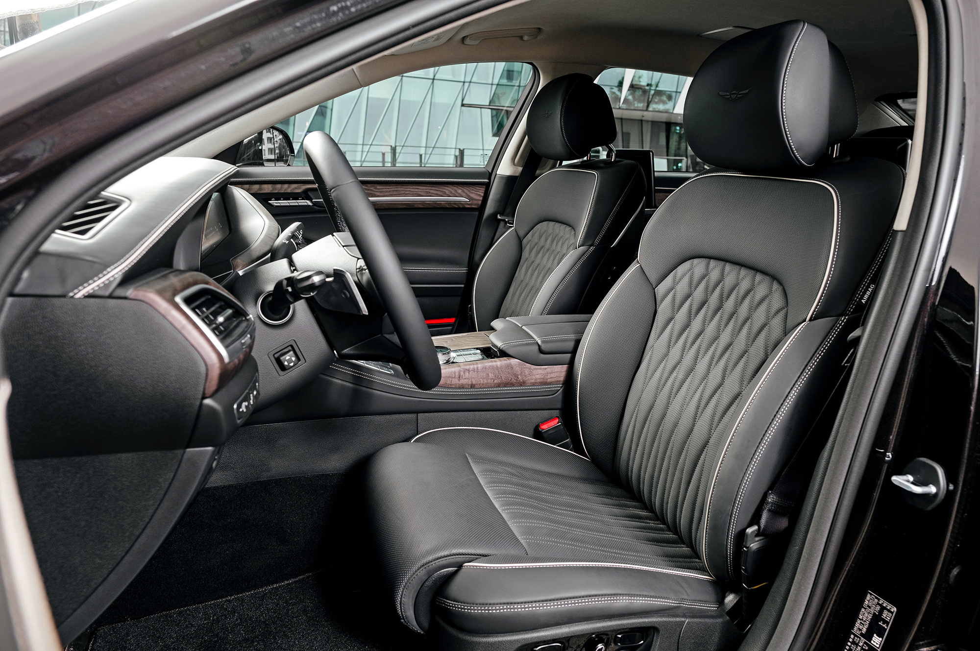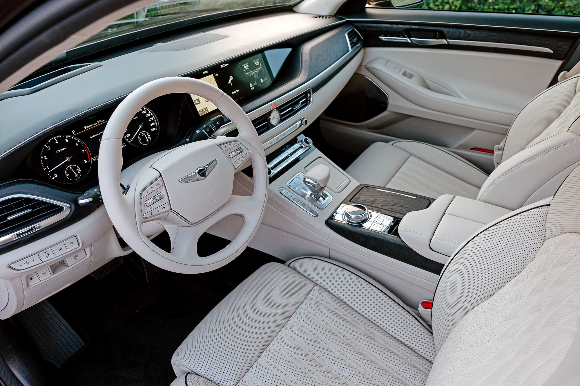Разнообразие отделки расширено за счёт пары новых цветовых сочетаний. Шлифованный шпон с естественной текстурой добавляет уюта. На дверях и передней панели отстрочен контрастный кант, который визуально удорожает салон. И лишь на выходе из машины обращаешь внимание на загримированную под алюминий пластмассовую ручку замка, которая не соответствует общему уровню. Кстати, если потянуть её, когда мимо проезжает другой автомобиль, Genesis издаёт предупреждающий сигнал. Дверь, впрочем, отпирает.