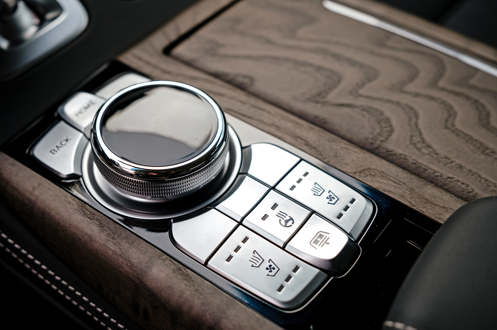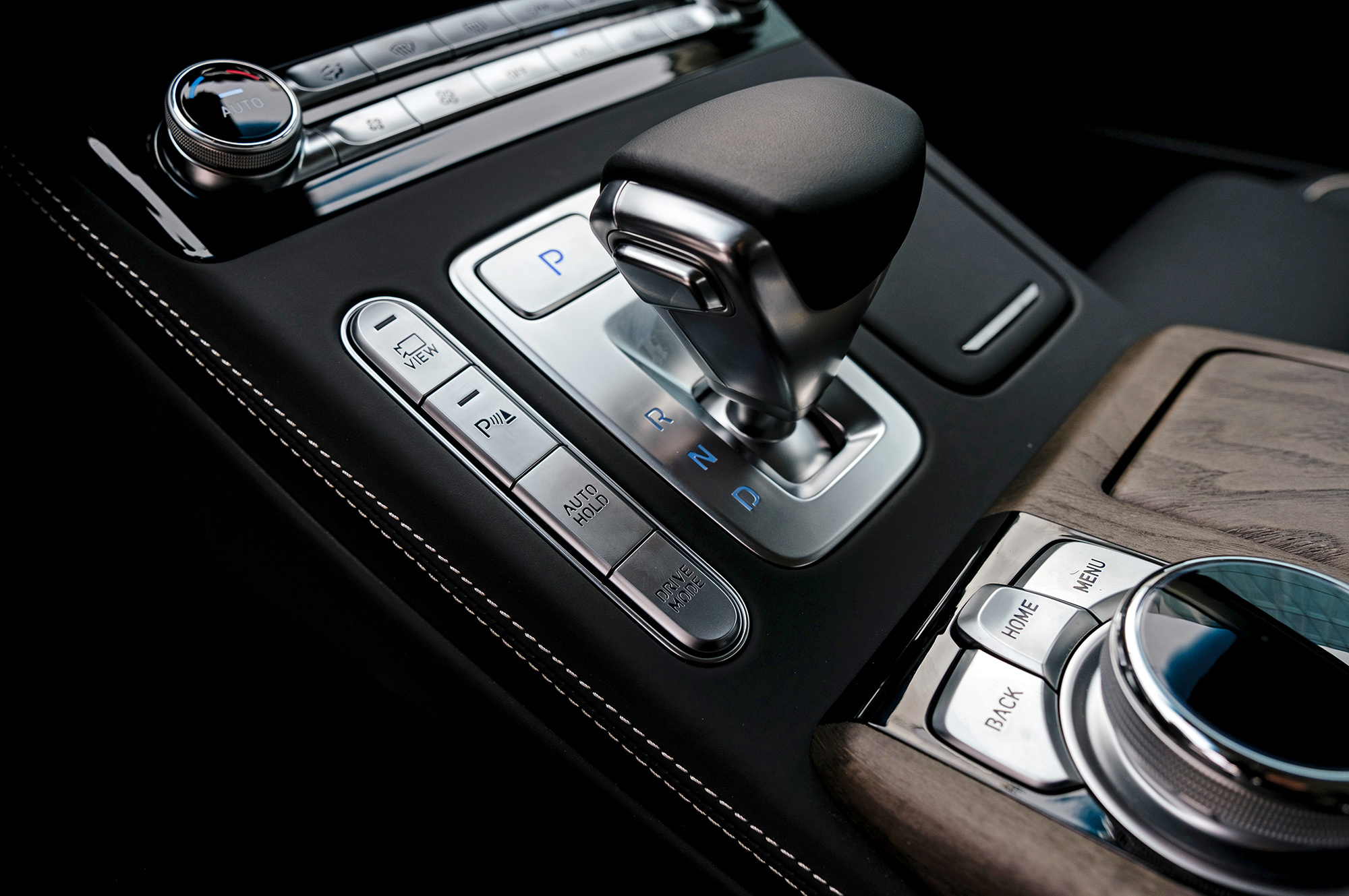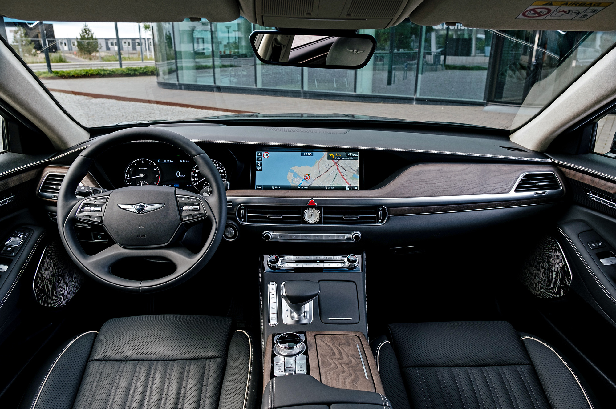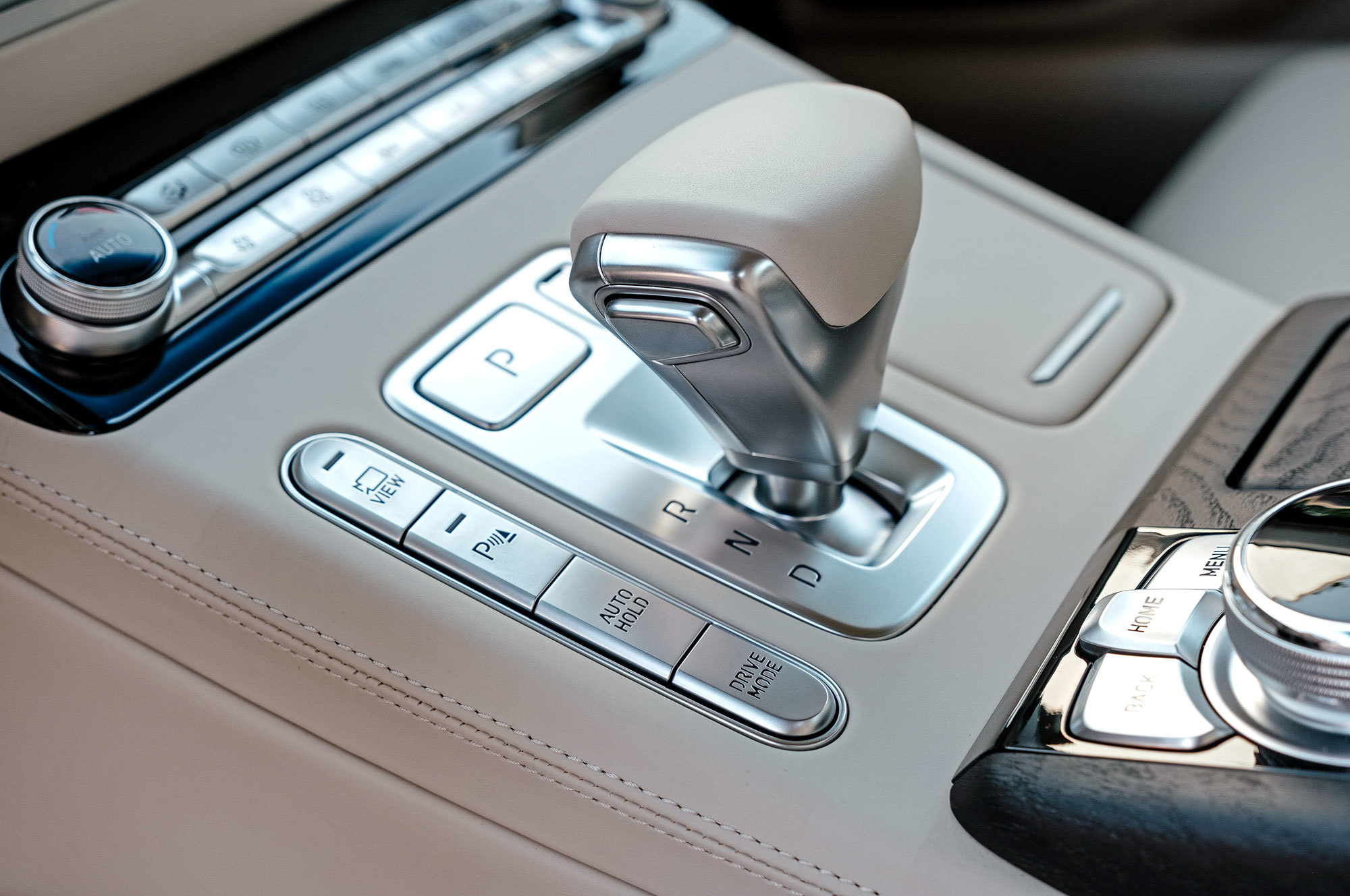 Разнообразие отделки расширено за счёт пары новых цветовых сочетаний. Шлифованный шпон с естественной текстурой добавляет уюта. На дверях и передней панели отстрочен контрастный кант, который визуально удорожает салон. И лишь на выходе из машины обращаешь внимание на загримированную под алюминий пластмассовую ручку замка, которая не соответствует общему уровню. Кстати, если потянуть её, когда мимо проезжает другой автомобиль, Genesis издаёт предупреждающий сигнал. Дверь, впрочем, отпирает.