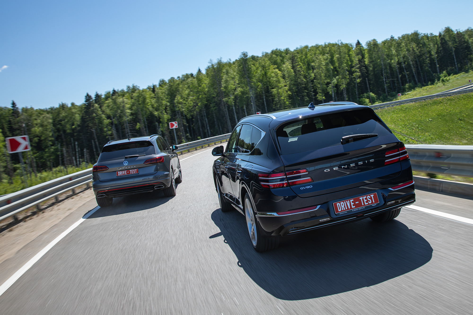 В Туареге двигатель слышен отчётливее, но в целом немецкий полноприводник воспринимается более тихим внутри, хотя ширина колеса тут составляет 285 мм против 265 у GV80. Даже с уже неактуальным для российского рынка спортпакетом R Line, сильно вредящем плавности хода, Volkswagen комфортнее Дженезиса. На любой колдобине стелет мягче, а когда дорога превращается в дырявый маасдам, сохраняет тевтонское хладнокровие, не позволяя себе расхлябанности. Ещё бы кузов не хрустел при проезде неровностей на небольших скоростях, было б совсем хорошо.