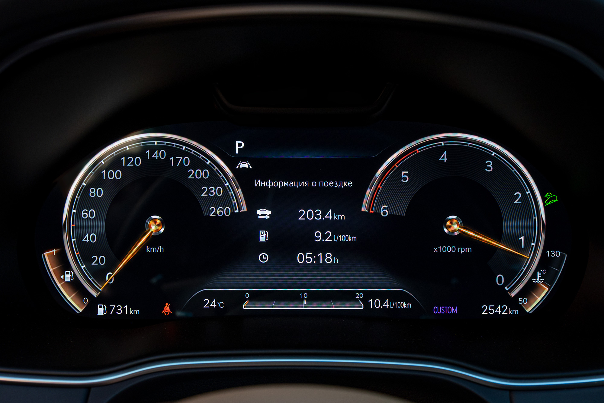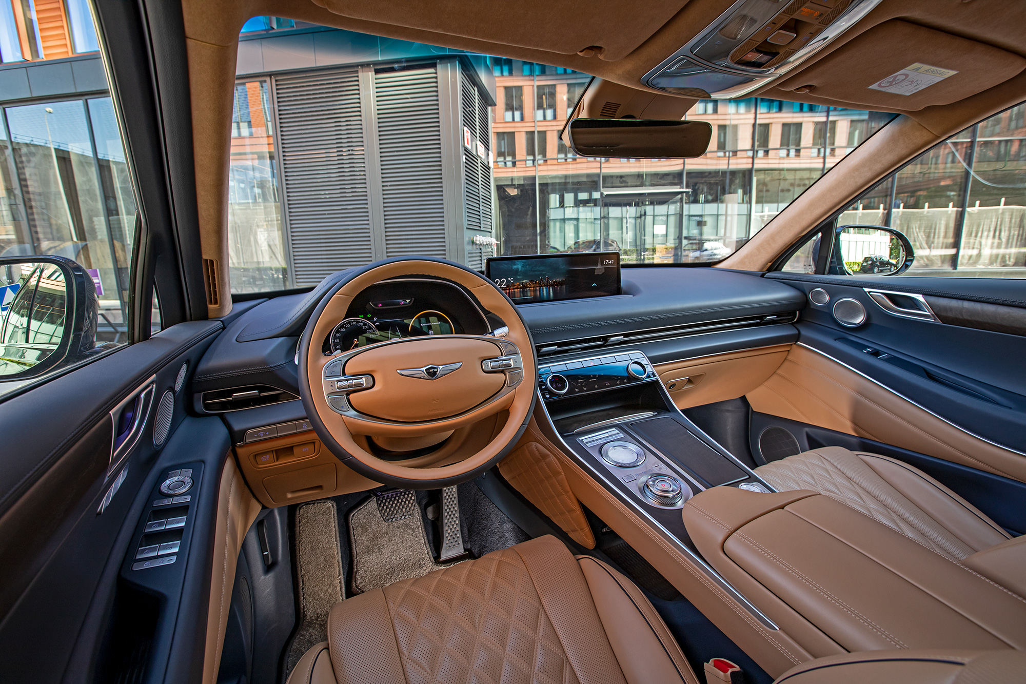 Что кроссоверы дизельные, хорошо слышно снаружи. Но в салоне Дженезиса незаметно, как мотор молотит выстроенными в ряд цилиндрами, нет вибраций на органах управления. Если игнорируешь тахометр, не догадаешься, что имеешь дело с турбодизелем. Хотя тяга, конечно, тепловозная. С места GV80 снимается прытко, а когда касаешься акселератора в зоне максимальных 588 Н•м — задрав нос, глиссирует с классным рокотом. Двухтонник с одним человеком в салоне и половиной бака набирает 100 км/ч за 7,5 с. На магистралях темп разгона заметно падает, но трудностей с обгонами не возникает.