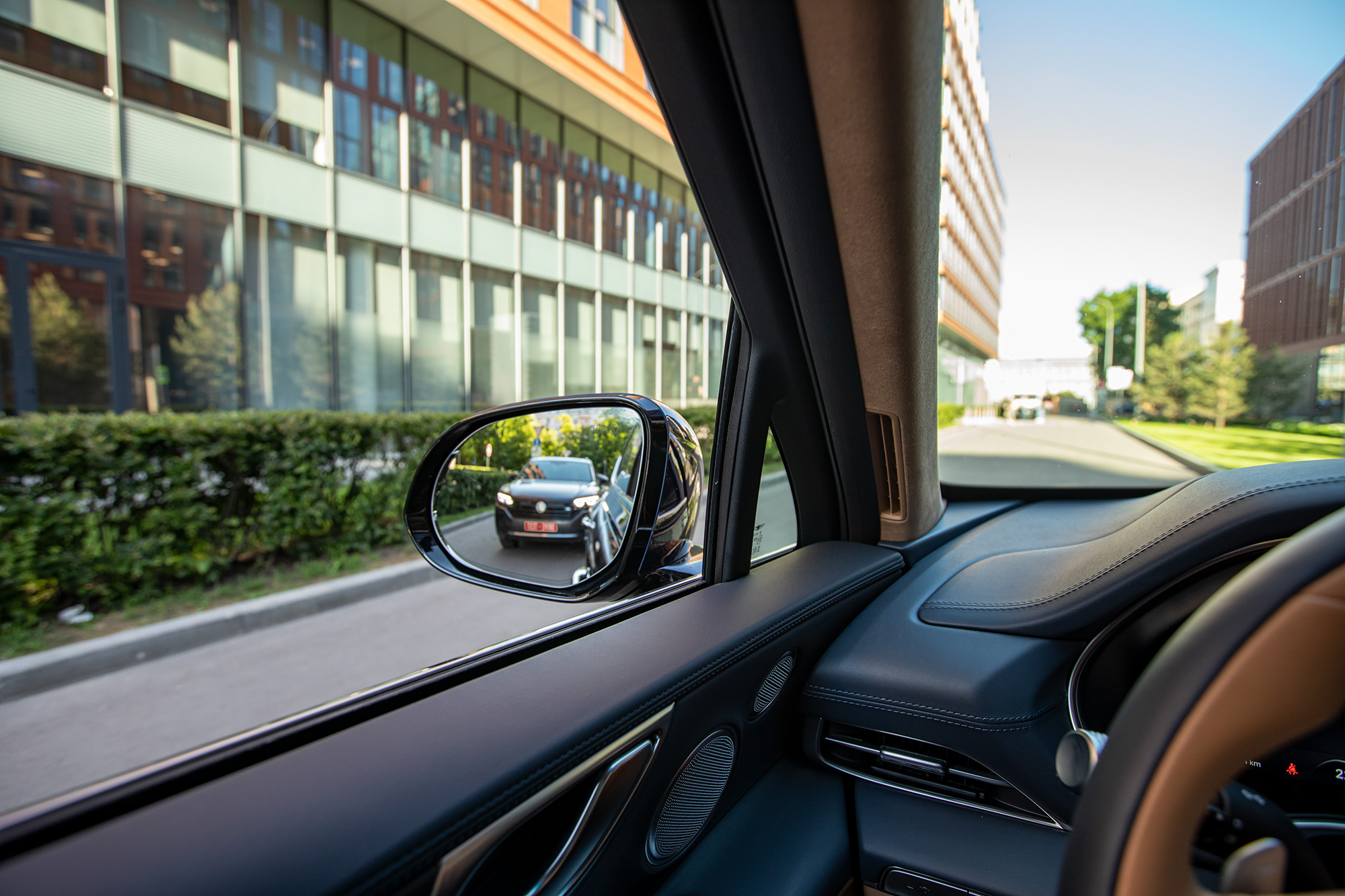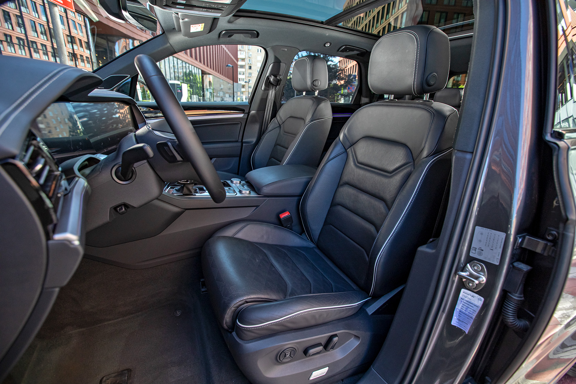 Мягкое водительское кресло дополнено экстендером подушки и оснащено массажёром, разминающим либо всё тело, либо по отдельности спину с пятой точкой. Но регулируемые боковые валики расставлены широко, а спинка с дугообразным профилем выталкивает. Передний пассажир и вовсе обходится минимумом регулировок, из удобств — лишь трёхрежимные подогрев да вентиляция. Странная для премиум-сегмента дискриминация.