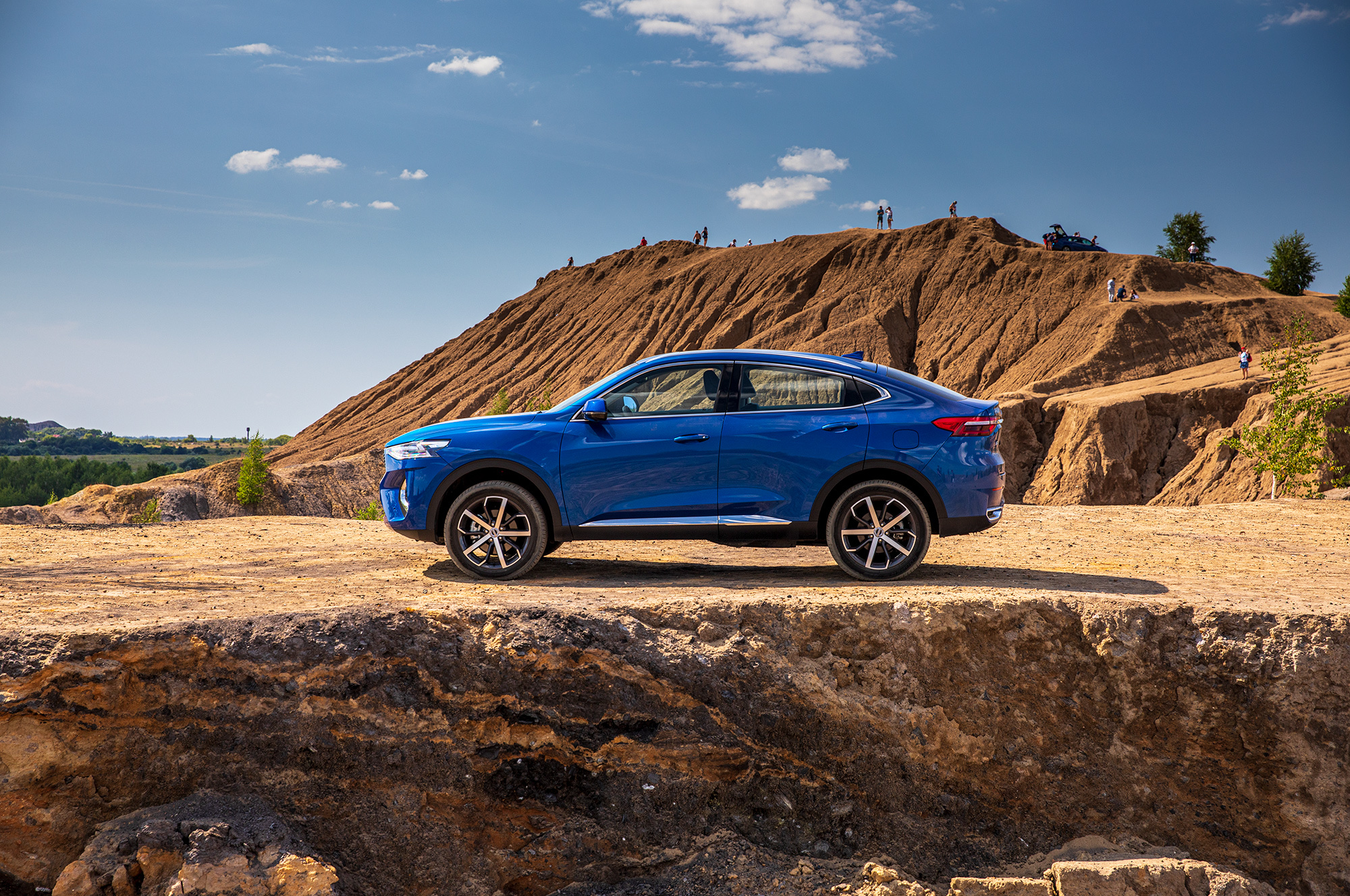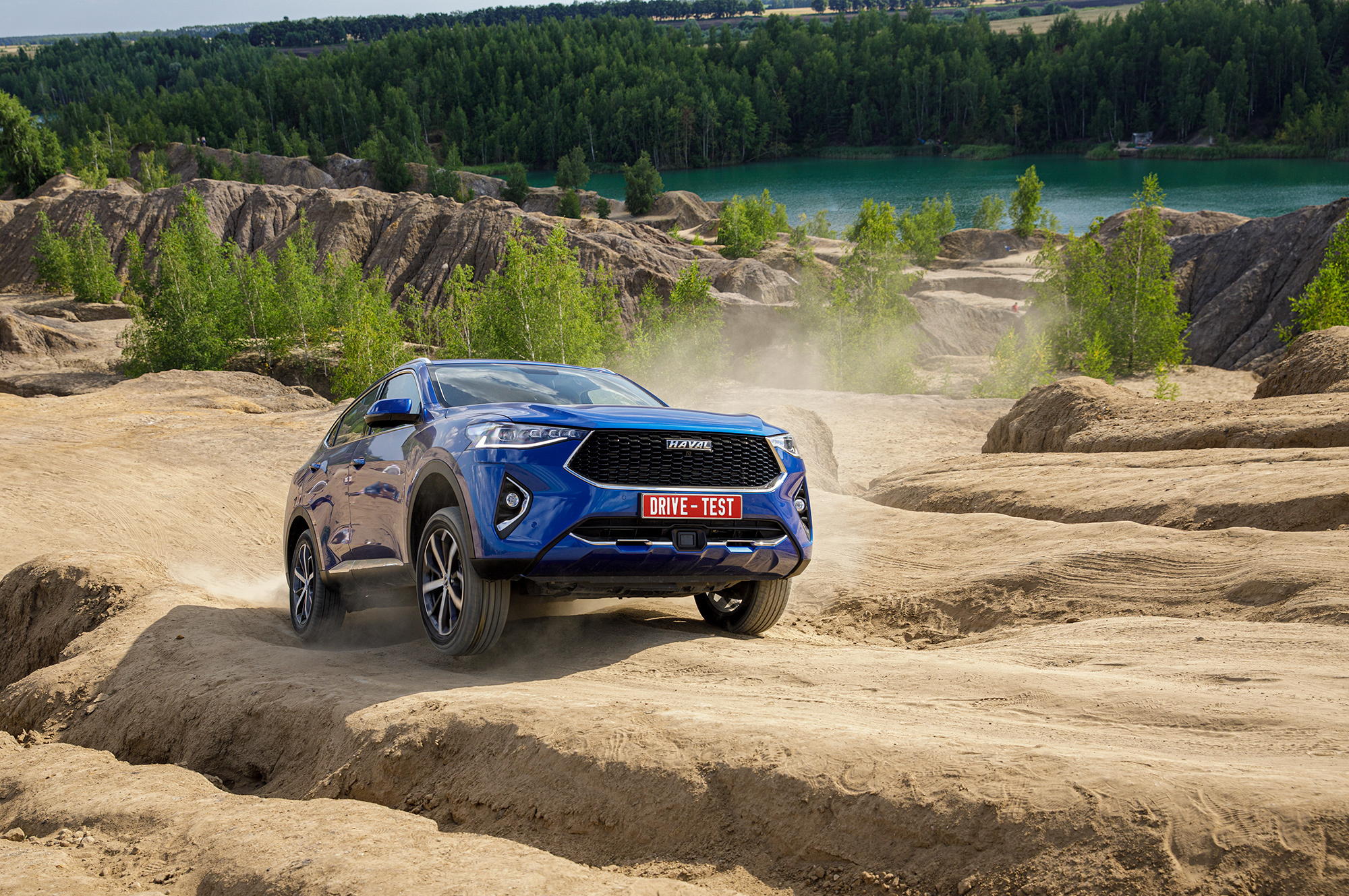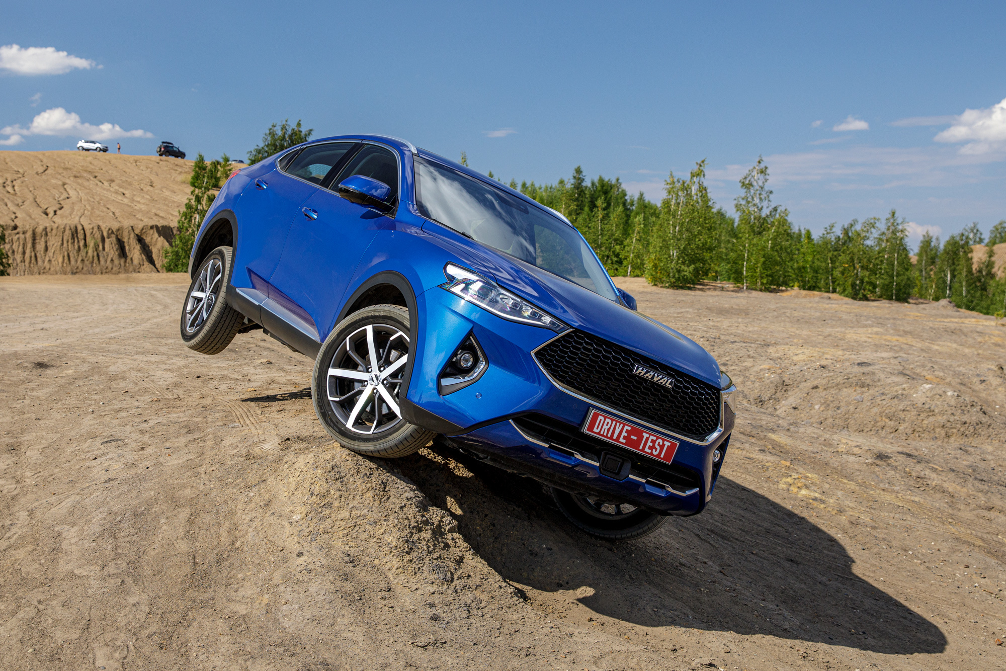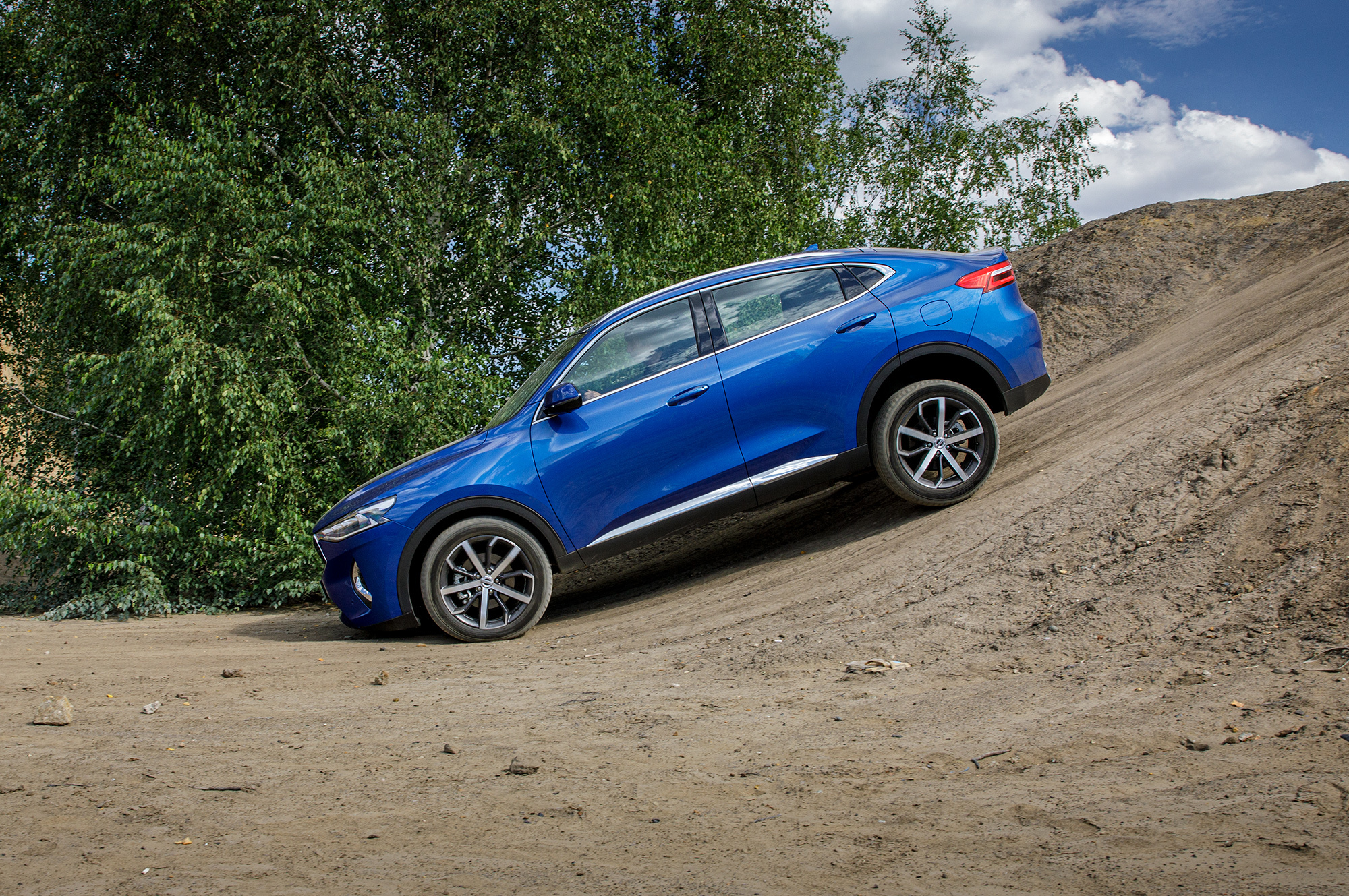 Всерьёз испытывать F7x на бездорожье я не планировал. Но после съёмки нужно выбраться из карьера. Нахожу более-менее ровную траекторию и беру крутой подъём ходом с деактивированной электроникой и принудительно включённой первой передачей. Повторяю в разных режимах — особой разницы между шестью программами системы Terrain Response не замечаю. Haval позволяет взять сухой склон и «чайнику»: под присмотром ESP. В какой-то момент обороты проседают из-за вмешательства трекшн-контроля, но тяги хватает. В целом мне нравится.