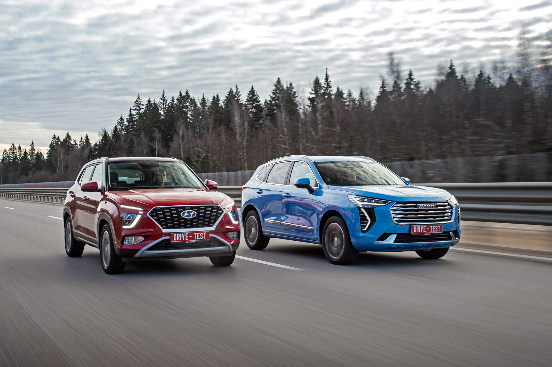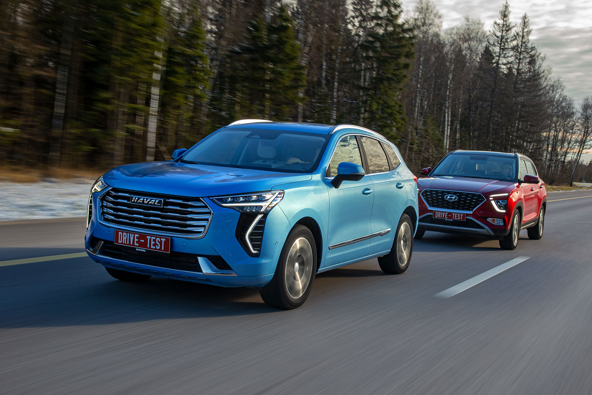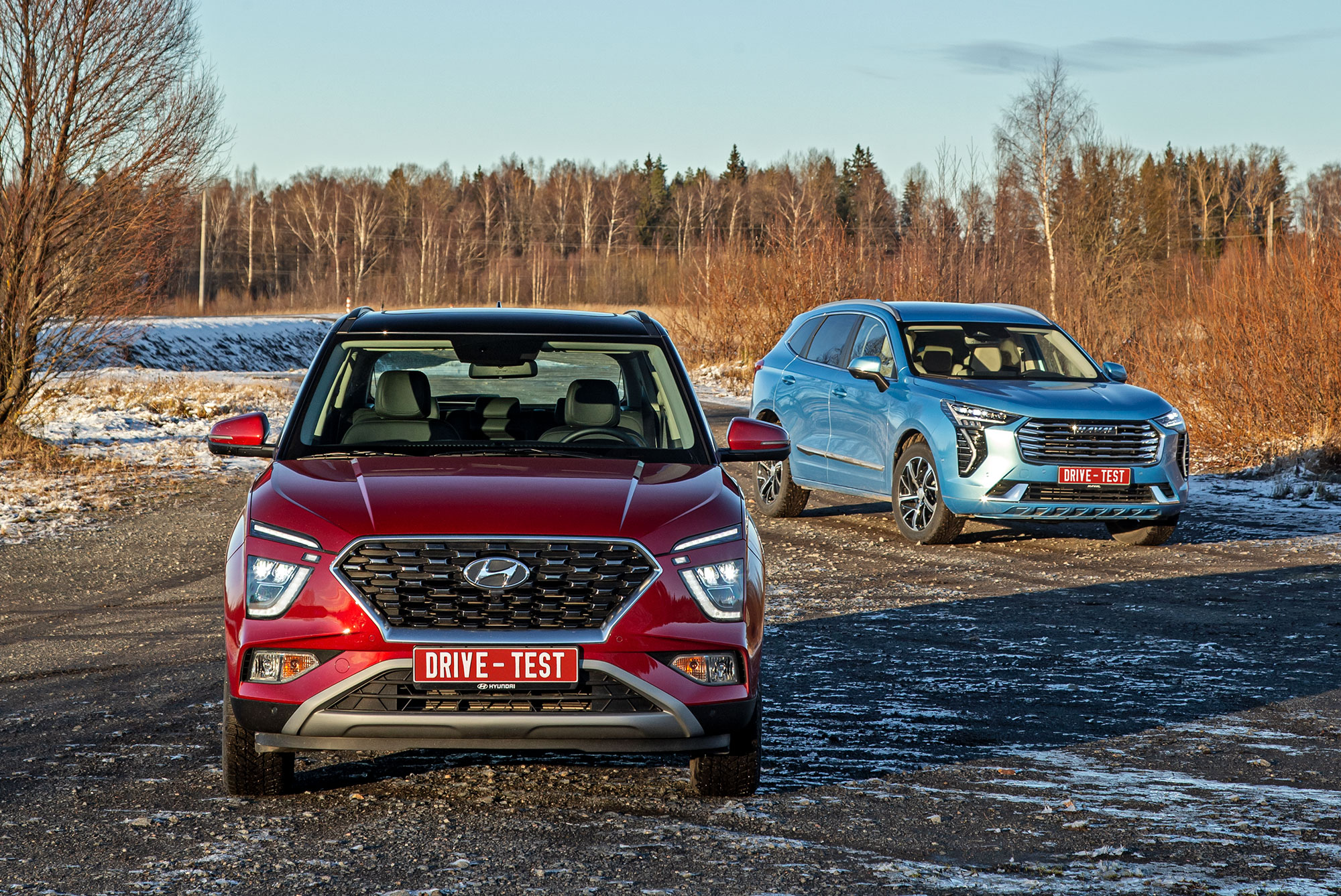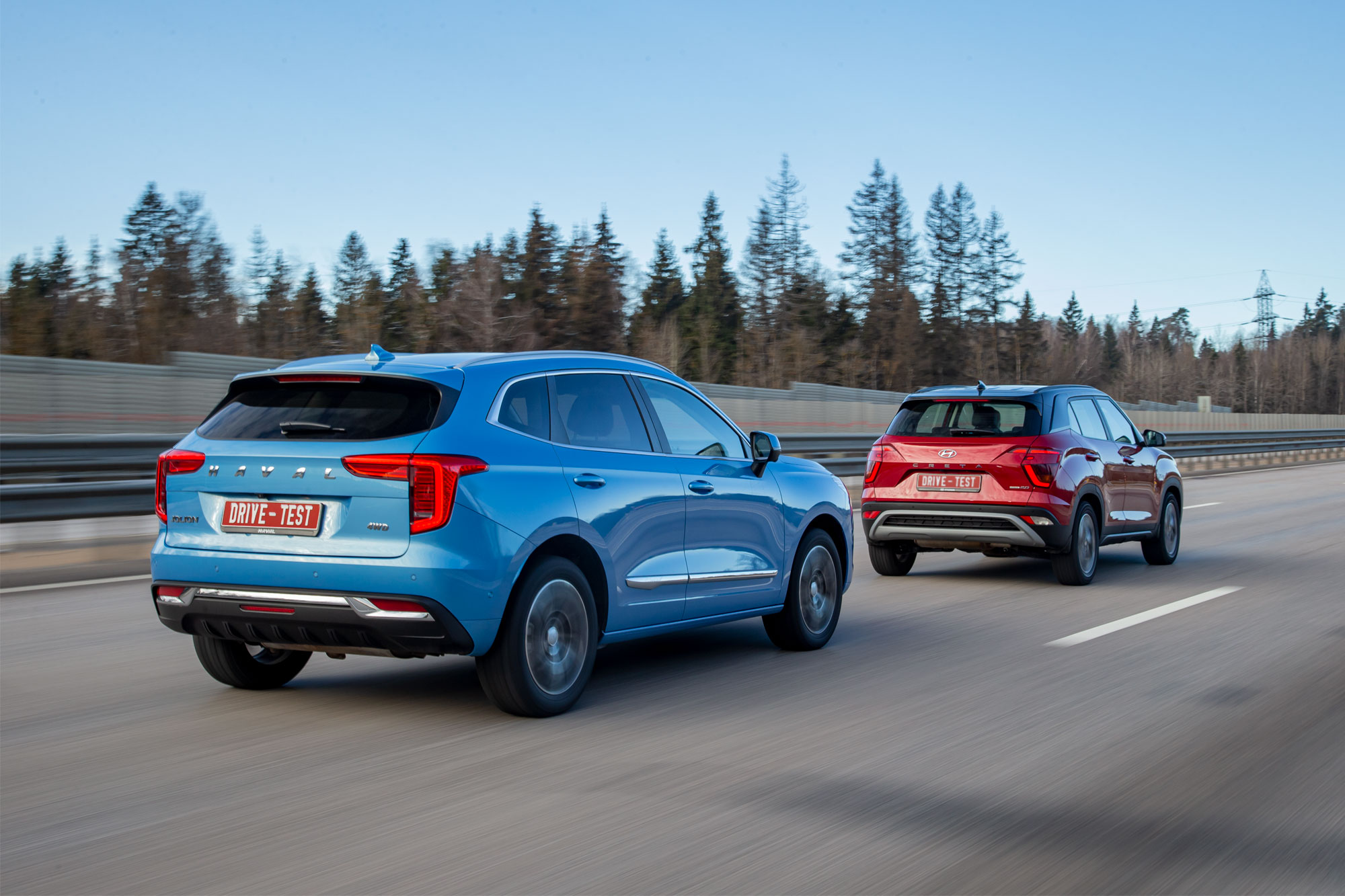 Hyundai, как и Haval, сильно кренится, но меньше клюёт носом и приседает на корму. Оба с задержкой следуют за рулём с искусственным усилием. В скоростных виражах едешь по вестибулярке, но если Крету под газом сносит, то Jolion плавно расширяет траекторию задней осью. Плохо, что китайский паркетник под сброс пугающе резко выставляется боком. Шины явно не подходят для подобной настройки шасси. Подбирая обувку Джолиона, стоит обратить внимание на покрышки, обеспечивающие большую стабильность. Корейский полноприводник на фрикционках безопаснее, даже если ослабить хватку системы стабилизации.