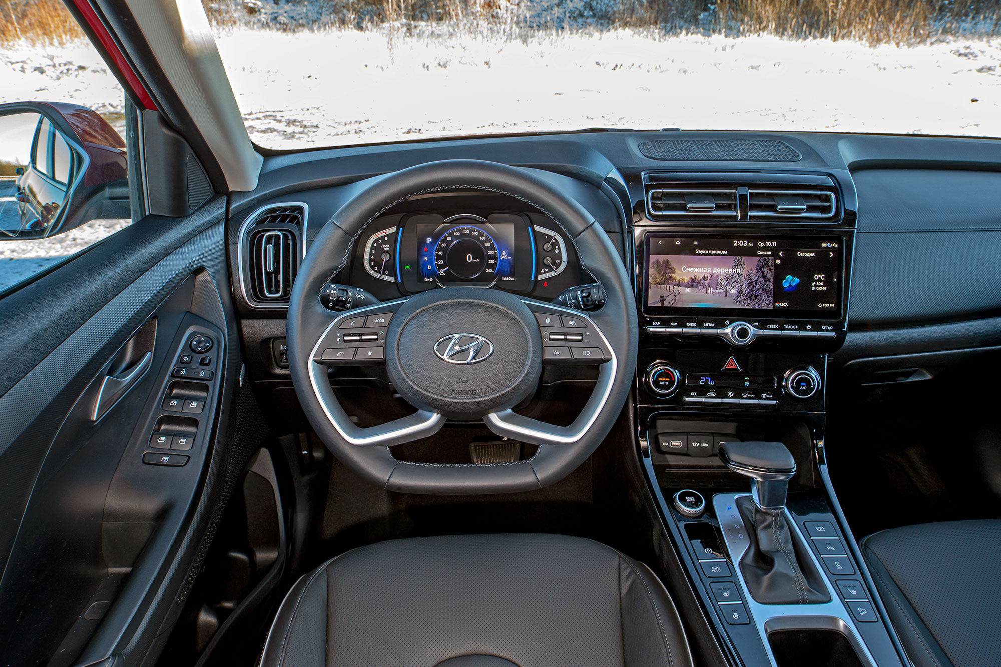 Двери Креты с гулким звуком открывают царство дешёвого пластика. Он здесь повсюду. В попытке подправить ситуацию корейцы даже сымитировали прострочку на передней панели, но не сработало. Лучше бы подсветили блок управления зеркалами и стеклоподъёмниками на двери, а не одну клавишу опускания водительского стекла. В таком непритязательном интерьере даже частично цифровая панель приборов смотрится чужеродно. Не говоря уже о расторопной мультимедийной системе с качественным сенсорным экраном диагональю десять с четвертью дюймов и богатым набором функций.