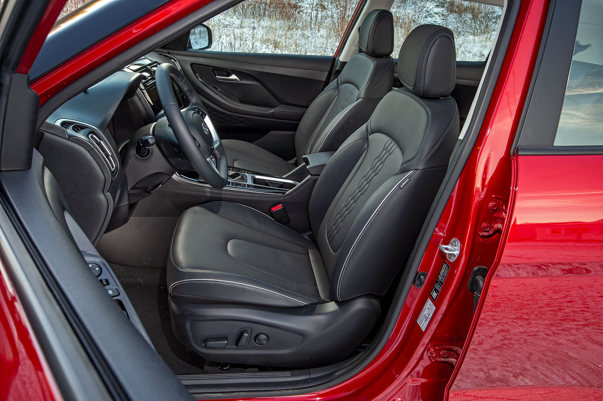 Кресла в Hyundai нарядные — с фигурной прострочкой, контрастным кантом и электроприводом. Однако под цепкой кожей — очень жёсткий наполнитель. Спинка с выталкивающим профилем, коротковатая подушка и небольшие валики боковой поддержки будто зацементированы. Посадка водителя даже не кроссоверная — грузовая. На переднюю панель и капот смотришь свысока, хотя сиденье опущено. Усиливает ощущение отлогий руль, который регулируется по высоте и вылету в больших диапазонах.