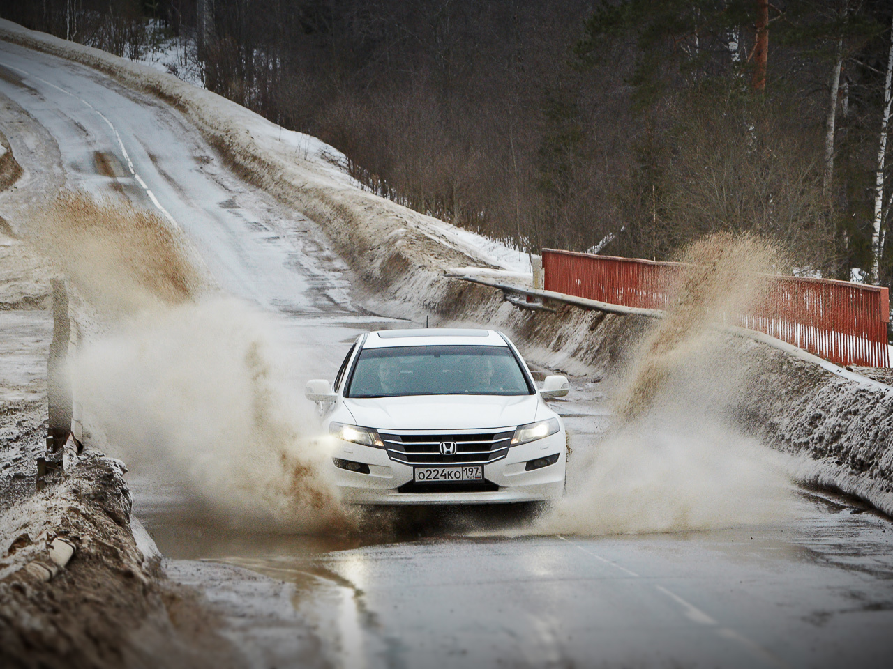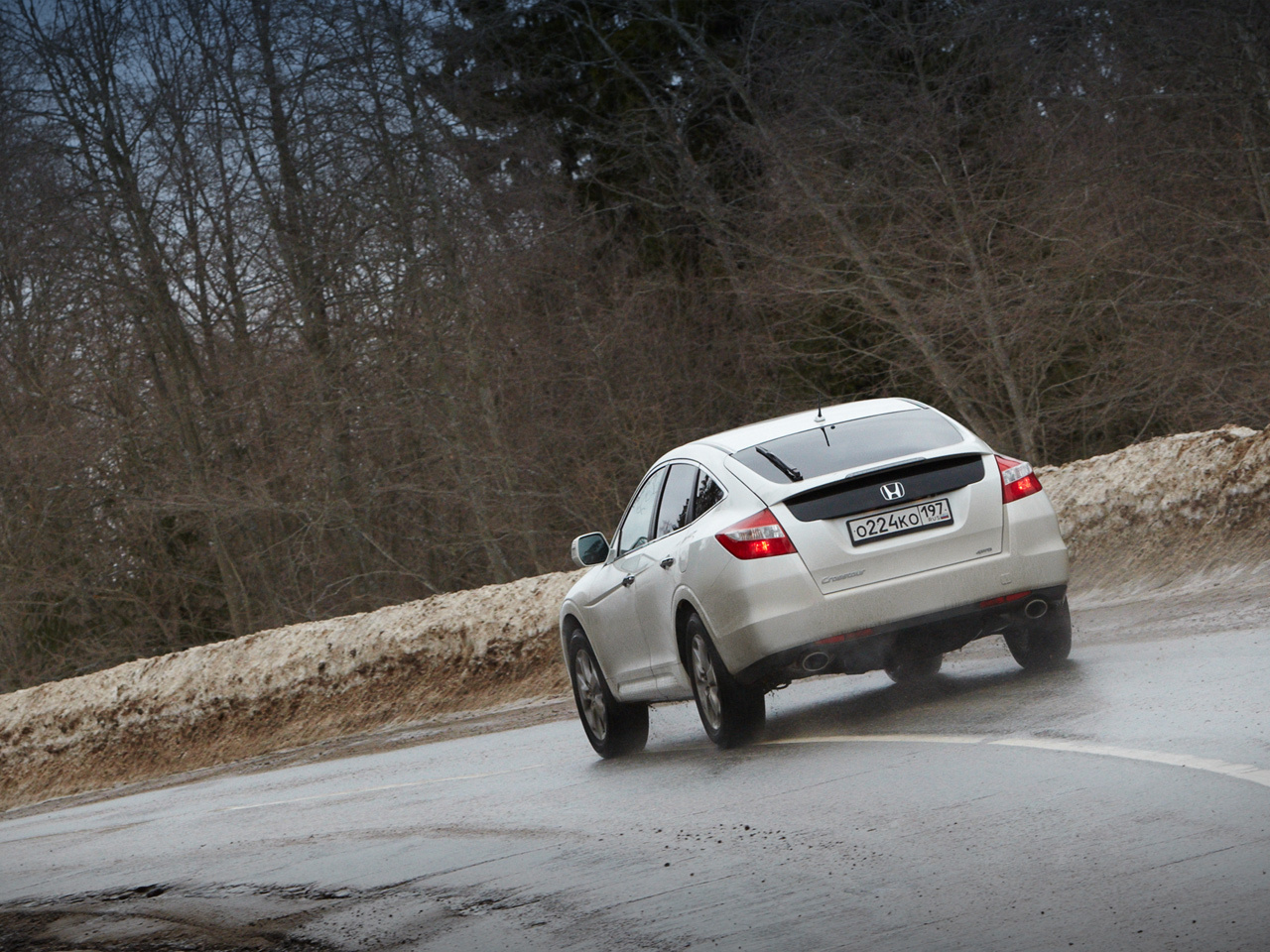 Пусть хондовский мотор заводит, но водителю заводиться не стоит. Crosstour едет дорого и степенно, не поддерживая спортивного настроя. Главное — попасть на его волну. На интернациональную радиостанцию «Голос Америки» — Crosstour учили ездить по заокеанским учебникам. Пятидверка плавно вздыхает на волнах асфальта, не стесняясь диагональной раскачки в виражах. Но при этом не пугает кренами. На действие руля реагирует с ленцой, однако характер усилия позволяет почерпнуть хоть какую-то информацию о дороге. По дуге машина идёт цепко, не сбиваясь с траектории на неровностях. По ощущениям, нечто среднее между их Пилотом и нашим Аккордом.