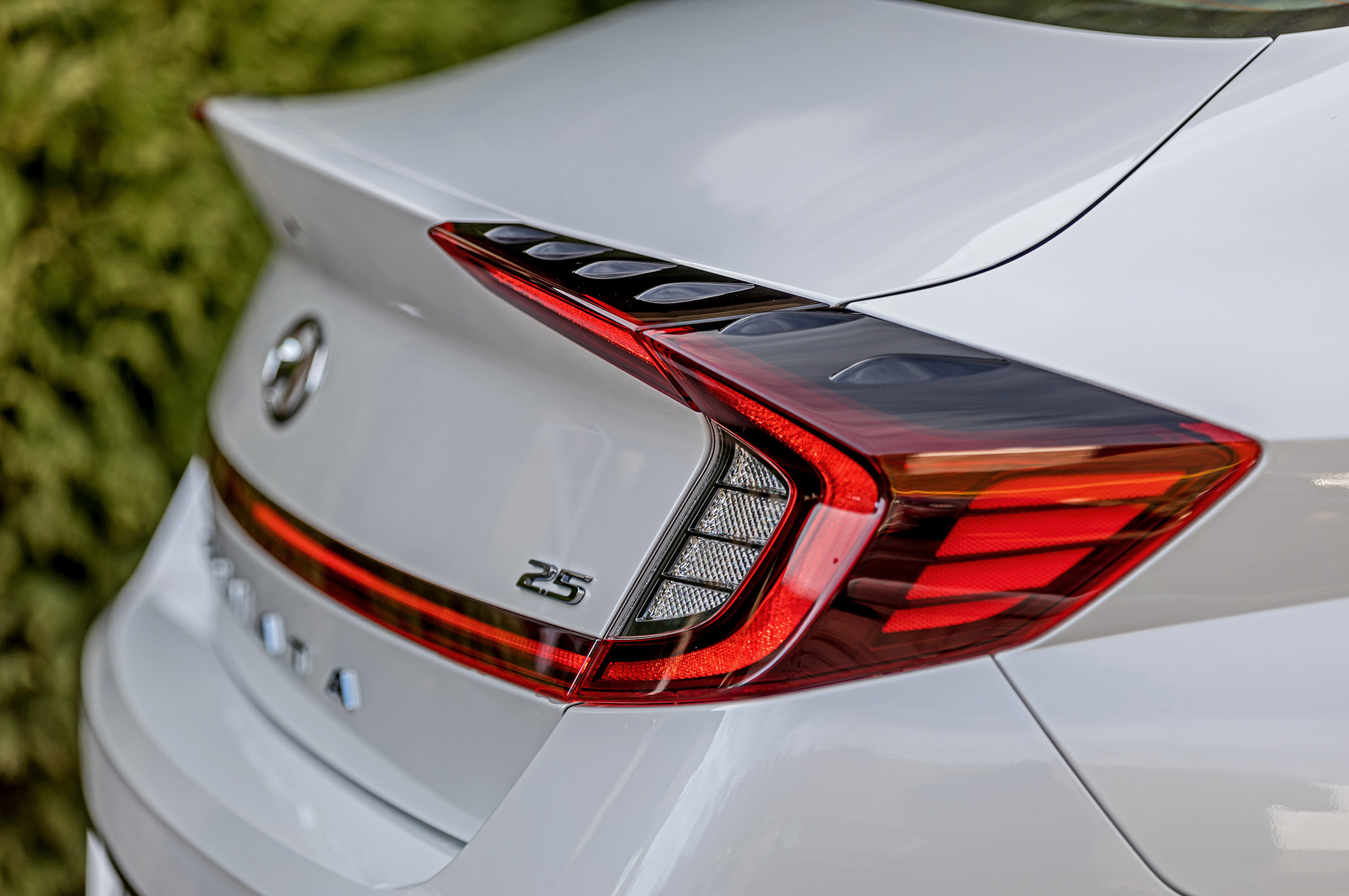 Дизайн очень крут! Из строгого трёхобъёмника Sonata превратилась в обтекаемую рыбину с изящным хвостом. Глаз не оторвать от задних фонарей во всю ширину кормы. Интересно разглядывать детали. Полоска дневного ходового света перетекает в хромированный молдинг с градиентной лазерной насечкой: в выключенном состоянии виден именно хром. Фонари ощетинились аэродинамической гребёнкой (правда, Cx не изменился и остался на уровне 0,27). И да, это по-прежнему седан, хотя вертикальную крышку багажника уже неловко так называть.