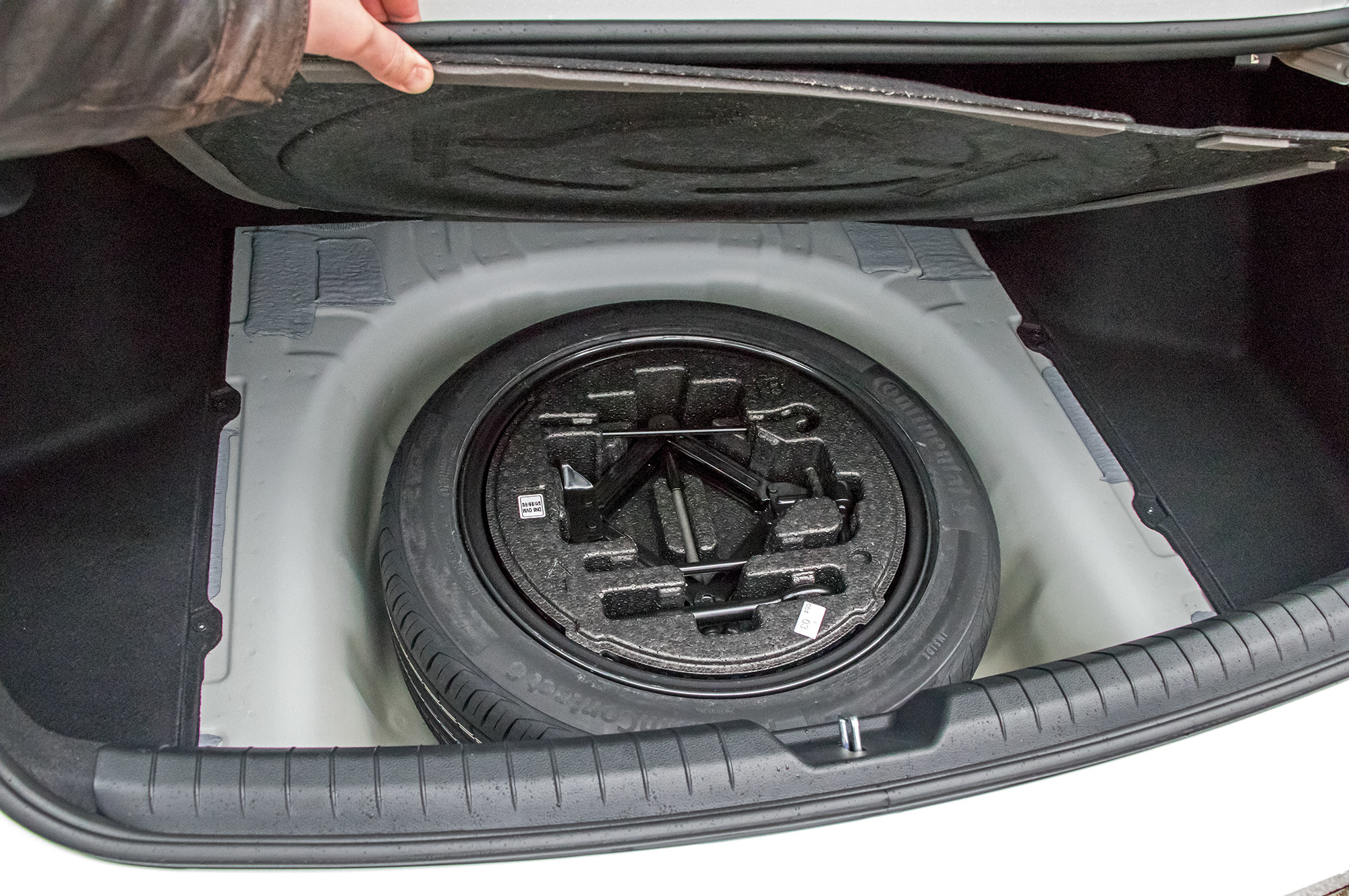 И с грузового отсека знакомство с машиной лучше не начинать. Его объём, недорогая отделка и металл под ковриком остались неизменными, как и неширокий лаз в салон при сложенных спинках. Sonata вообще не стала практичнее — всё вложено в супердизайн. Хотя бы ручку для закрывания крышки стоило оставить, тем более что электропривода для неё не предлагается. Хорошо, что не сэкономили на полноразмерной запаске.