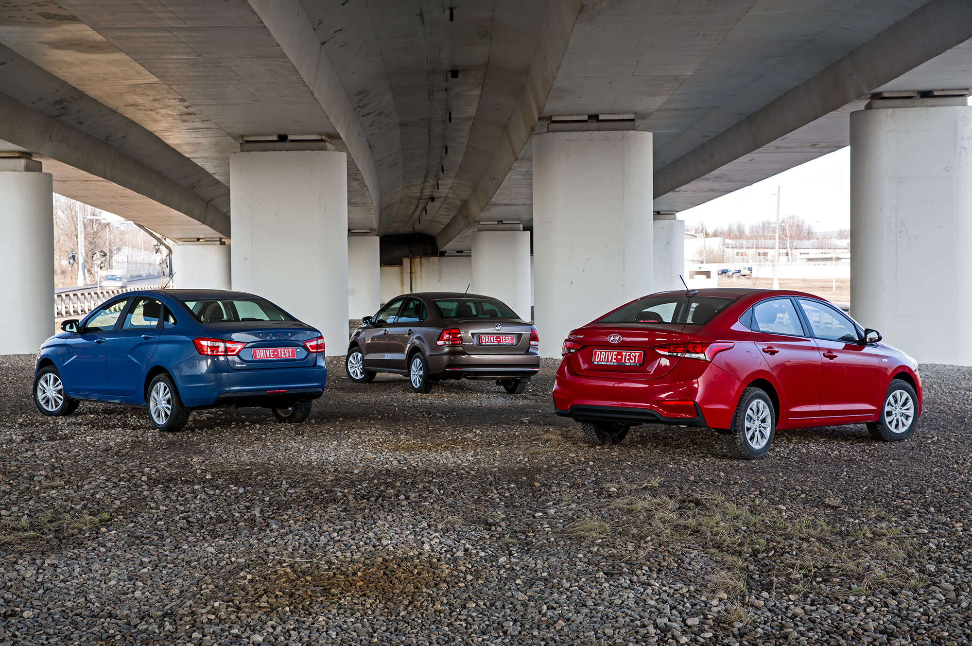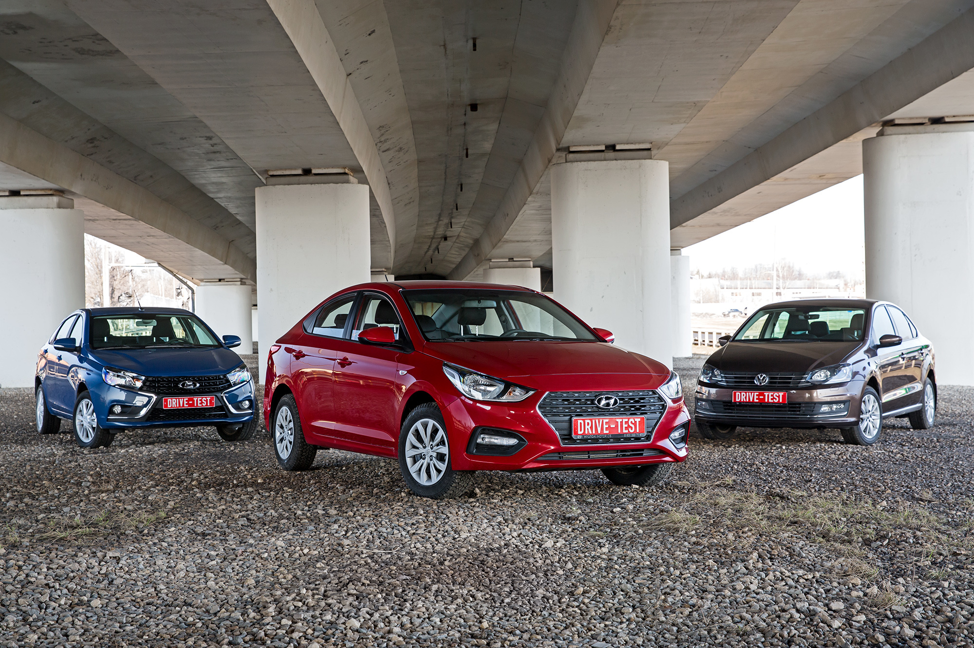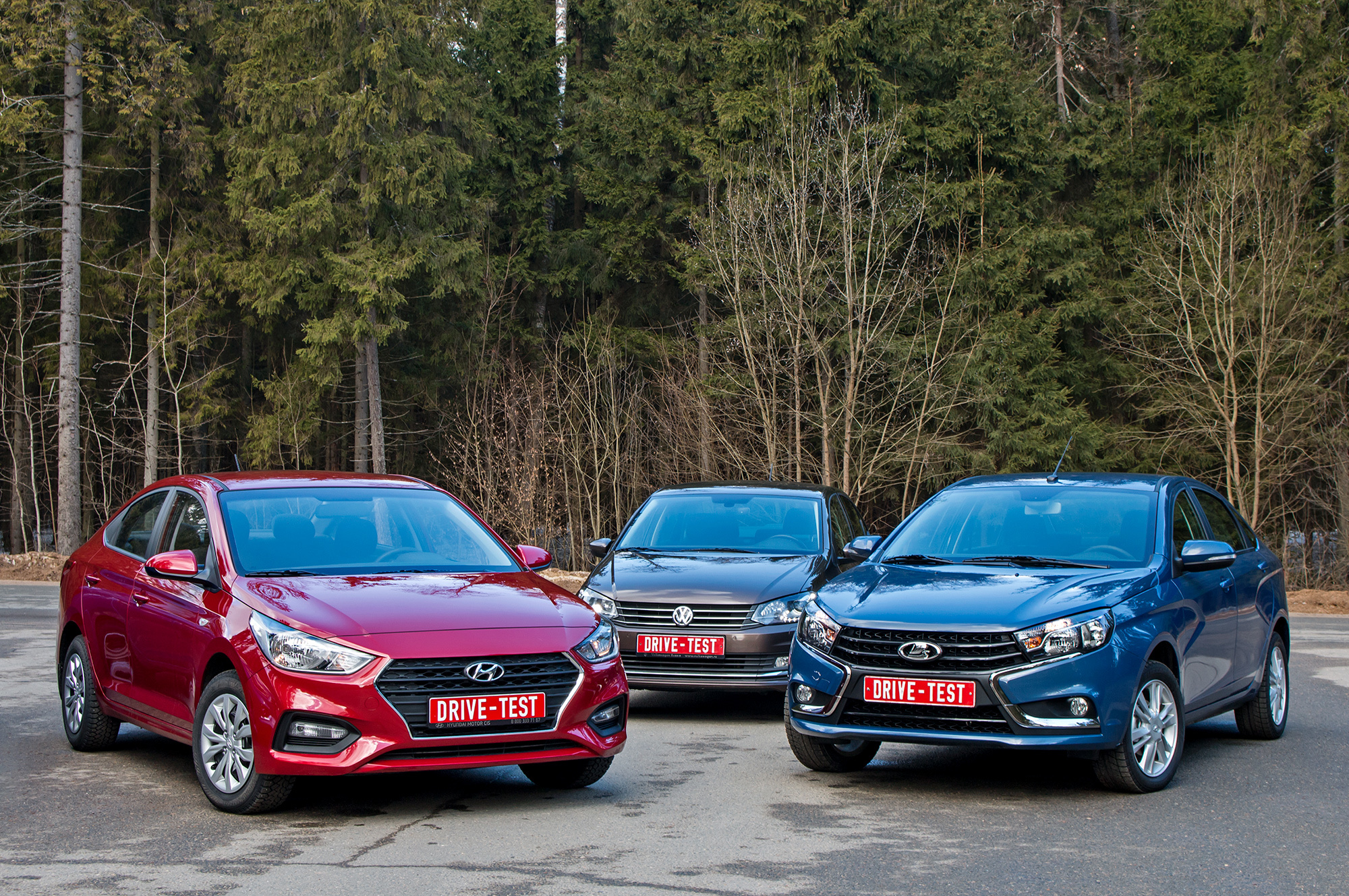 Самый сок управляемости Лады и Hyundai в том, что насладиться ею можно и на неровностях, хотя лучшая «городская» плавность хода — у Фольксвагена. Мелкие и средние ямы со стыками Polo разглаживает благородно, иной раз с породисто-тяжёлым «вздохом» амортизаторов, но случись выбоина покрупнее — и калужский седан пасует вплоть до пробоев. Самым страшным ударам на ямах лучше всех противостоит Веста, но на зрительно ровной дороге её подвеска воспринимается наиболее жёсткой. А у Hyundai — золотая середина: проигрыш Ладе в энергоёмкости незначительный, а дорожные углы Solaris скругляет лучше Весты.