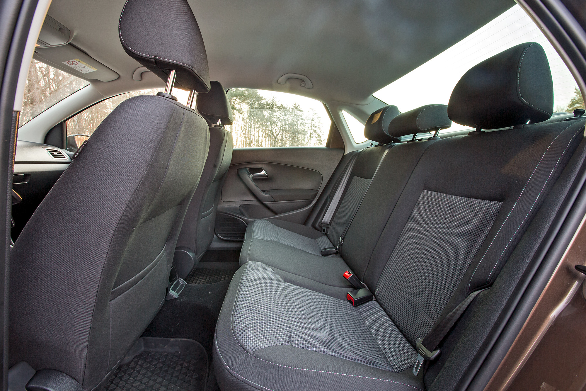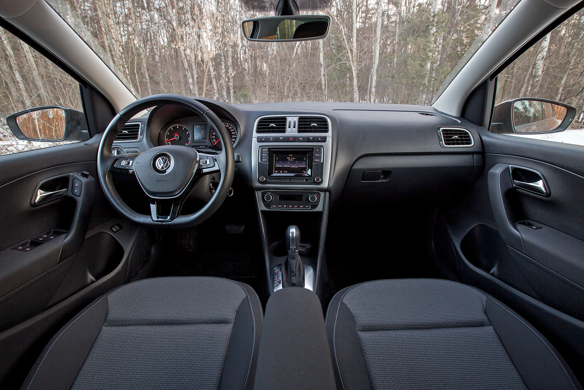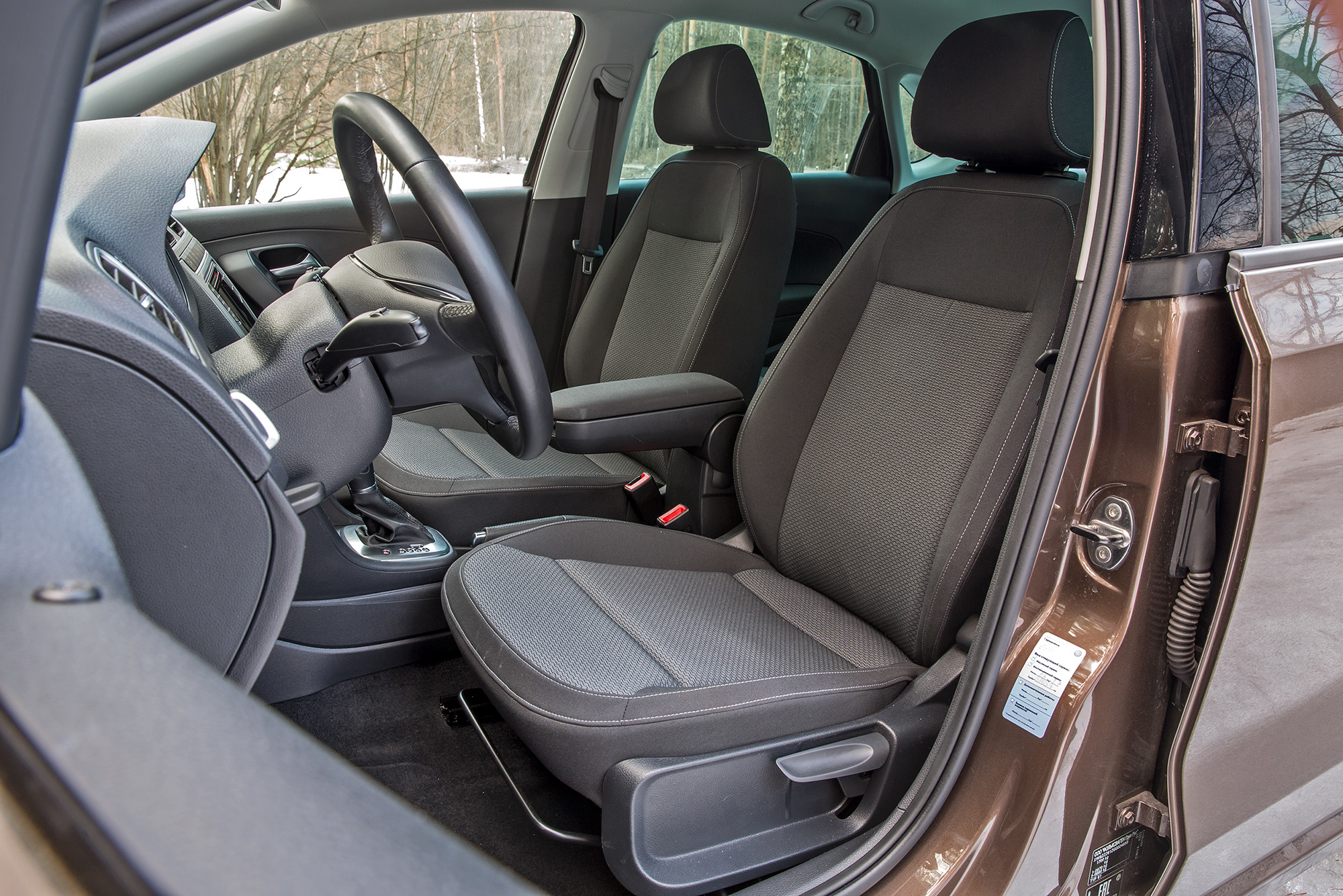 В Polo рослому человеку усесться сложнее: мешает средняя стойка и высокий порог. Дверь чётко фиксируется в трёх промежуточных положениях — её сложнее приложить об соседнюю машину, чем вестовскую. Кресло здесь лучше вазовского только подушкой: она длиннее и с более выраженной боковой поддержкой. Но поясничного подпора не хватает. Сенсорный экран понятнее, чем в Весте, но расположен ниже и в нашем случае не имеет камеры заднего вида. Тут классные приборы, больше места для мелочей, удобнее центральный подлокотник, но кнопки климат-контроля мелкие, пластик передней панели дёшево блестит, а обивка дверей лишена мягких вставок.