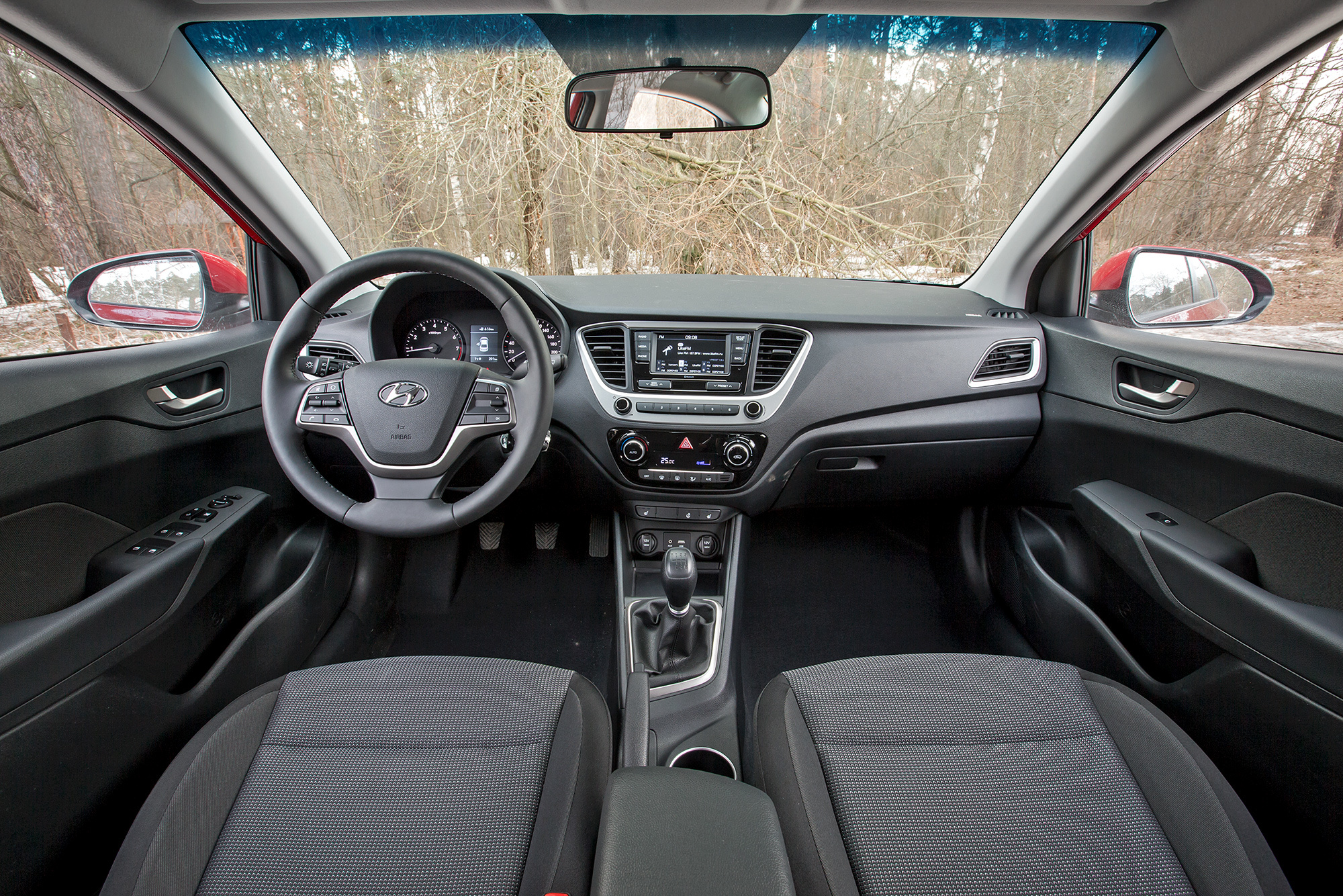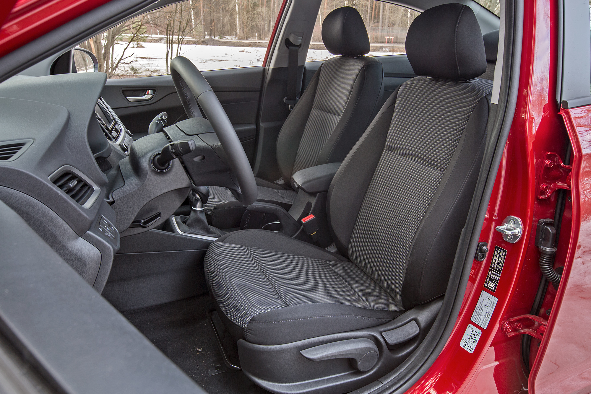 В Солярисе удобство входа-выхода среднее между Вестой и Polo: низкая крыша, высокий порог. Кресло водителя понравилось меньше всего: подушка коротка, спинка выгнута дугой и оставляет плечи на весу — сидишь сгорбившись. Центральный бокс-подлокотник удобен на машине с «автоматом», а вот в случае со сдвинутым назад рычагом «механики» может мешать локтю при включении чётных передач. Также рослые водители жалуются на острую грань центрального тоннеля, в которую упирается голень. В остальном с эргономикой порядок, а отделка на вид приятнее, чем в Polo и тем более в Весте.