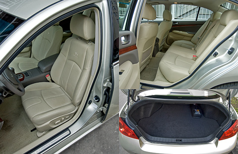 Но чудес, увы, не бывает. Как и в случае с Honda Legend, в G35x не удалось заставить светлый пластик отделки выглядеть дорого. Да и африканское палисандровое дерево настоящее только на передней панели. А на дверях и центральной консоли — замаскированный под него пластик. Эх, а ведь другое сочетание материалов, доступное для G35x, — чёрный пластик, чёрная же кожа и алюминий — смотрится куда богаче.