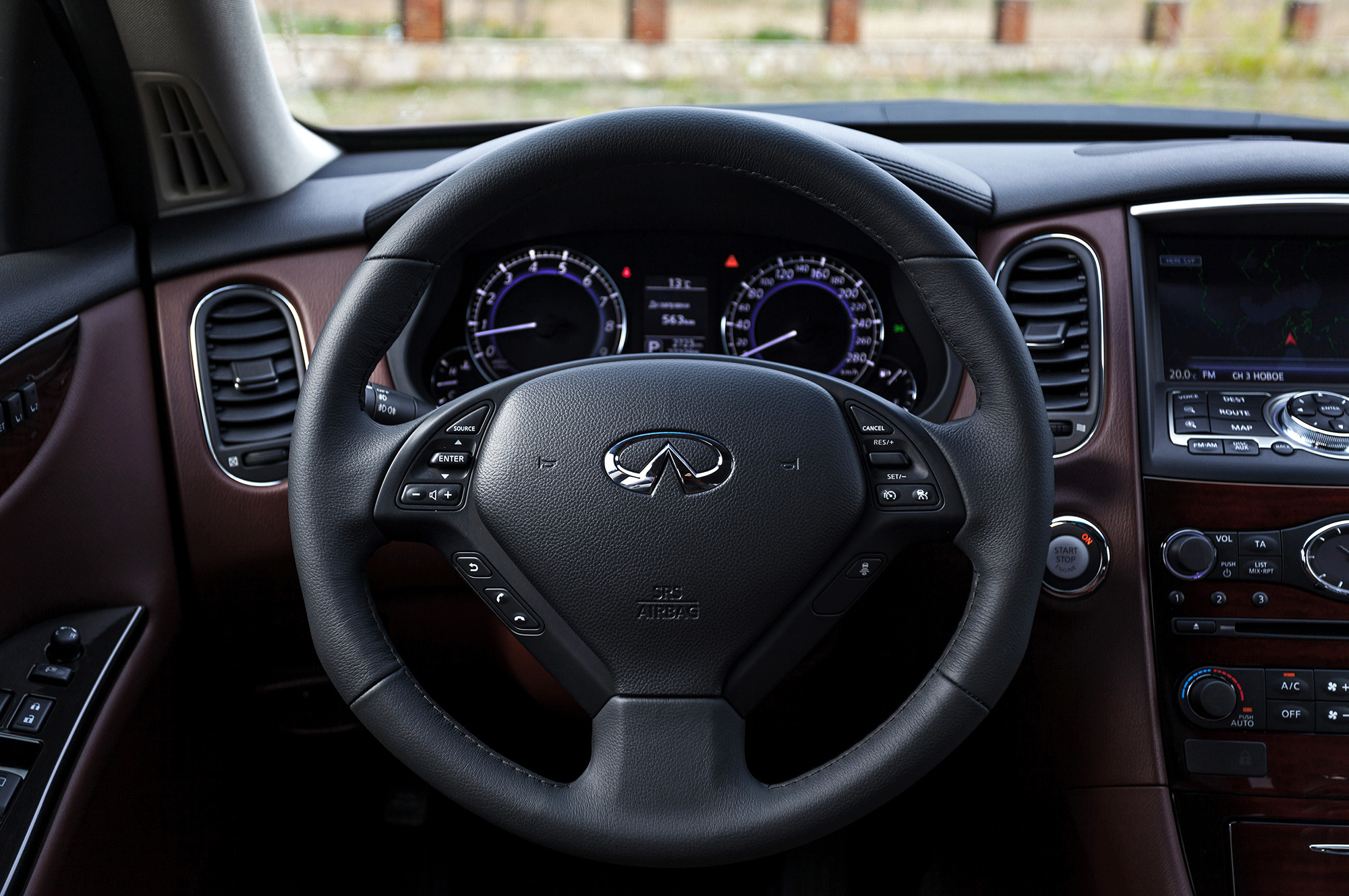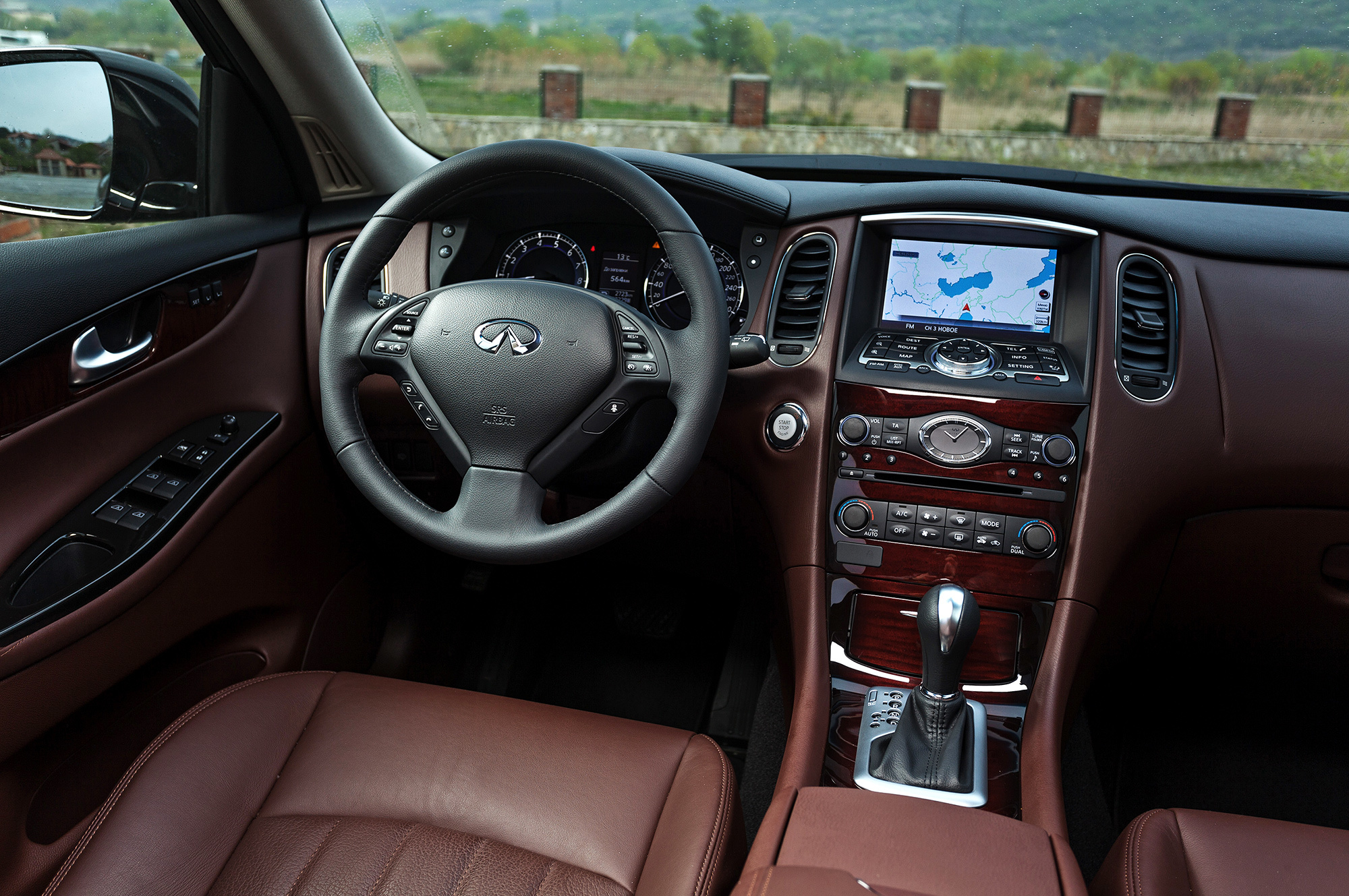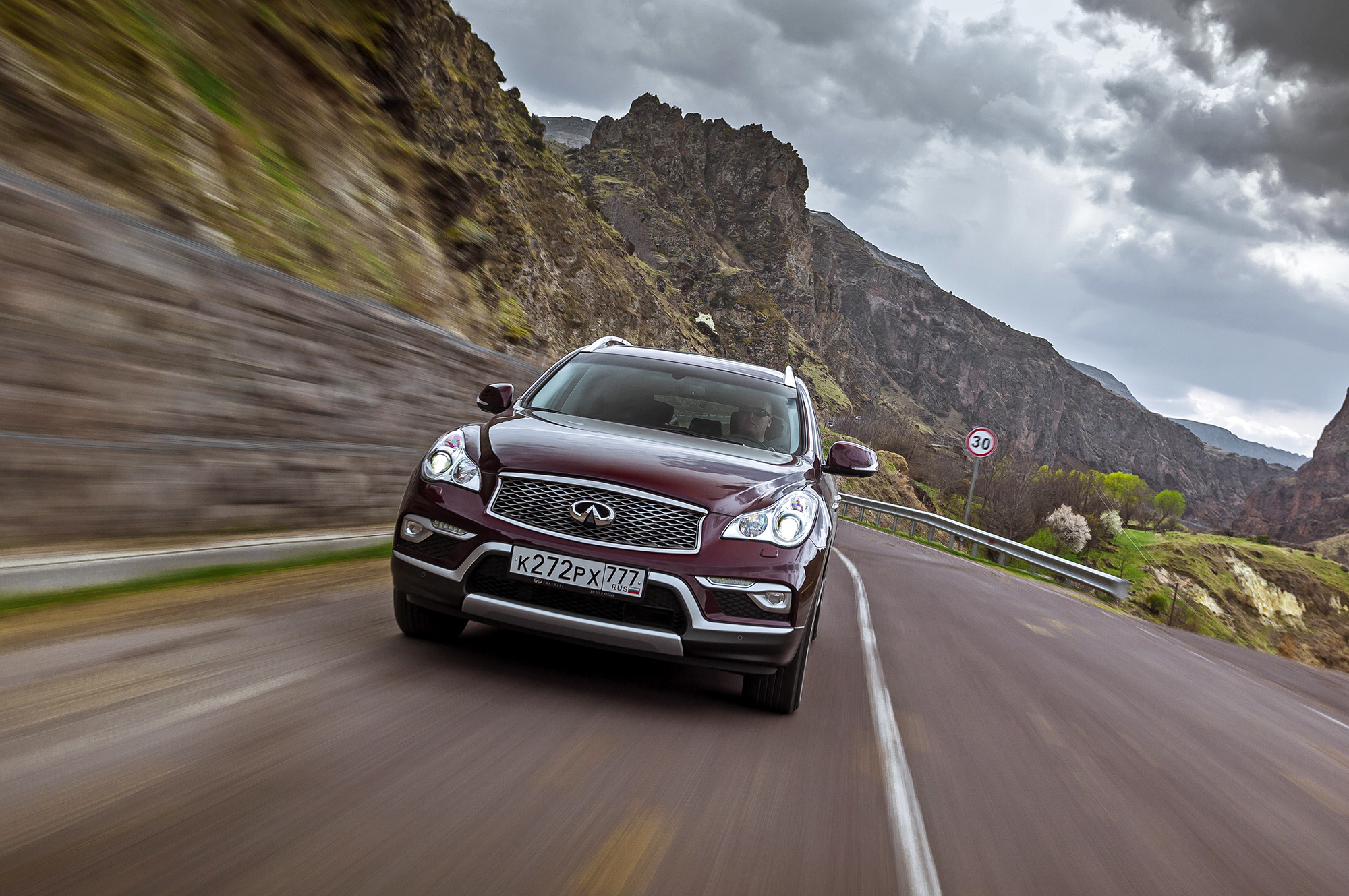 Водительское место исполнено в традициях девичьего высокосидения и далекоглядения. Кресло хочется опустить — нельзя. Верзила ростом более 190 см уткнётся головой в противосолнечный козырёк. Руль регулируется в обоих направлениях по чуть-чуть, этого достаточно. Тяжеловесность баранки с гидроусилителем некстати на сверхмалых скоростях, но в тему на трассе. Массивный Infiniti непоколебим на прямой, располагает к быстрой езде. В поворотах QX50 не досаждает кренами и раскачкой. На разномастных грузинских дорогах паркетник держится молодцом, да только аборигены не проявляют к нашему «новому вишнёвому» никакого интереса. Дизайнеры зря старались?