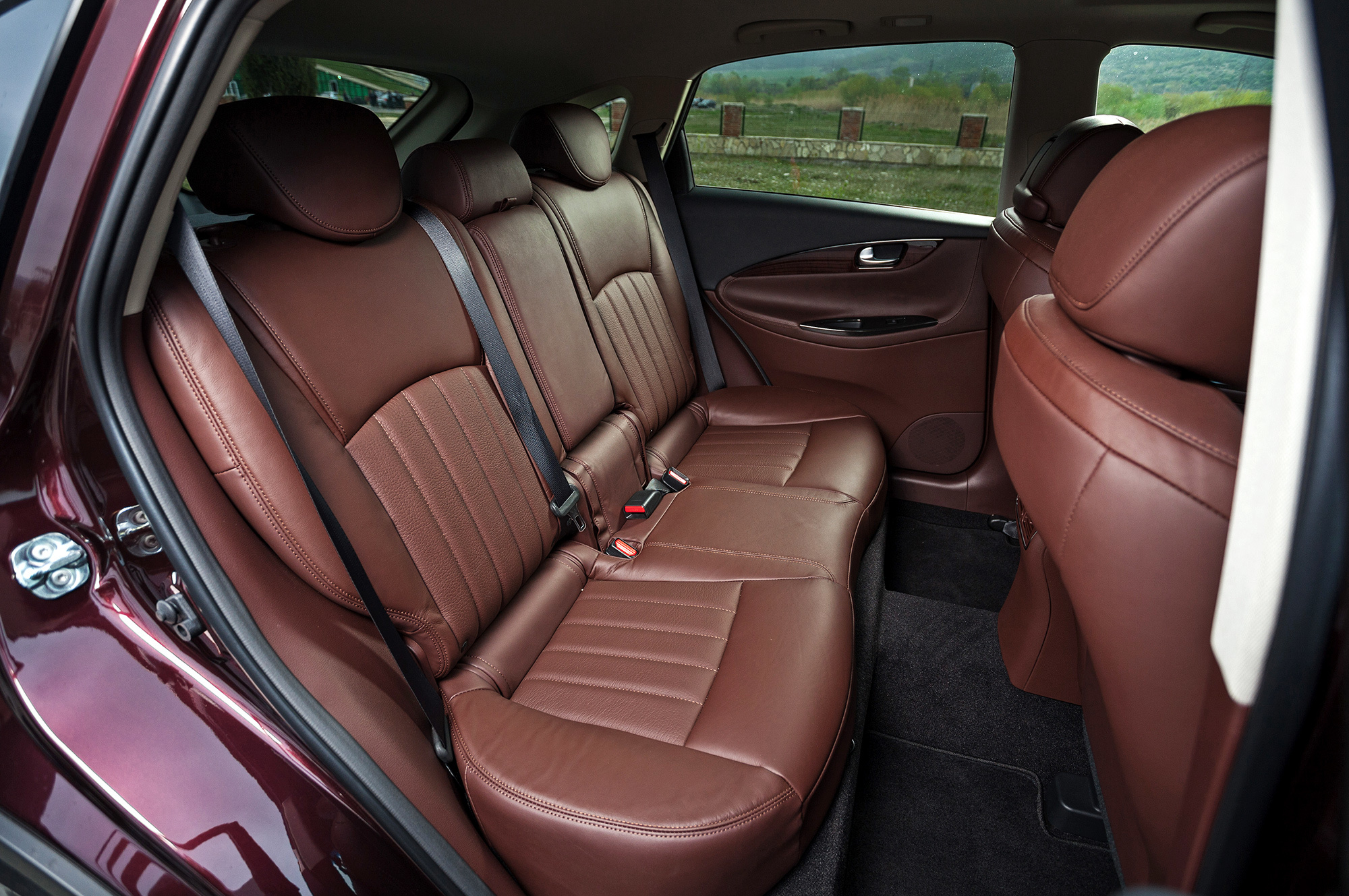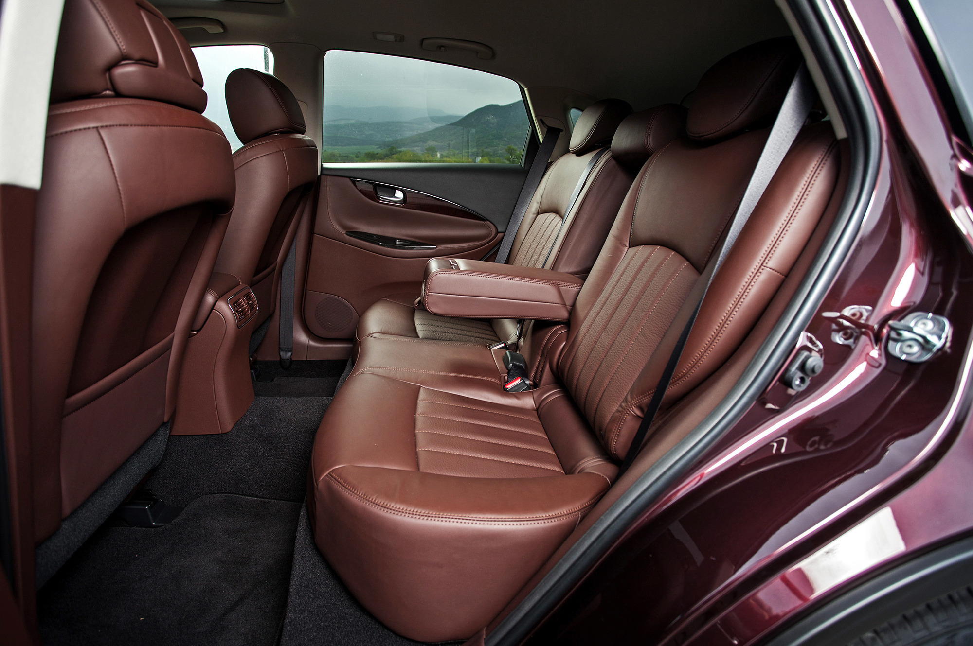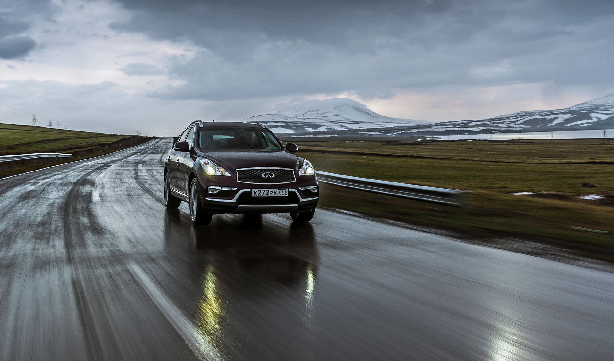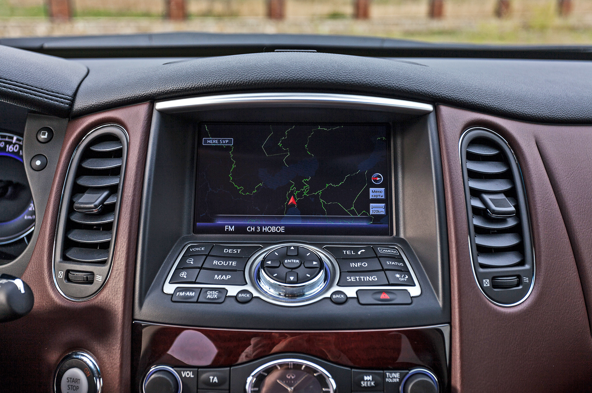 Водительское место исполнено в традициях девичьего высокосидения и далекоглядения. Кресло хочется опустить — нельзя. Верзила ростом более 190 см уткнётся головой в противосолнечный козырёк. Руль регулируется в обоих направлениях по чуть-чуть, этого достаточно. Тяжеловесность баранки с гидроусилителем некстати на сверхмалых скоростях, но в тему на трассе. Массивный Infiniti непоколебим на прямой, располагает к быстрой езде. В поворотах QX50 не досаждает кренами и раскачкой. На разномастных грузинских дорогах паркетник держится молодцом, да только аборигены не проявляют к нашему «новому вишнёвому» никакого интереса. Дизайнеры зря старались?