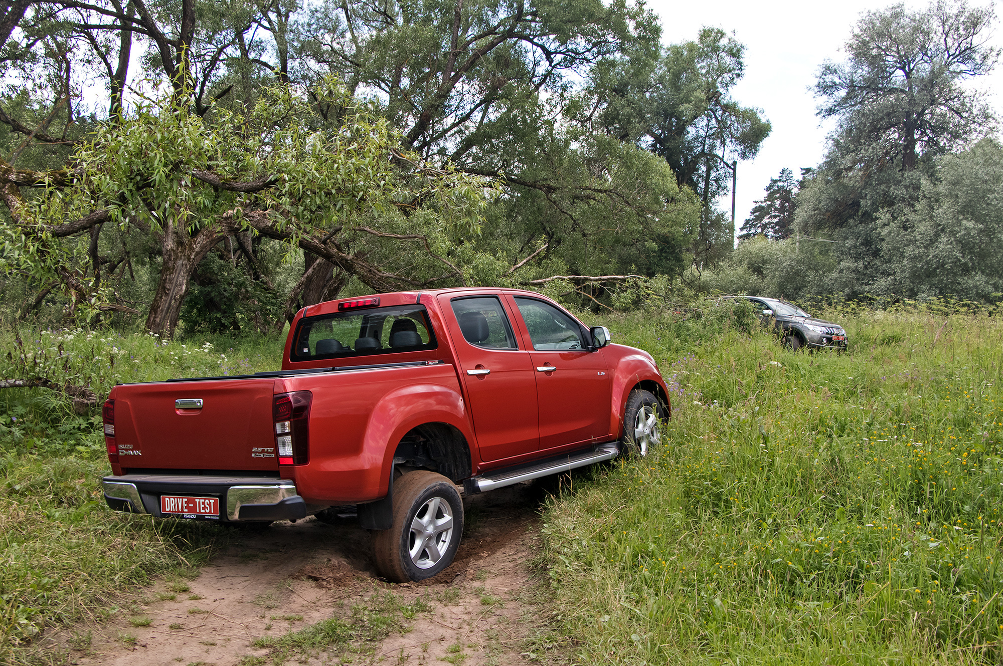Передаточные числа пониженных ступеней в «раздатке» у наших пикапов схожи, в районе 2,5:1. Глубина преодолеваемого брода ― тоже: 600-700 мм по разным данным. Скромность трансмиссионных возможностей Isuzu отчасти компенсируется геометрией: под балкой заднего моста у Ди-Макса с 17-дюймовыми колёсами ― аж 235 мм, на три сантиметра больше, чем у L200. Однако в реальной жизни Isuzu здорово мешает красивый задний бампер, ограничивающий угол съезда. Даже несколько большая артикуляция мостов у Ди-Макса вынуждает меня признать вне дорог небольшое итоговое преимущество L200.