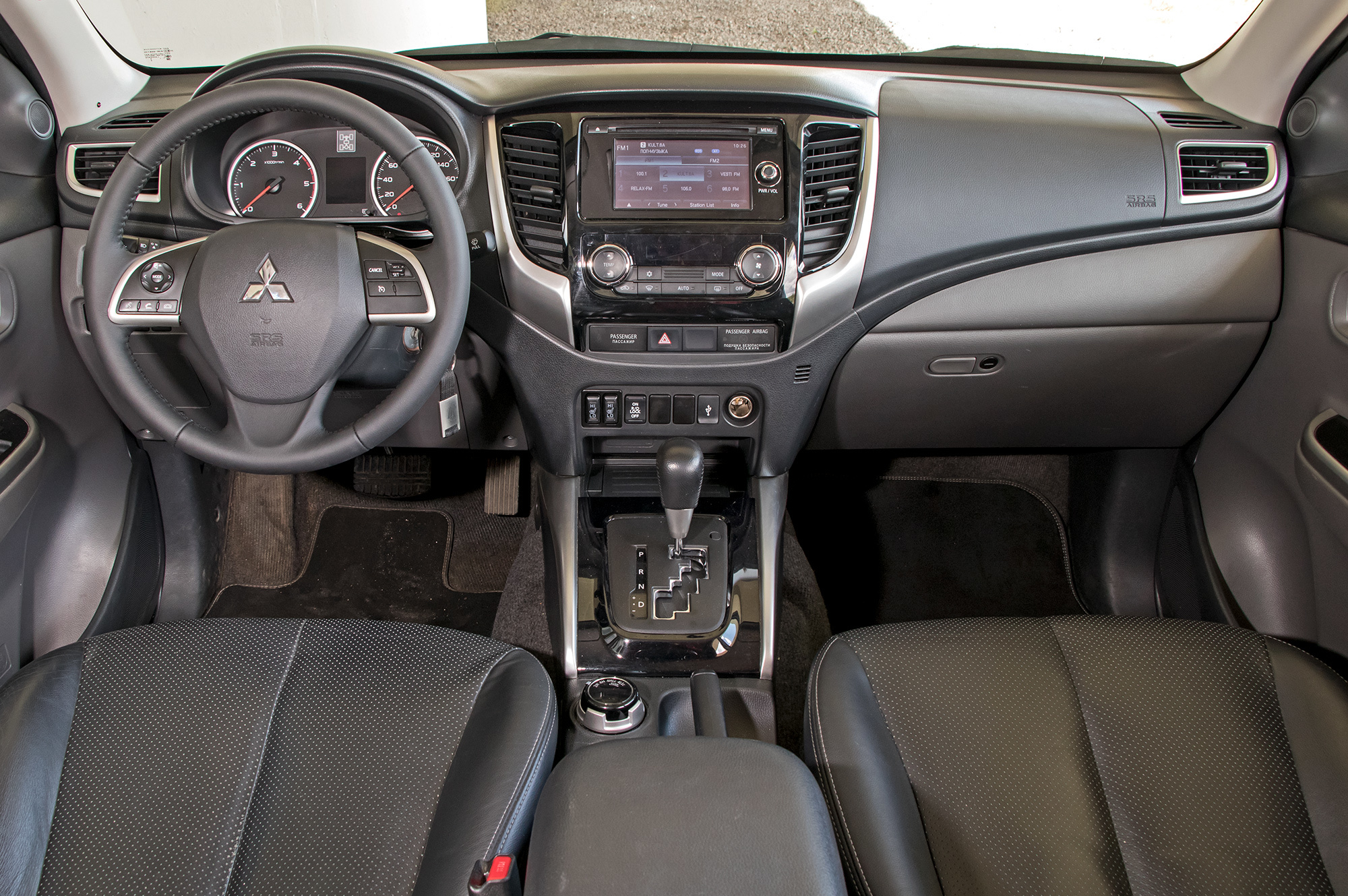 Как же у маленькой грузовой компании получился ладный непрофильный продукт? Просто это глобальный джиэмовский пикап Chevrolet Colorado с битурбодизелем Isuzu и оригинальной отделкой! Дитя совместного японско-американского проекта. Заокеанское происхождение выдают простые плоские сиденья, обилие подстаканников, магнитола со старинным матричным экраном. А особенно ― широко расставленные педали и подлокотники, хоть садись в ватнике и кирзачах. Подрулевые переключатели с жёсткой фиксацией и брутальный селектор «автомата» заточены под натруженную ладонь. Пластик жёсткий в обеих машинах, но тут он выглядит проще, чем в Mitsubishi.