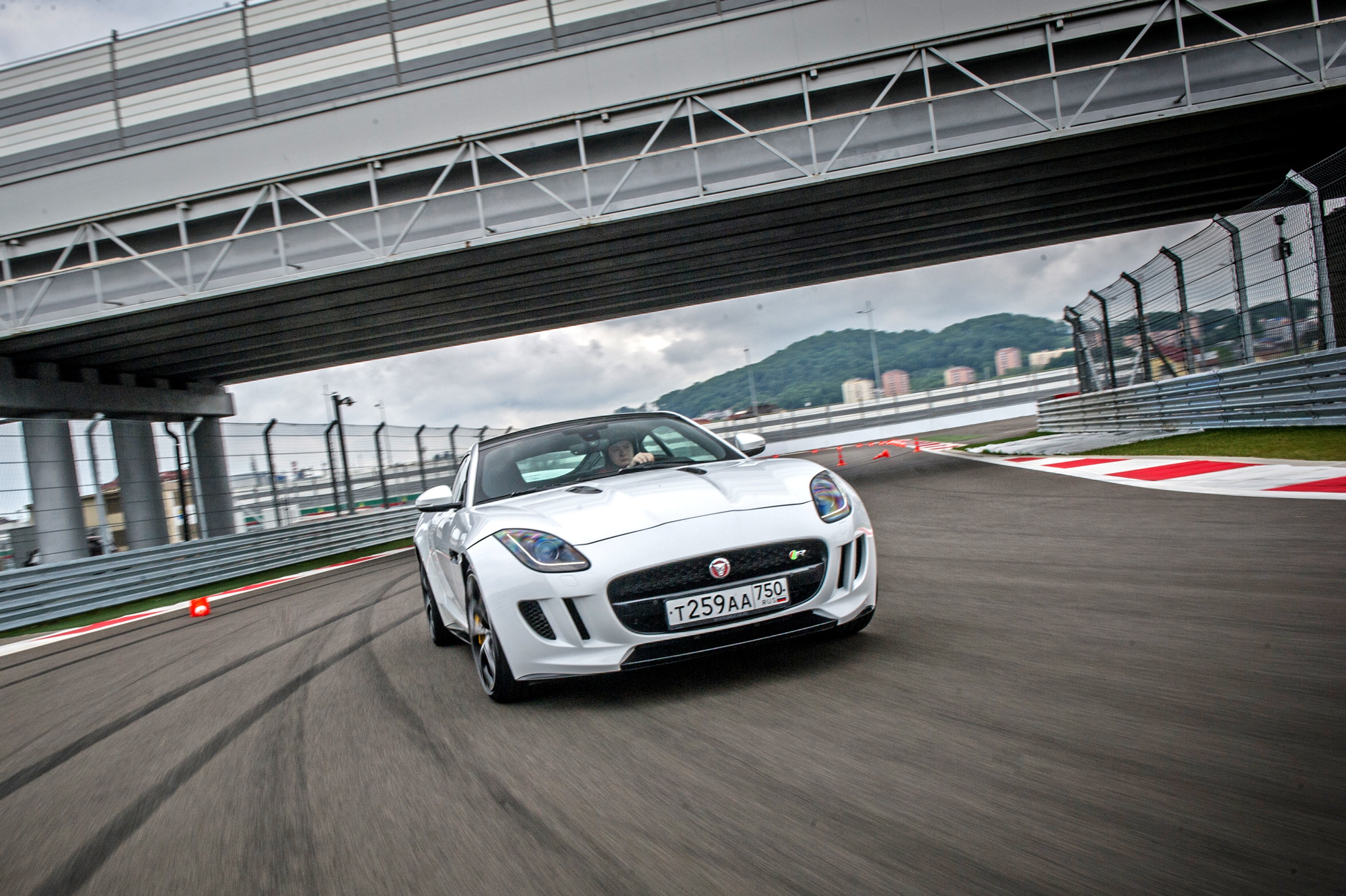 Трансмиссия фирмы Magna с многодисковой муфтой в приводе передней оси появилась у «эф-тайпов» ещё прошлой осенью, но продажи таких машин стартовали только нынешней весной. На полноценную премьеру не потянуло: бенефис полноприводных Ягуаров объединён с показом внедорожника Range Rover Sport SVR. Как вы помните, погодка на автодроме в Сочи — самая что ни на есть полноприводная. Льёт. На выбор — 380-сильная модификация F-type S и 550-сильная «эрка». Обе с восьмиступенчатыми «автоматами» ZF, а R-версия ещё и с углеродокерамическими тормозами.