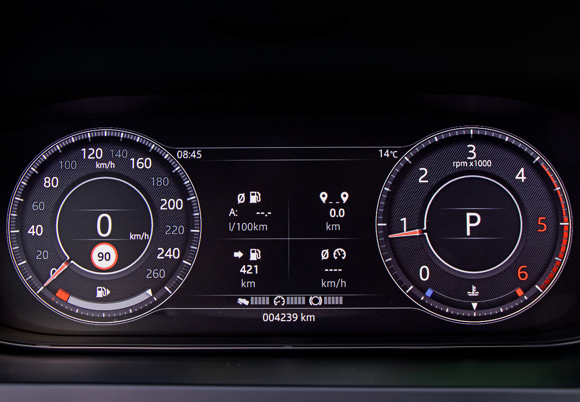 С водительскими креслами в Ягуарах у меня давняя история нелюбви, и E-Pace не исключение. Что обычное сиденье, что кресло версии R-dynamic c иной формой спинки одинаково пихают валиком непонятного предназначения в район лопаток. Остаётся сидеть ссутулившись. Левая нога пытается найти удобное положение на бесформенной подножке. Зато круглый руль хорош, а кнопка пуска двигателя на виду. Жму!