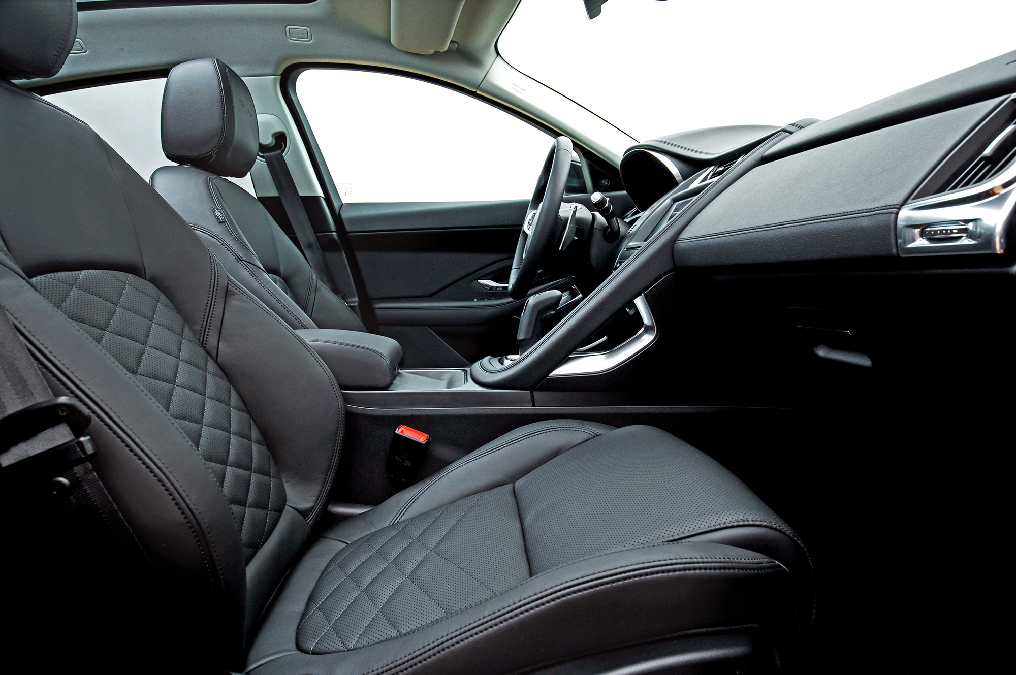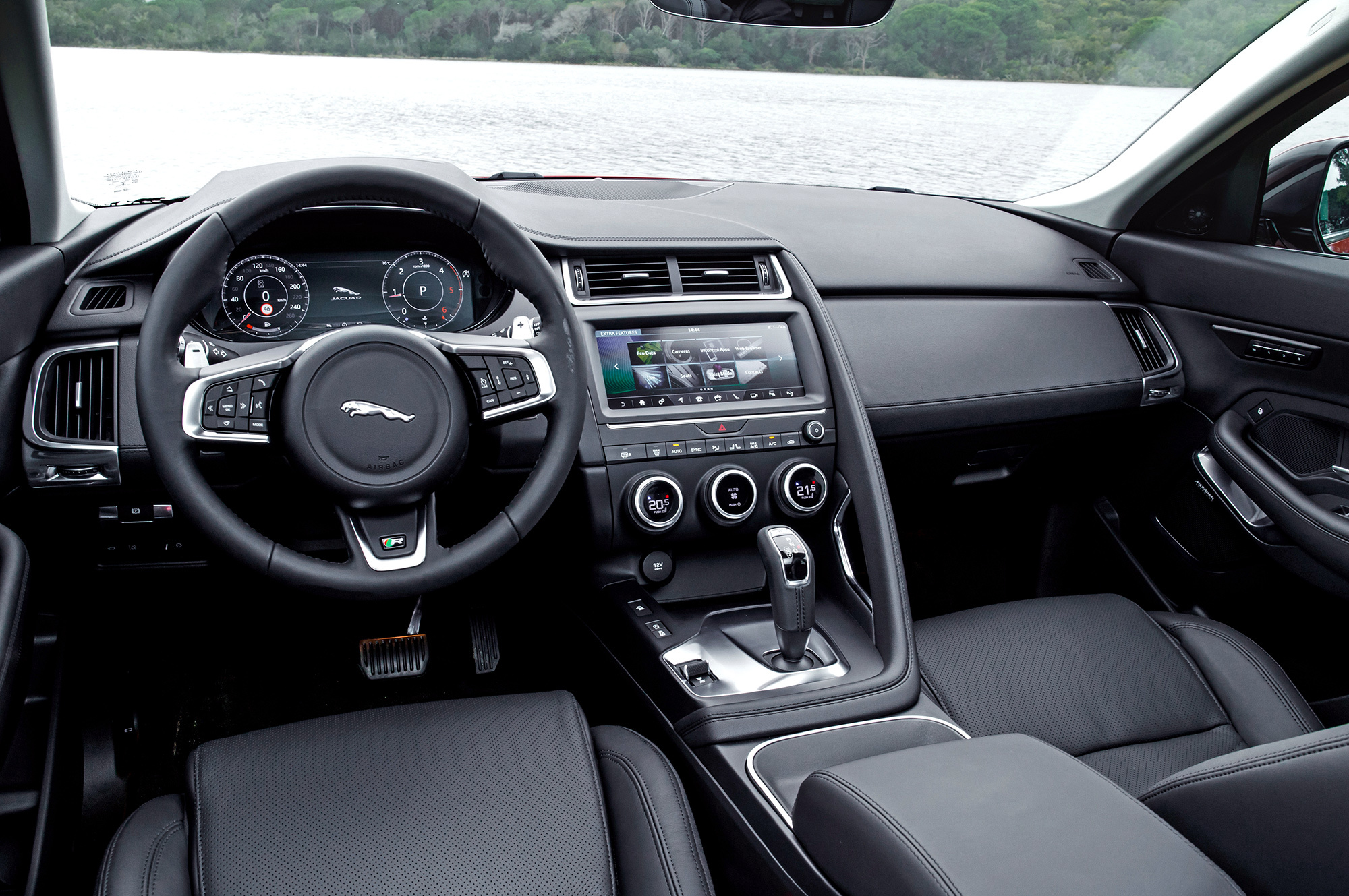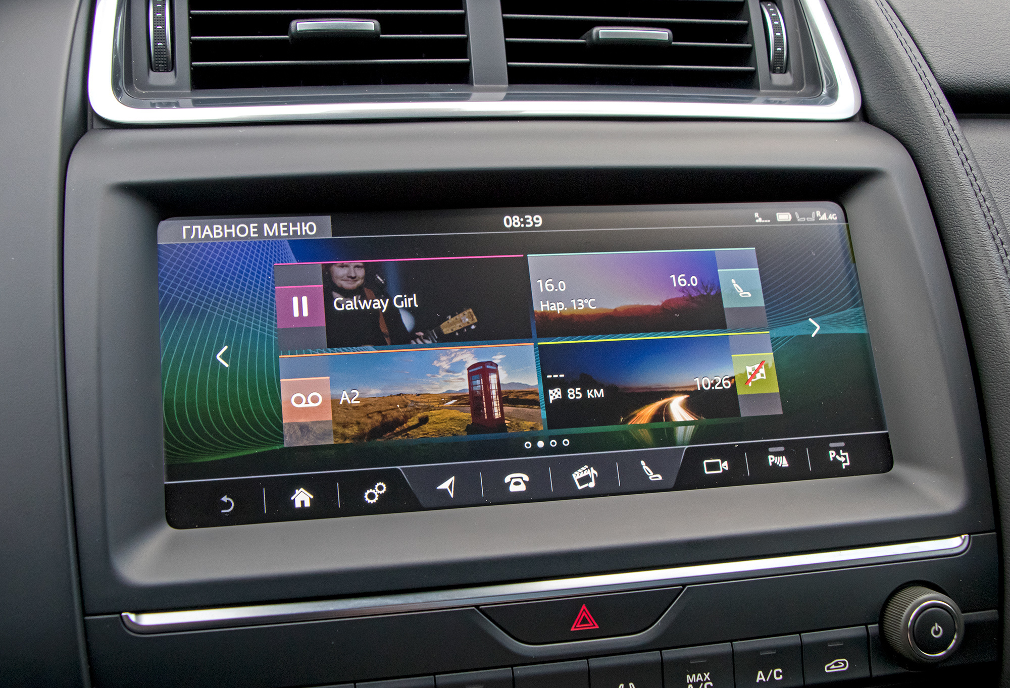 Визуально интерьер приятен. Собрано всё монолитно, и ощущение качества здесь выше, чем в более крупном кроссовере F-Pace. Пользоваться массивными регуляторами климат-контроля ― одно удовольствие, а обращаться к ним приходится часто, поскольку из дефлекторов дует то льдом, то жаром. Салон усеян гнёздами для зарядки и подключения смартфона к медиасистеме Touch Pro с 10-дюймовым сенсорным экраном. Проворности в откликах ей недостаёт, но жить можно. Как и с опционным электронным щитком приборов ― из мешанины мелких символов быстро привыкаешь выделять только крупное табло цифрового спидометра и индикатора включённой передачи.