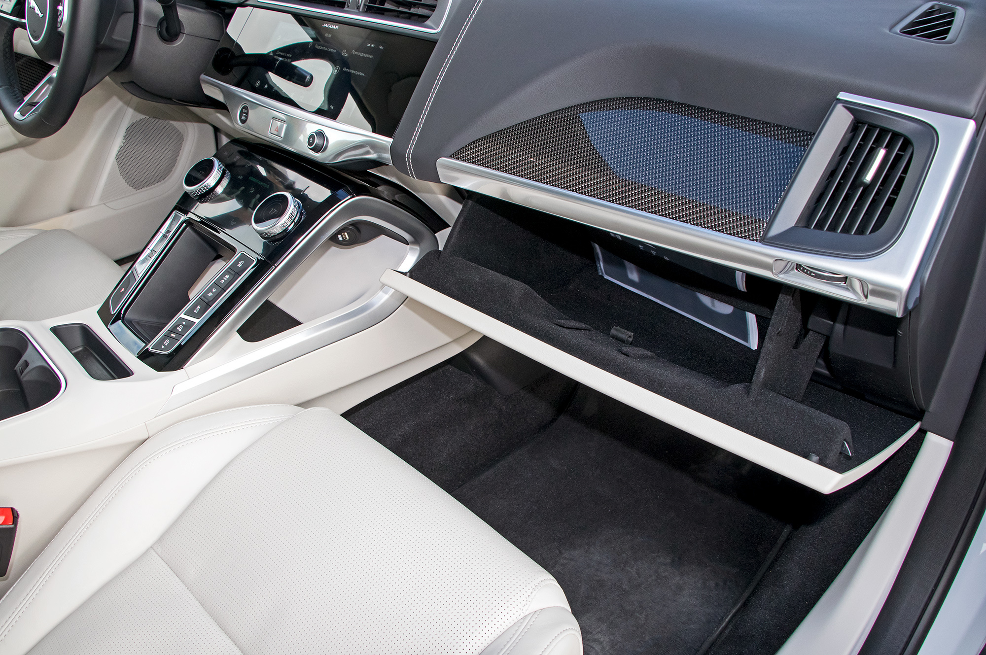 Пусть сидишь на батарее, пол не такой уж высокий. Поза за рулём ― легковая. Кресла, использующие рамы и набивку от кроссовера F-Pace, традиционно для Ягуара неудобны для высоких. Интерфейс с тремя дисплеями позаимствован у Велара, включая тормознутый процессор, ― вход в меню настроек порой занимает секунды три. Но дизайн интерьера хорош, материалы недёшевы, хотя и проще, чем в Веларе.