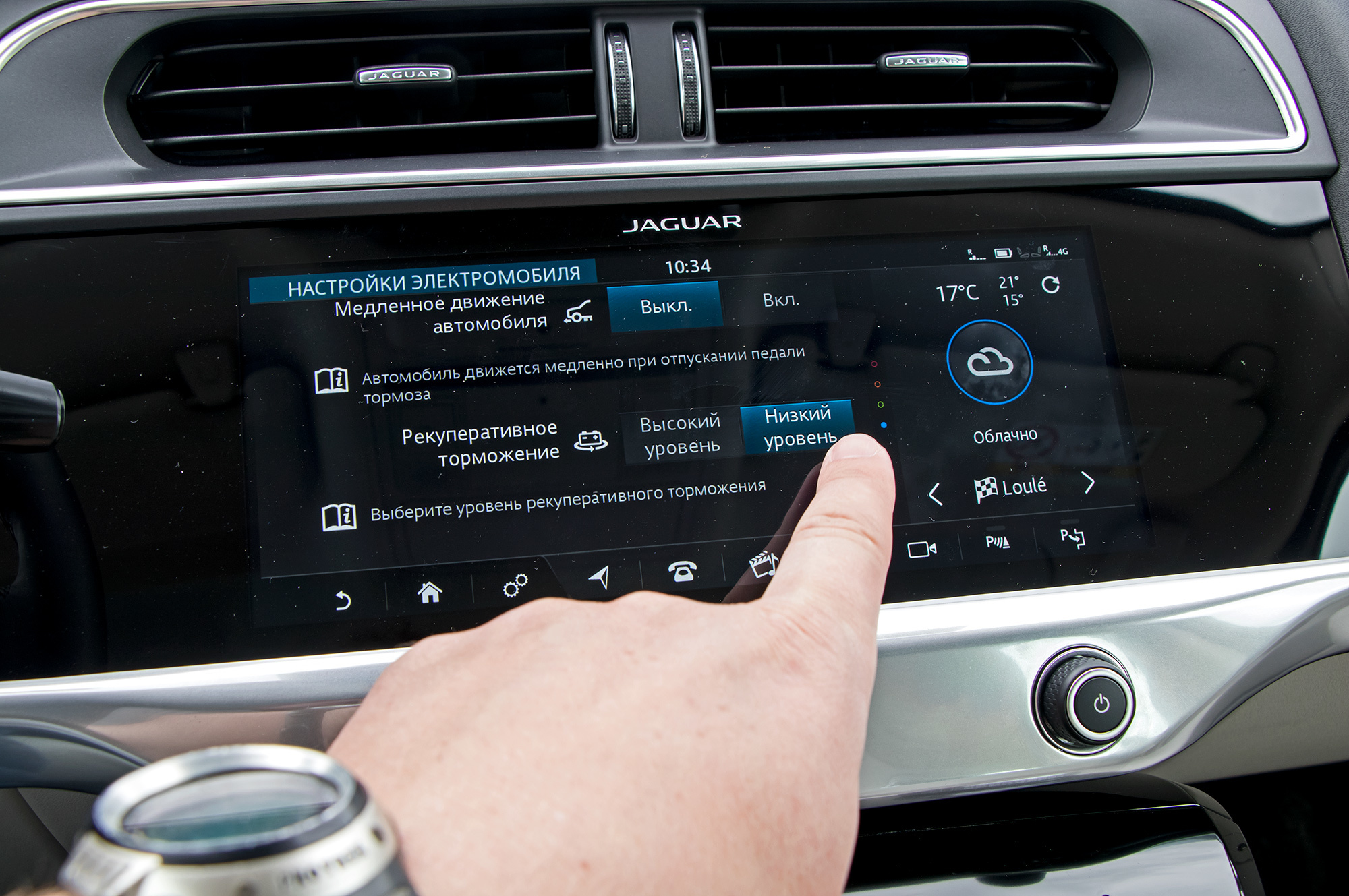 Чтобы тронуться с места, надо поддать «газку» или активировать вялый режим ползания по пробкам в дебрях медиасистемы. Там же переключаются и режимы рекуперации. В обычном Jaguar сбрасывается как карбюраторная машина при торможении двигателем ― с замедлением до 0,2g. Но его можно увеличить вдвое ― это вернёт максимум возможной энергии в батарею. Здесь акселератор надо отпускать крайне нежно, чтобы пассажиры не качали головами. Мне надоело напрягать ногу за десять минут. Зато так можно ездить, практически не трогая тормоз, а главное — продемонстрировать запас хода в 480 км при замерах по новому циклу WLTP.
