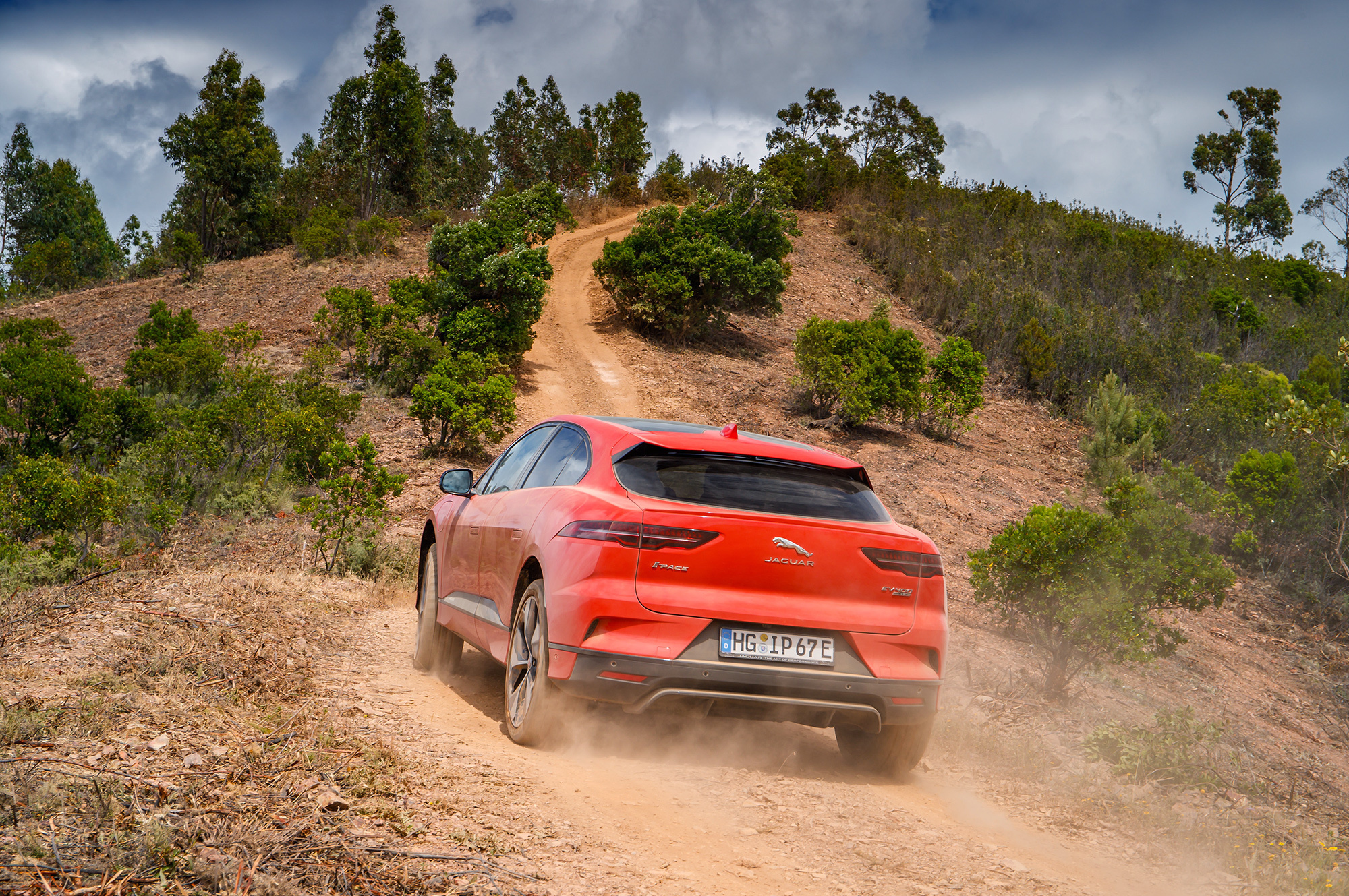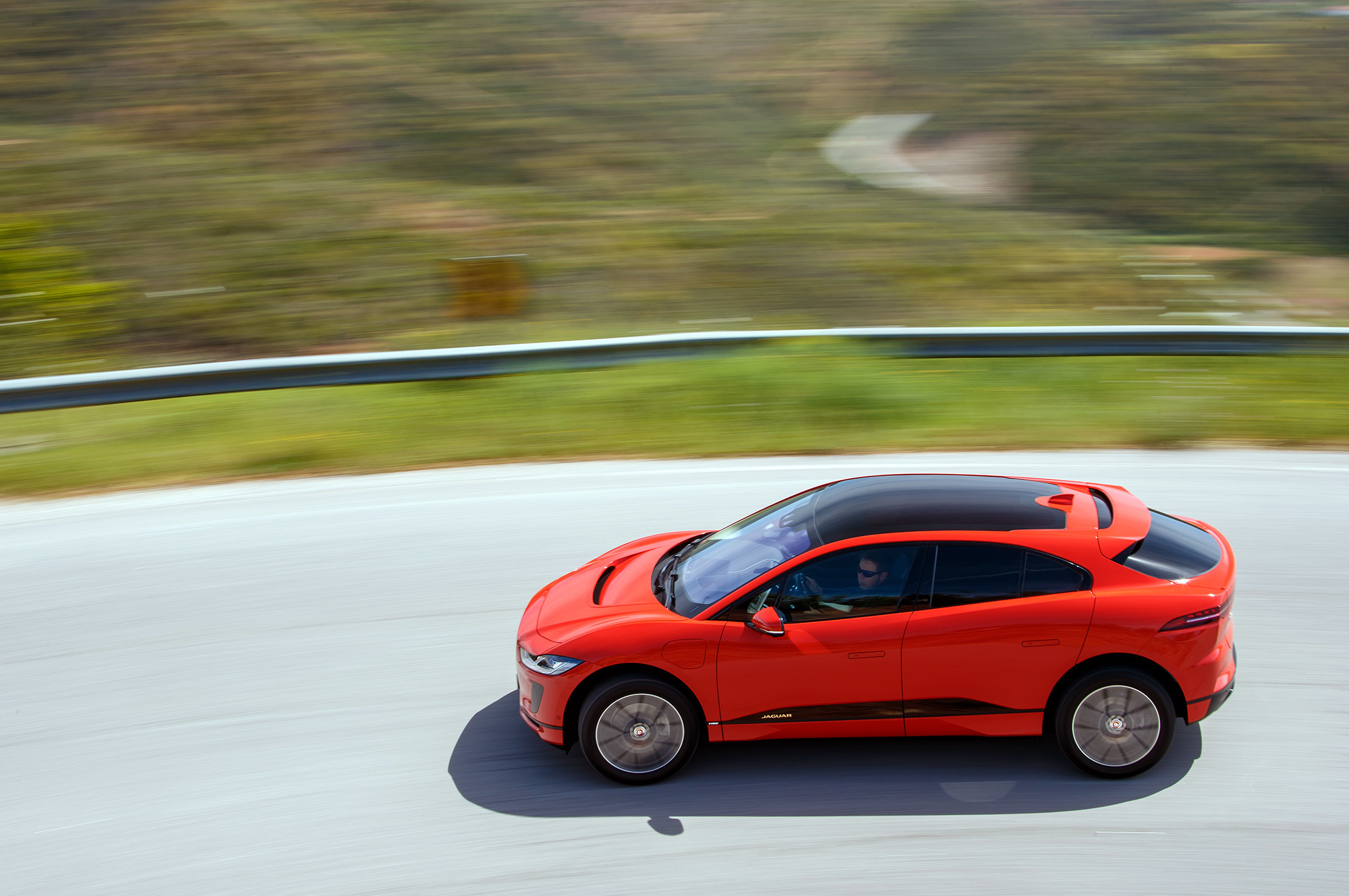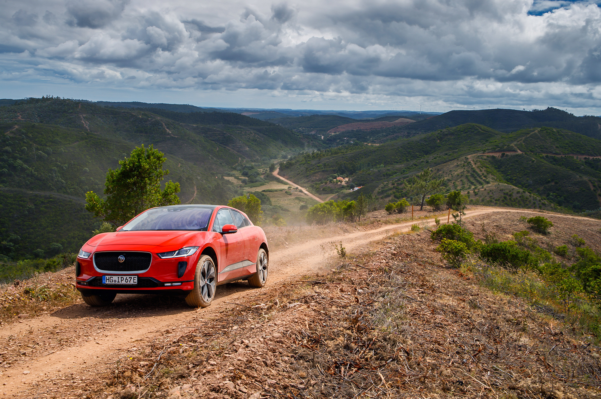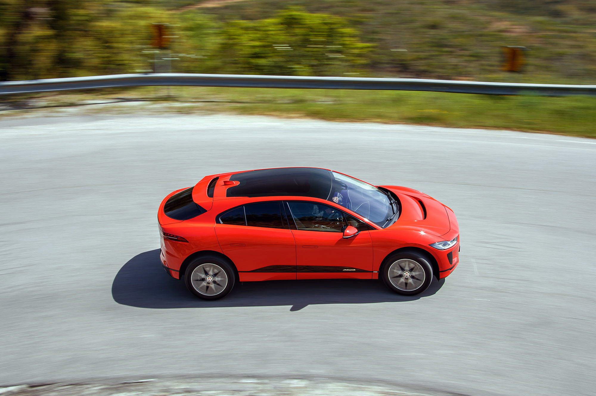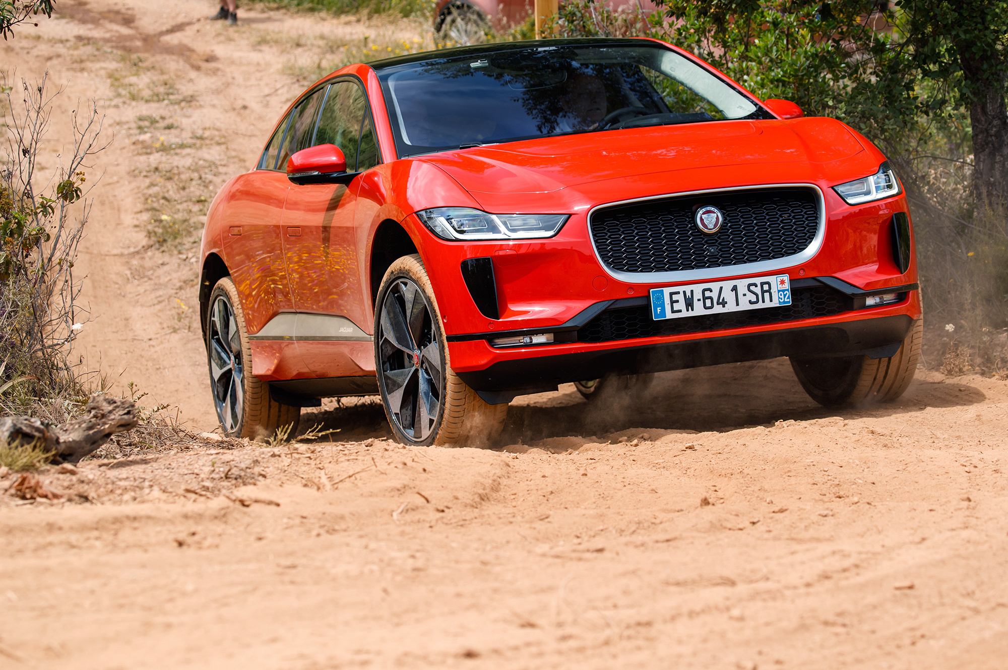 Если оставить запас по скорости, I-Pace очаровательно послушен на входе в поворот. Без малейшей задержки и крена он становится на дугу ― такая отзывчивость недостижима для обычных автомобилей с привычно высоким центром масс. У кроссовера F-Pace он выше аж на 130 мм, чем у электрокара! Ай-Jaguar отлично доруливается малейшим движением акселератора. Секрет прост ― тяговый момент развивает в первую очередь задний мотор-генератор, а рекуперативно-тормозной приложен в основном к передним колёсам. На гравии такая концепция приводит даже к чрезмерно охотному заныриванию внутрь под сброс: надо привыкать. Но fun есть!