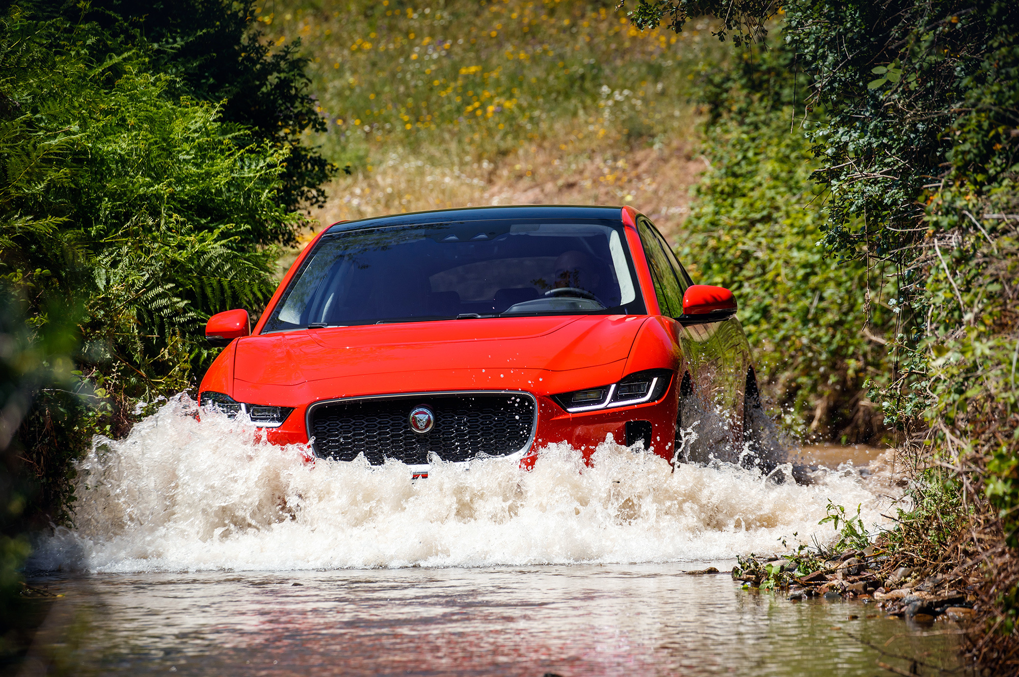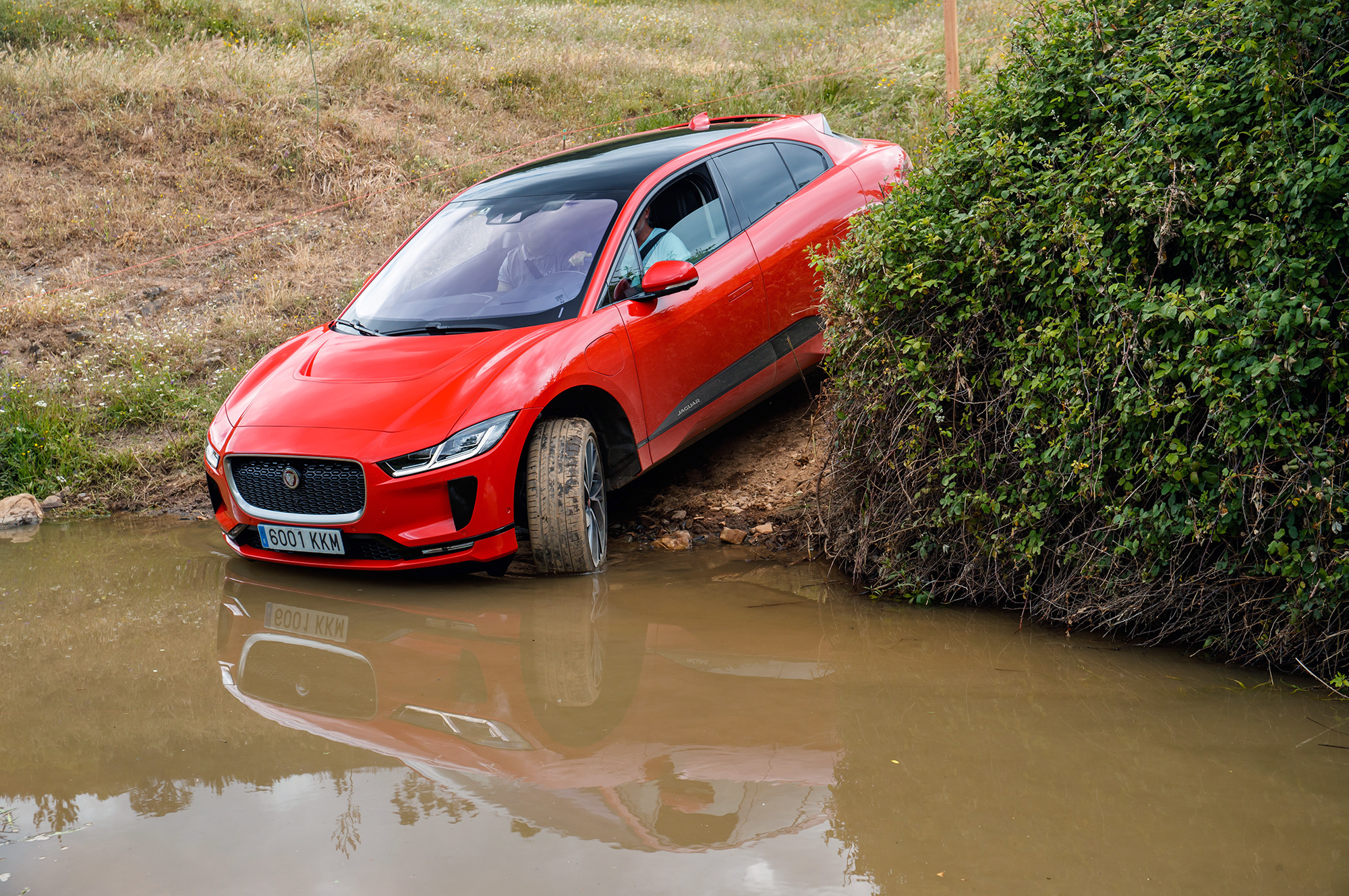 Тем не менее Jaguar претендует на лавры самого проходимого электромобиля. Производитель называет I-Pace кроссовером — привод-то полный. Но дорожный просвет не превышает 165 мм на стальных пружинах, а на пневматических меняется в диапазоне до 204 мм при базовых 154 мм. Помогает электроника. Правда, внедорожный круиз-контроль сам порой обалдевает от доступных с первого оборота 700 Н•м ― и дёргает машину на переменном покрытии. Зато ходы подвески велики. А столь жёсткого кузова у серийных автомобилей я никогда не встречал: на диагональном вывешивании перекос проёма задней двери на глаз и на ощупь не обнаружить.