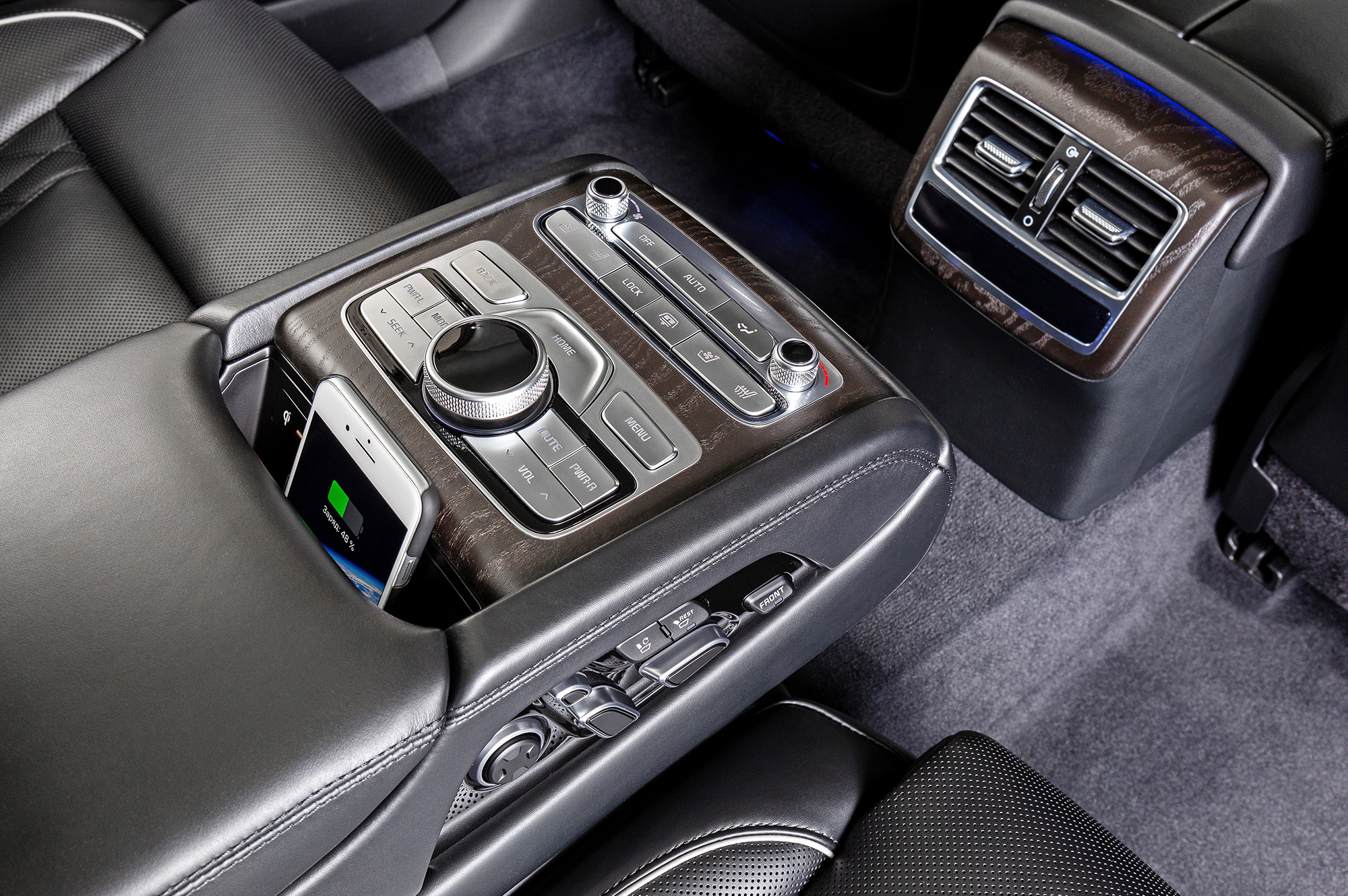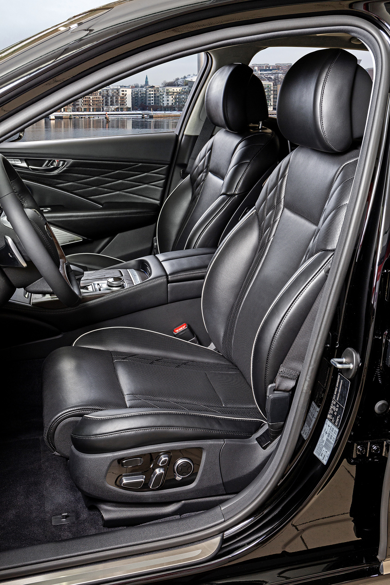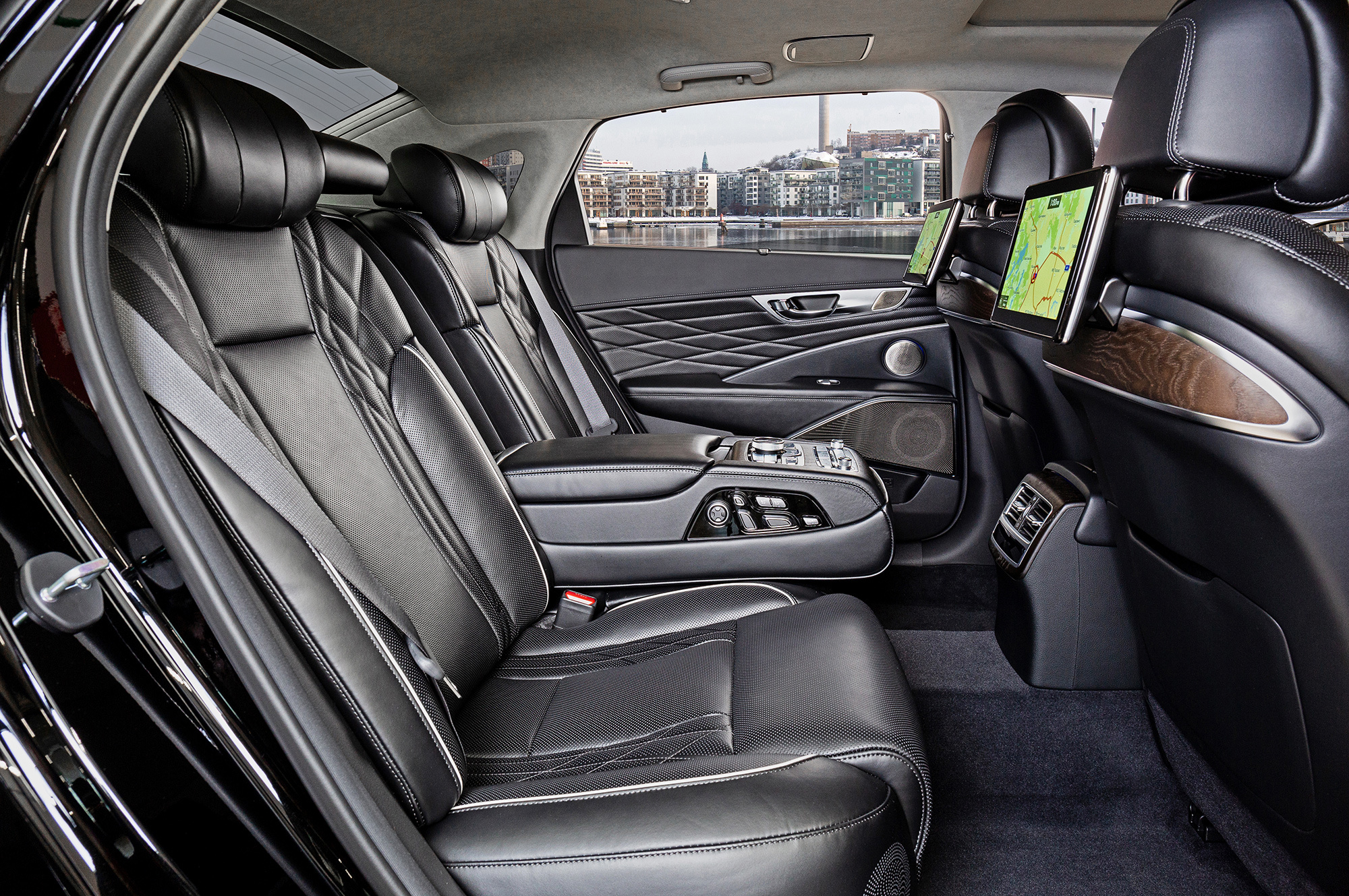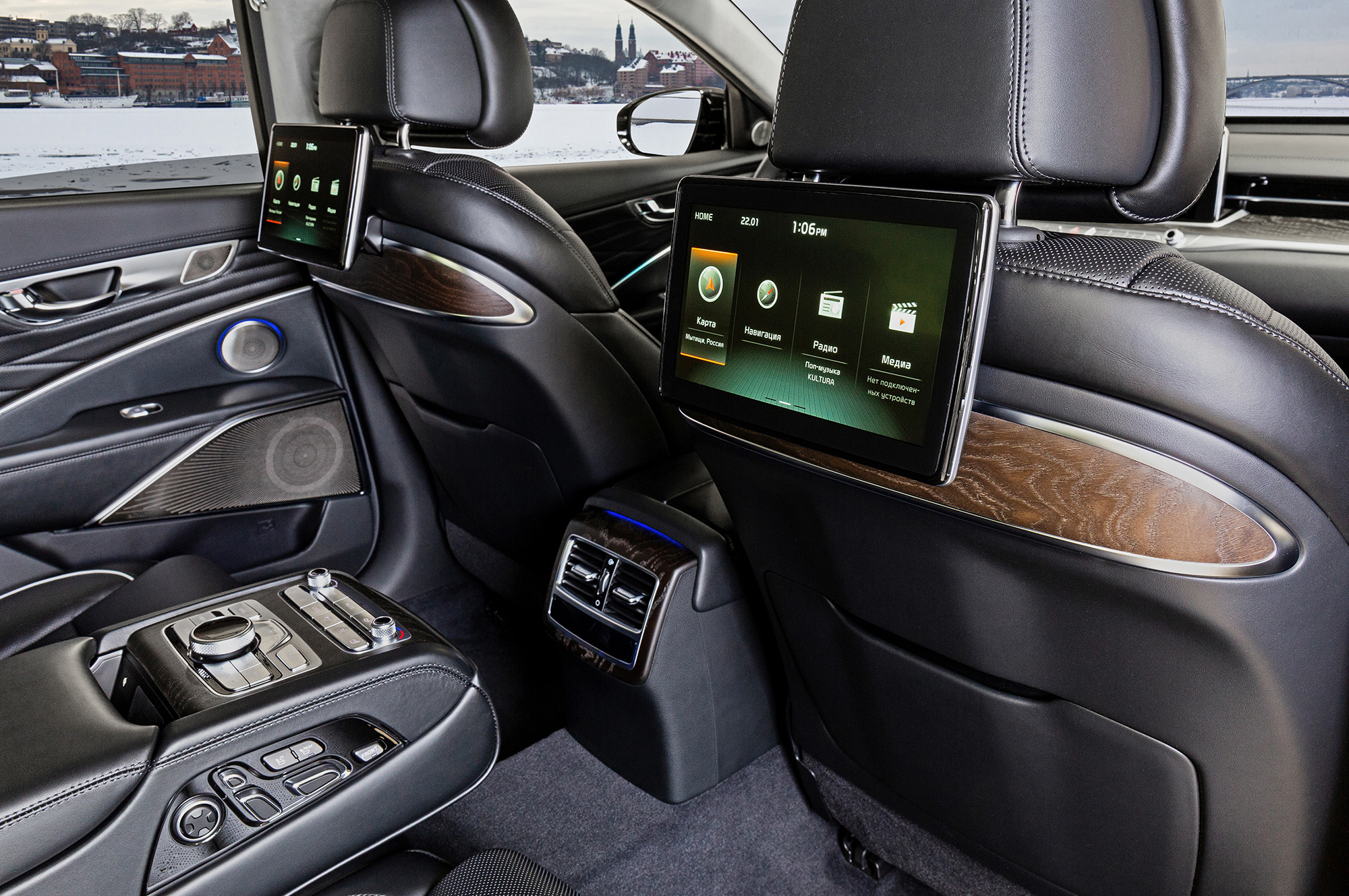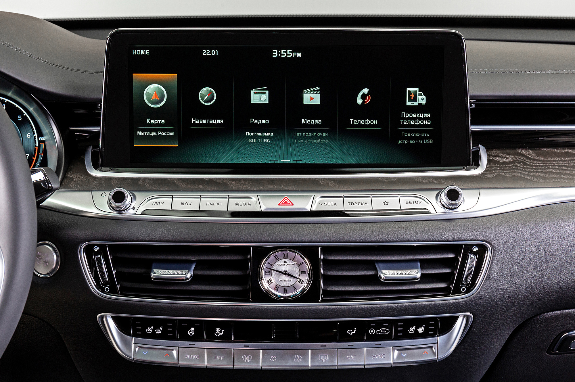 За рулём K900 окажется немало шофёров. Они оценят на редкость мягкую камеру надувного поясничного подпора и подогреваемые валики регулируемой боковой поддержки. Однако за полдня в водительском кресле мне не удалось подобрать подходящую позу. Отчасти в этом виновата спинка, которой не хватает подвижной верхней части, как у задних сидений. Отчасти — подушка с типично корейским диапазоном перемещения от «коротко» до «очень коротко». Тут вообще лучше будут себя чувствовать люди среднего роста. Хотя дотянуться до иконки возврата из меню в дальнем углу протяжённого сенсорного экрана непросто даже с моими длинными руками.