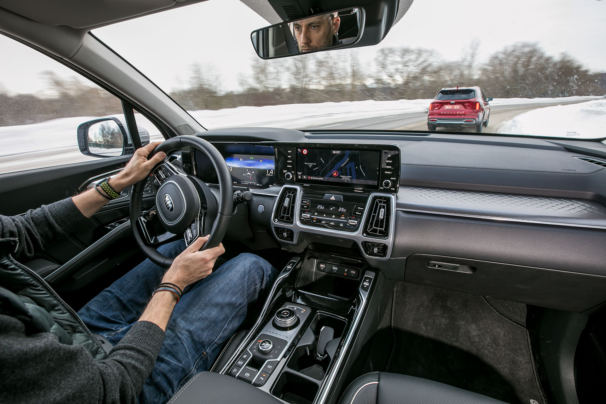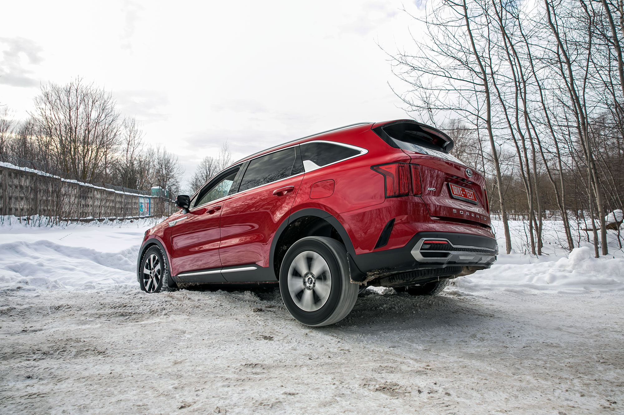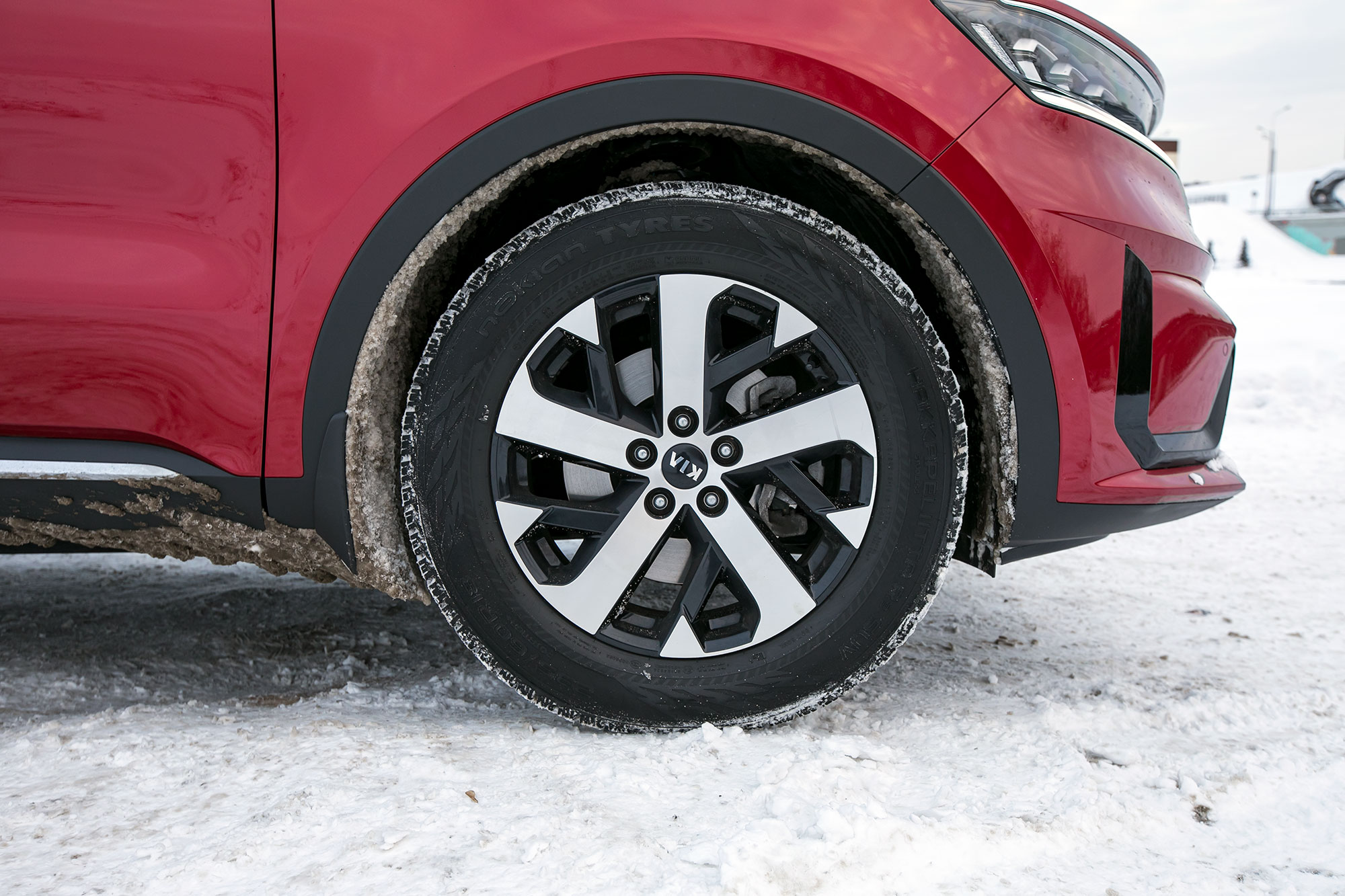 Проблем у дизельного Соренто навскидку две. Во-первых, он комплектуется только колёсами большого диаметра: 19–20 дюймов. В нашем случае серебристая машина обута в шины Nokian Hakkapeliitta R3 SUV размерности 255/40 R20. А подвеску и без того не назвать мягкой: шасси весьма подробно воспроизводит мелкие и средние неровности полотна. Вдобавок шумновато в салоне. Низкопрофильные широкие покрышки и гудят навязчивее, и усугубляют вибрационную картину, даже несмотря на то, что на морозе давление падает на пару десятых относительно предписанных 2,4 атм.