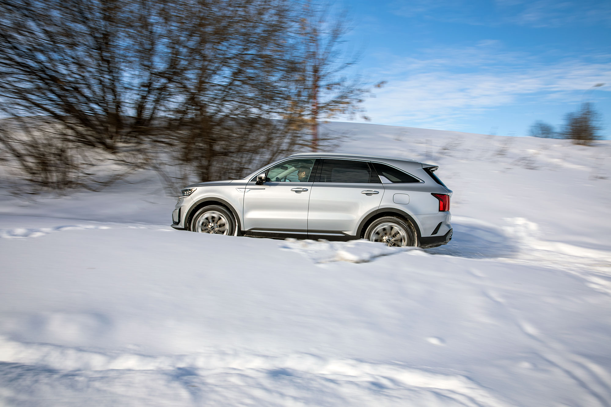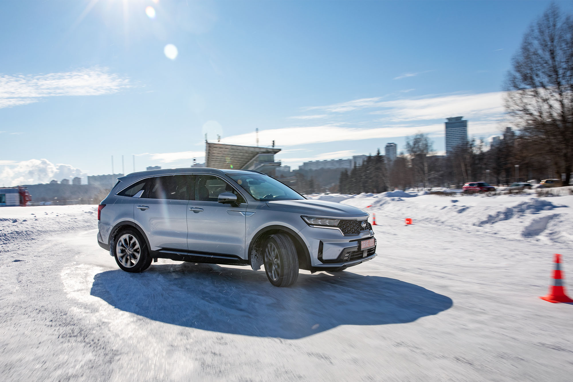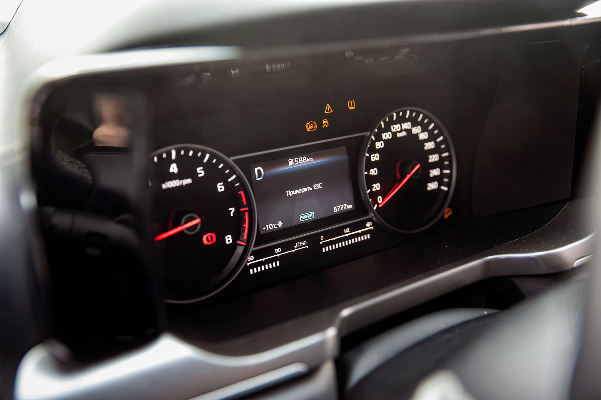 Проблем у дизельного Соренто навскидку две. Во-первых, он комплектуется только колёсами большого диаметра: 19–20 дюймов. В нашем случае серебристая машина обута в шины Nokian Hakkapeliitta R3 SUV размерности 255/40 R20. А подвеску и без того не назвать мягкой: шасси весьма подробно воспроизводит мелкие и средние неровности полотна. Вдобавок шумновато в салоне. Низкопрофильные широкие покрышки и гудят навязчивее, и усугубляют вибрационную картину, даже несмотря на то, что на морозе давление падает на пару десятых относительно предписанных 2,4 атм.