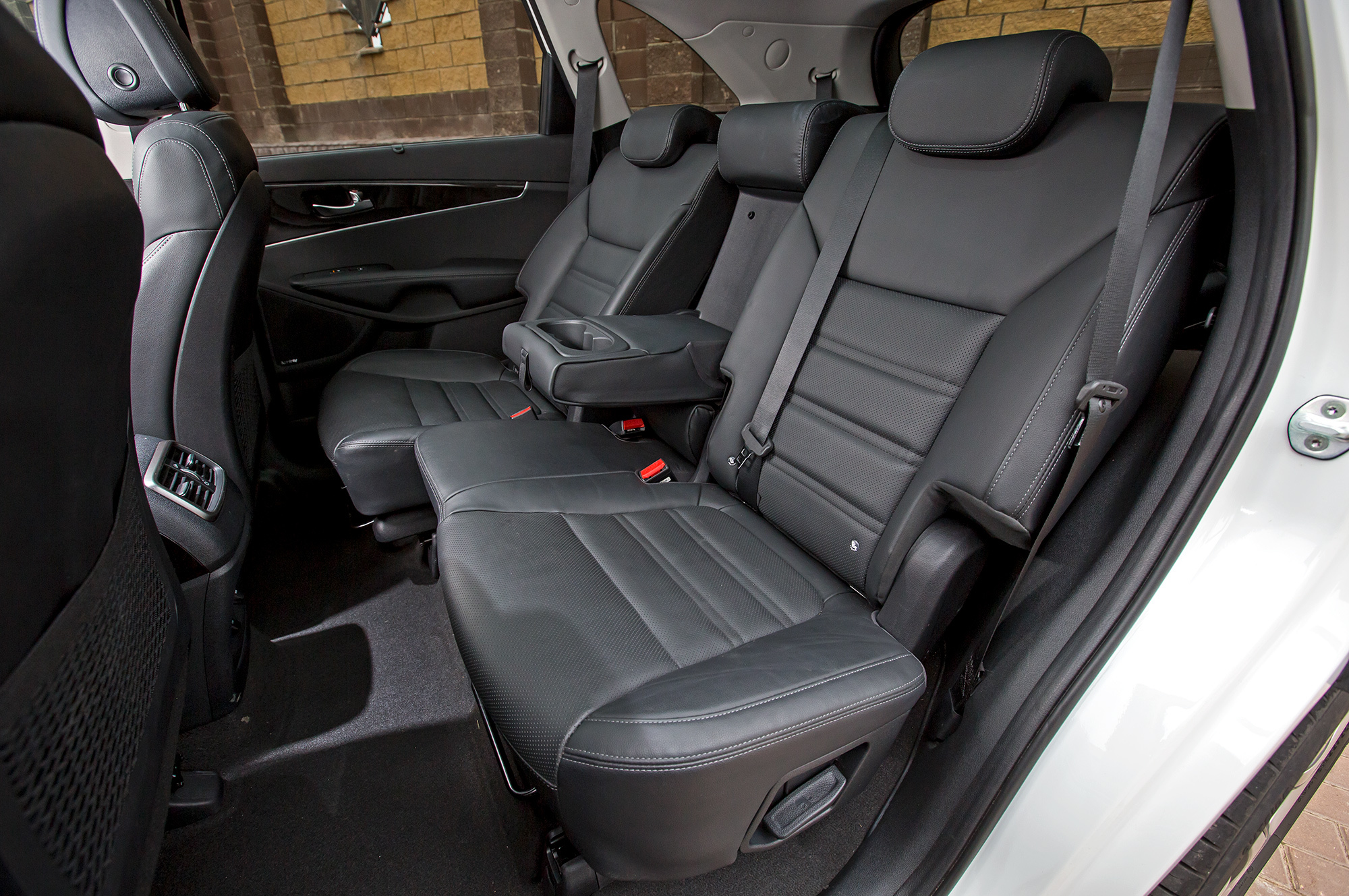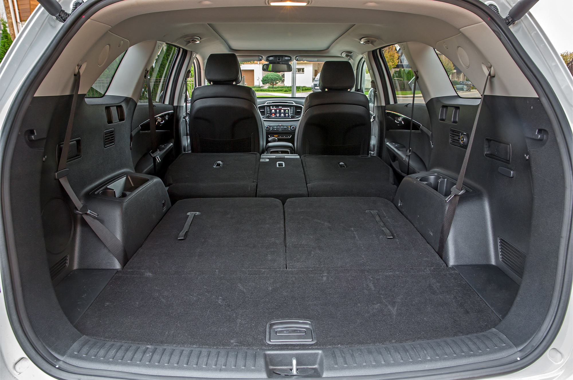 Геометрия посадки на втором ряду Kia удобна и схожа с ниссановской, но запас места в коленях и над головой тут меньше. Центральный тоннель среднему пассажиру здесь тоже не мешает, но сам диван отформован для двоих — втроём тут не так комфортно, как в Murano. Сиденье имеет продольную регулировку, но вся она — в пользу третьего ряда: на втором место в ногах можно только уменьшить. Лаз на галёрку узкий, залезть туда проще, чем выбраться обратно. Сижу враспор, но к недалёкому вояжу готов.