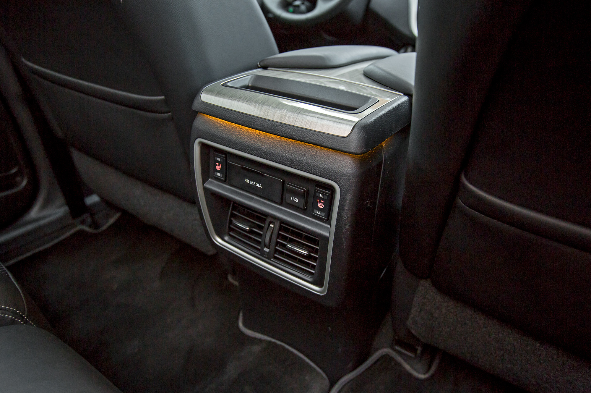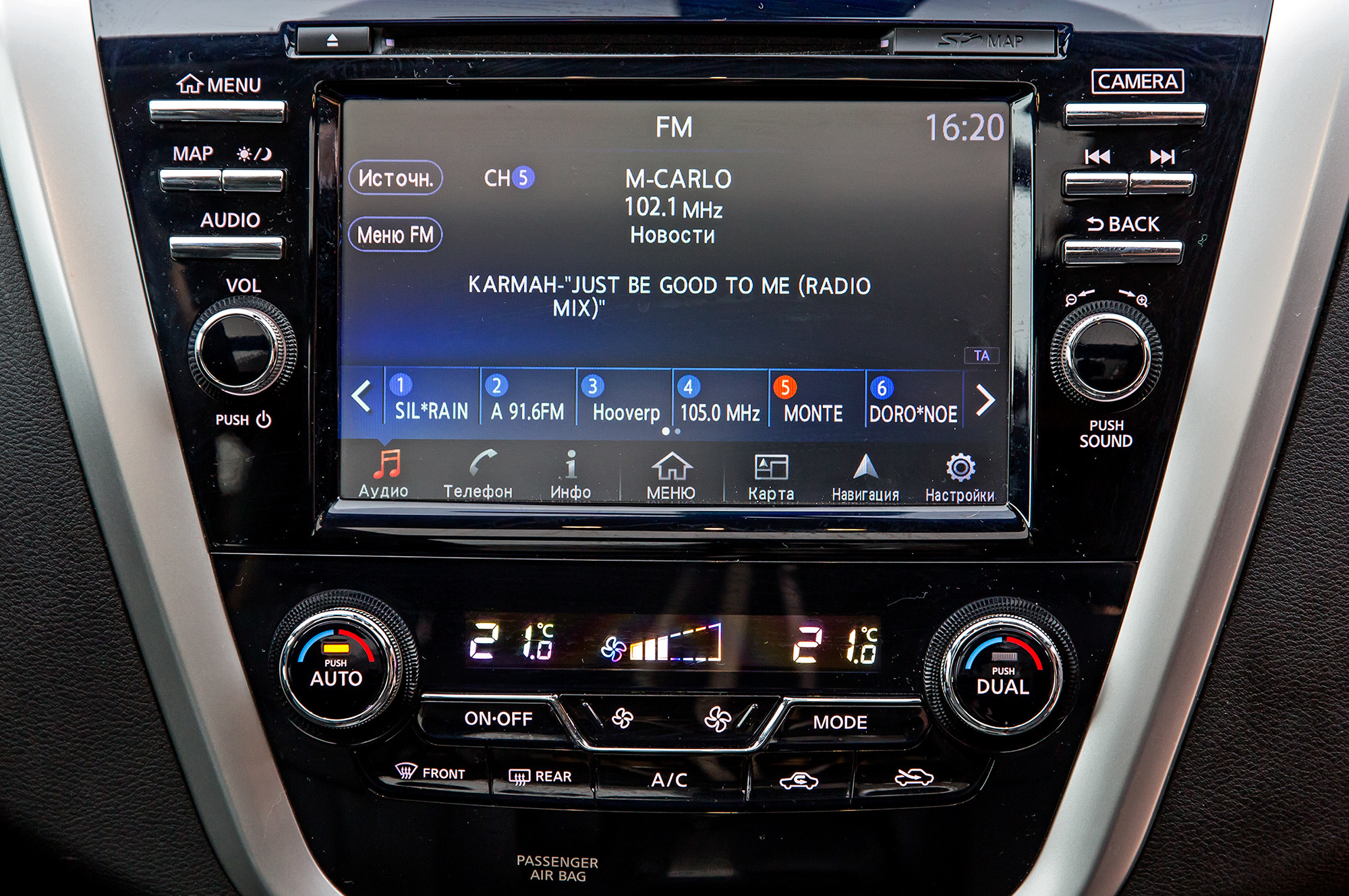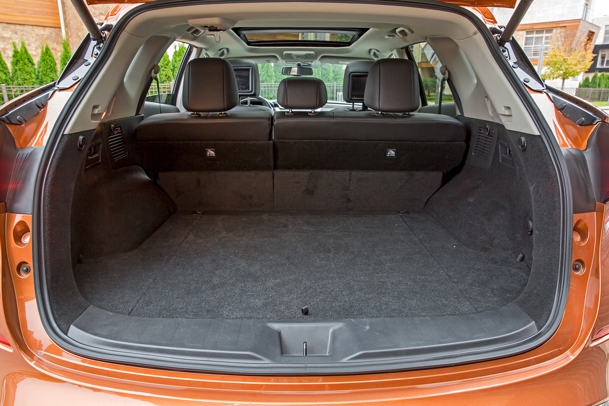 Новый Murano прекрасен вторым рядом — удобный вход-выход и простор, который превосходит ожидания: при росте 176 см плотно разве что в ступнях, а в коленях и над головой места с большим запасом. Напольный тоннель едва заметен, так что втроём усесться тоже не проблема. Из минусов тут разве что неудобные петли-хлястики, с помощью которых изменяется наклон частей спинки, зато в подголовниках передних кресел — пара экранов, а в руках пульт, позволяющий поочередно управлять обоими.