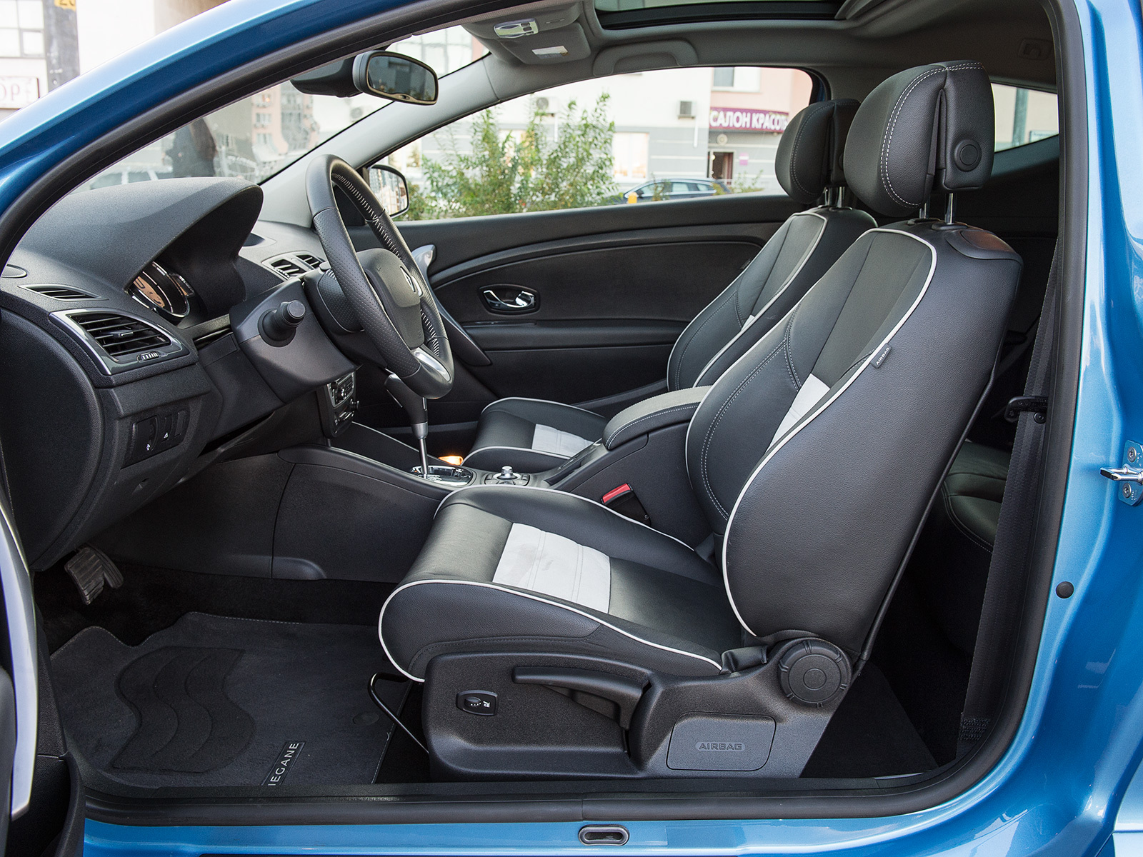 А чем удивил Megane Coupe? Система отпирания дверей здесь ещё более продвинутая, чем у корейской трёхдверки: замки разблокируются сами, едва ты подходишь к автомобилю, а как только отходишь от него на пару метров, тот вновь встаёт на охрану. Но в остальном — увы и ах! Ни тебе привета, ни до свиданья, ни подачи ремня безопасности. Двери Мегана тоже снабжены промежуточными фиксаторами, но сами «калитки» открываются с минимальным усилием. Толкни их чуть сильнее, и они полетят в борт соседней машины. Низкая крыша не только осложняет доступ в салон, но и мешает удобно устроиться за рулём: передние кресла установлены по-городскому высоковато, и я при росте 178 см едва не трусь лбом о противосолнечный козырёк — это панорамная крыша съедает пространство над головой. Сиденье приходится откатывать назад на лишний щелчок, но сама спинка не способствует вертикальной посадке — регулировка ограничена.