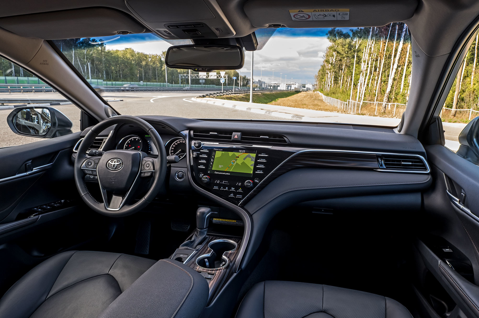 Внутри K5 — гаджет по сравнению и с Оптимой, и с Camry. Крупные десятидюймовые дисплеи да сенсорные панели сочетаются с ручками и кнопками на тоннеле. Архитектура преемственна: доминируют горизонтали, двухуровневая центральная консоль развёрнута к водителю. Пластика передней панели резче, чем в Сонате, но посадка столь же высока. Поза в жестковатом кресле мобилизует, симпатичный руль в уже раскритикованной липкой коже можно близко придвинуть к себе. Материалы в Тойоте не хуже, но фурнитура проще. Удобный салон Camry значительно консервативнее, мультимедийность не развита. Зато сидишь ниже, и мягкое сиденье лучше распределяет нагрузку.