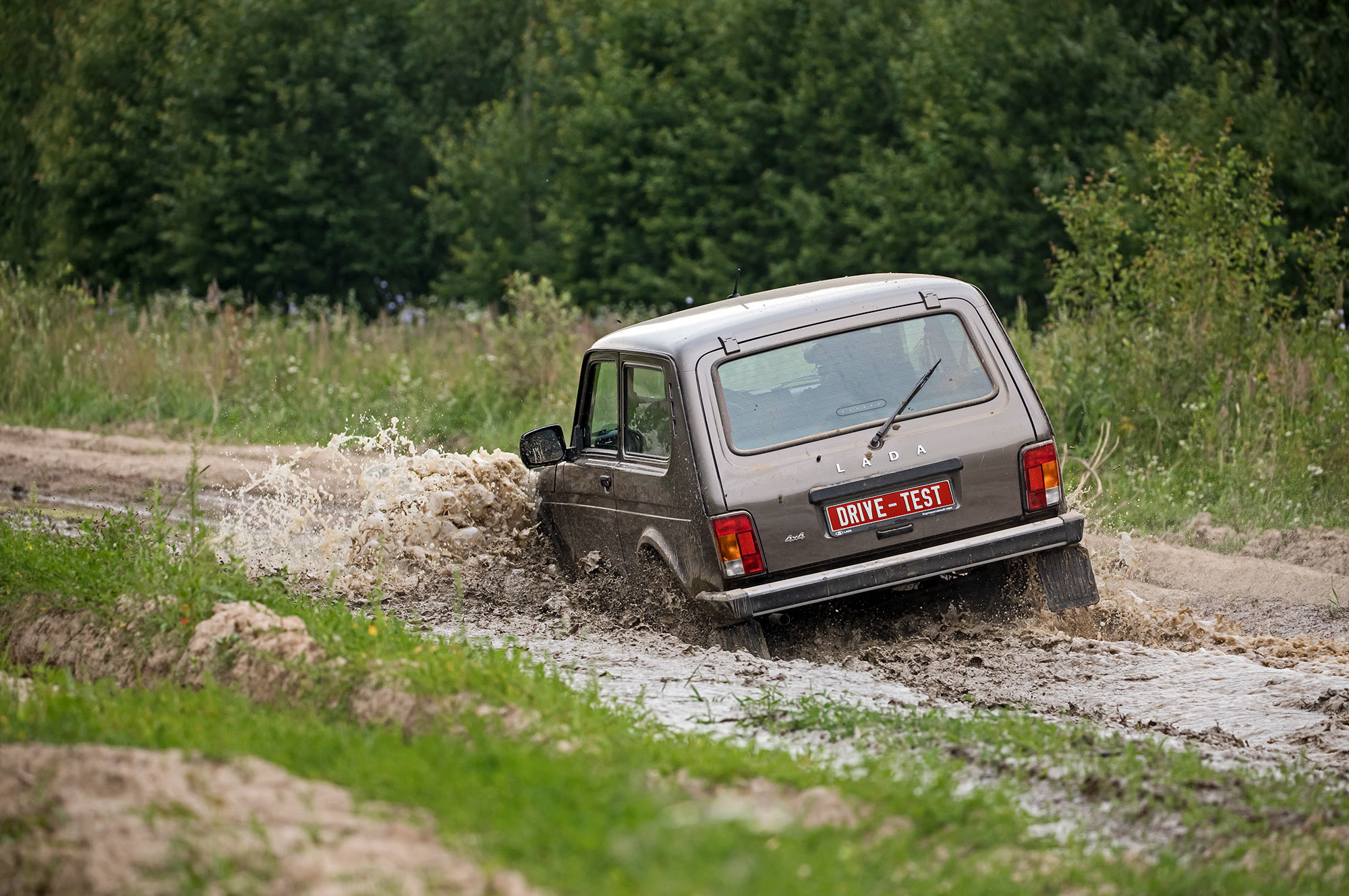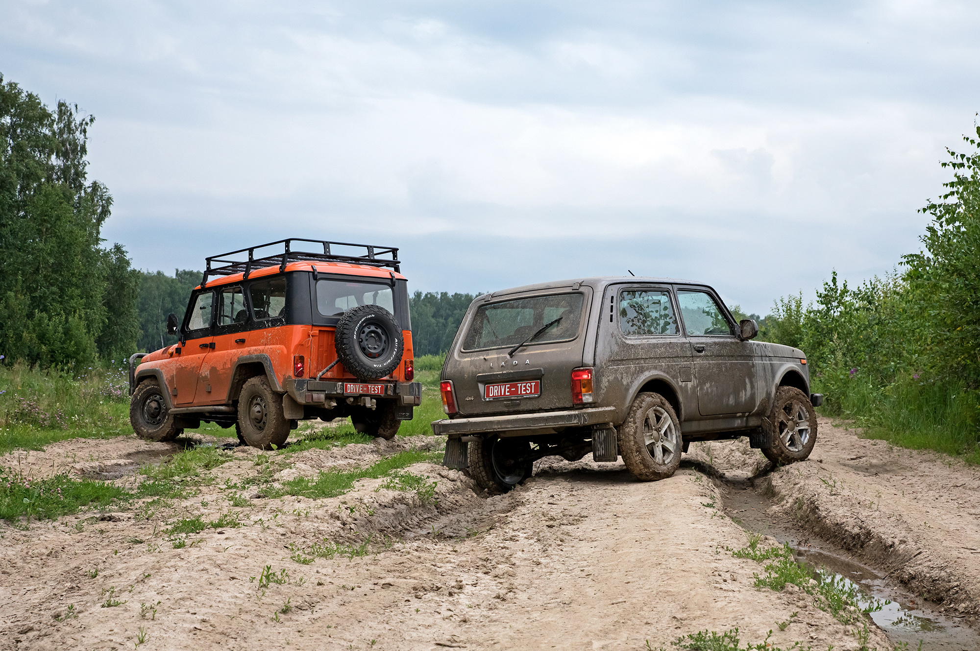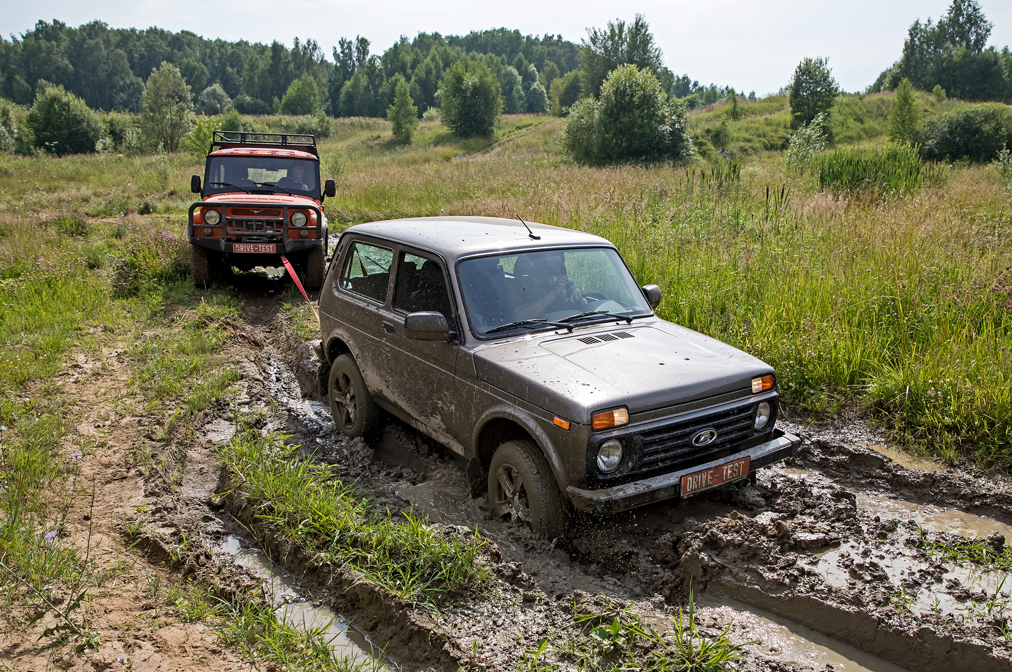 А что Lada? Сидит на пузе. Кроссоверные 20 см под стальной защитой не позволяют следовать по пробитой УАЗом колее. Приходится выбирать пути объезда. Переваливаться через глубокие борозды без контакта с грунтом трёхдверке помогает короткая база. Но в топких местах расстояние между осями наоборот хочется увеличить: так больше шансов, что под одной из них окажется более твёрдая почва. К слову, пятидверная Нива, на мой взгляд, увереннее движется по раскисшим участкам именно благодаря длинной базе.